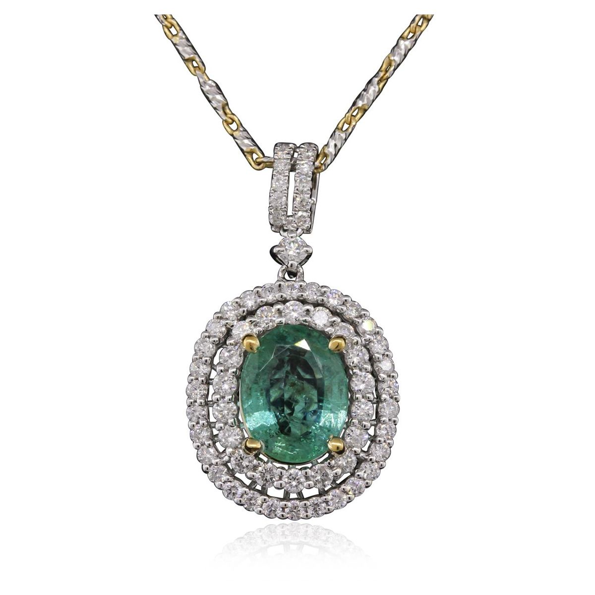 One electronically tested 14KT white and yellow gold Ladies combination cast & assembled pendant & chain 17.5" long, light open cable link with a lobster claw clasp with a bright polish finish. Condition is new. Identified with markings of "14K". Containing: One prong set oval modified mixed cut natural emerald, measuring 9.60 x 7.50 x 3.90mm, exact weight 1.81ct., clarity is moderately included, type III, medium light, very slightly grayish, bluish green color, (GIA bG 4/3), cut is good. Colored gemstones are presumed to have been subjected to commonly used and possible undetectable color/clarity enhancement processes. Forty-Three prong set round brilliant cut diamonds, measuring 1.30 - 1.30 x 0.78mm (depth est.) approximate. Total Weight of 43 Stones = 0.34ct. Clarity: SI-2 to I-1. Color: I - J, Cut is Good. One prong set round brilliant cut diamond, measuring 2.00 - 2.00 x 1.20mm (depth est.) approximate weight of 0.03ct. Clarity: SI-1. Color: I, Cut is Good. Eighteen prong set round brilliant cut diamonds, measuring 1.50 - 1.50 x 0.90mm (depth est.) approximate. Total Weight of 18 Stones = 0.50ct. Clarity: SI-1 to SI-2. Color: H, Cut is Good. Total Weight of Colored Stones 1.81ct. Total Weight of Diamonds 0.87ct. Total Weight of Pendant & Chain 7.00 grams. GGL Appraised at $9,245.00.