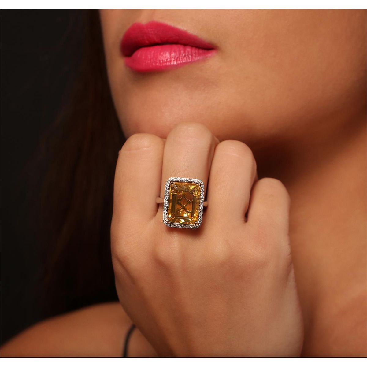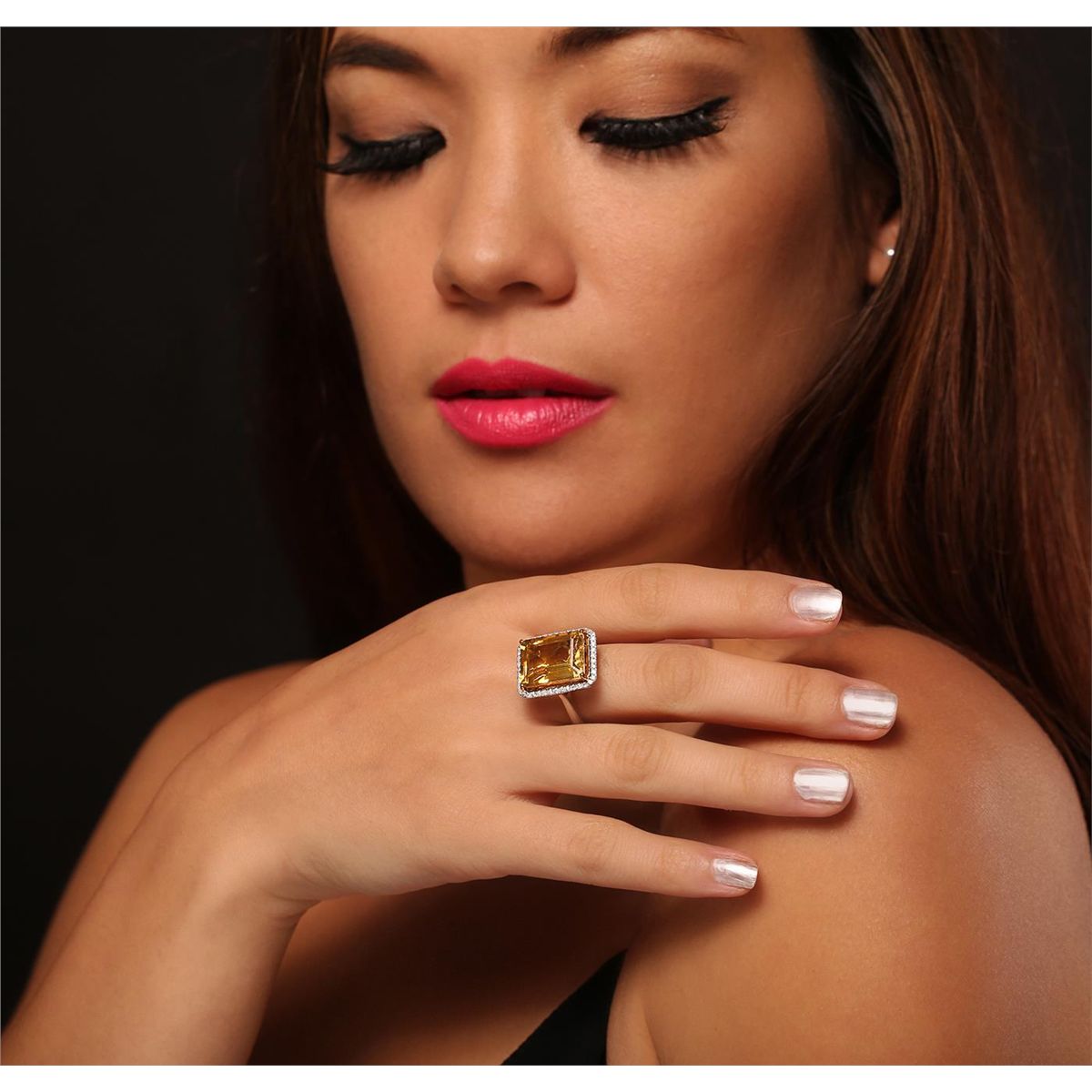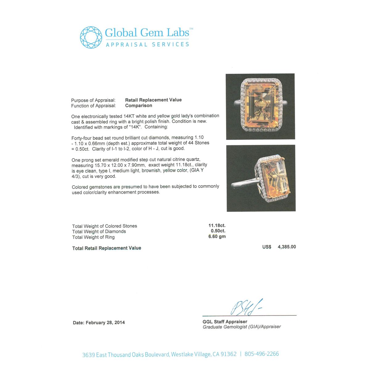 One electronically tested 14KT white and yellow gold Ladies combination cast & assembled ring with a bright polish finish. Condition is new. Identified with markings of "14K". Containing: Forty-Four bead set round brilliant cut diamonds, measuring 1.10 - 1.10 x 0.66mm (depth est.) approximate. Total Weight of 44 Stones = 0.50ct. Clarity: I-1 to I-2. Color: H - J, Cut is Good. One prong set emerald modified step cut natural citrine quartz, measuring 15.70 x 12.00 x 7.90mm, exact weight 11.18ct., clarity is eye clean, type I, medium light, brownish, yellow color, (GIA Y 4/3), cut is very good. Colored gemstones are presumed to have been subjected to commonly used color/clarity enhancement processes. Total Weight of Colored Stones 11.18ct. Total Weight of Diamonds 0.50ct. Total Weight of Ring 6.60 grams. GGL Appraised at $4,385.00.