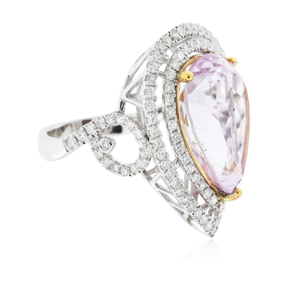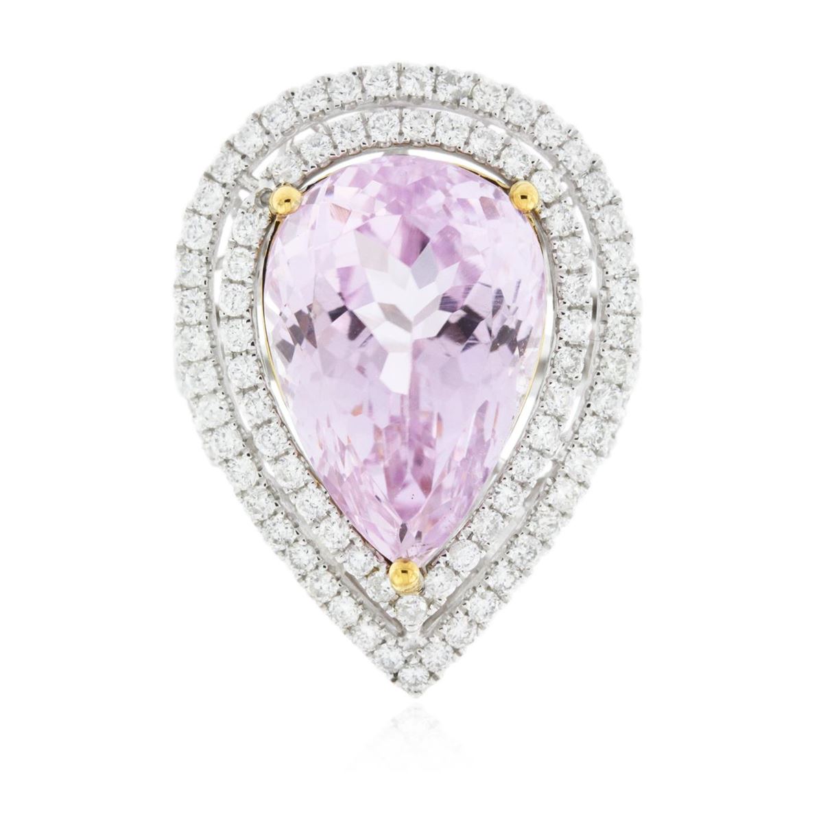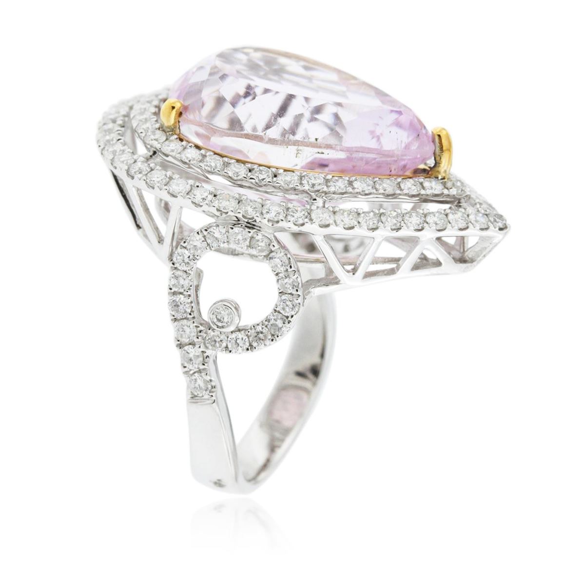 One electronically tested 14KT white and yellow gold Ladies combination cast & assembled ring with a bright polish finish. Condition is new. Identified with markings of "14K". Containing: One Hundred Sixteen prong set round brilliant cut diamonds, measuring 1.40 - 1.40 x 0.84mm (depth est.) approximate. Total Weight of 116 Stones = 1.53ct. Clarity: I-1 to I-2. Color: I - J, Cut is Good. One prong set pear modified brilliant cut natural kunzite, measuring 18.00 x 12.00 x 9.30mm, approximate weight of 12.79ct., clarity is eye clean, type I, medium light, slightly grayish, purple color, (GIA P 4/2), cut is very good. Colored gemstones are presumed to have been subjected to commonly used color/clarity enhancement processes. Total Weight of Colored Stones 12.79ct. Total Weight of Diamonds 1.53ct. Total Weight of Ring 9.20 grams. GGL Appraised at $12,160.00.
