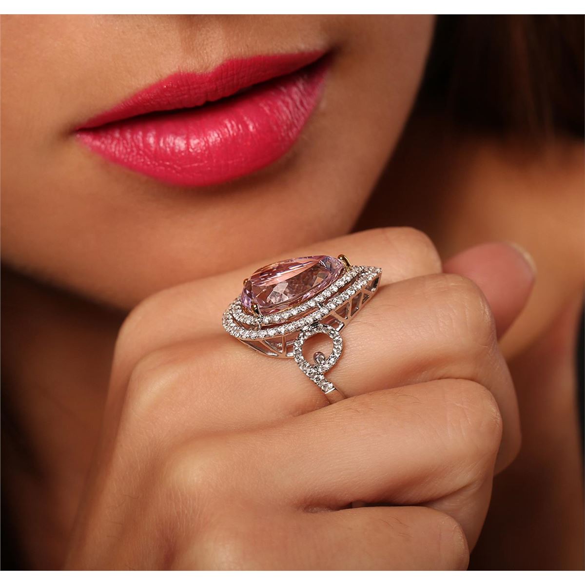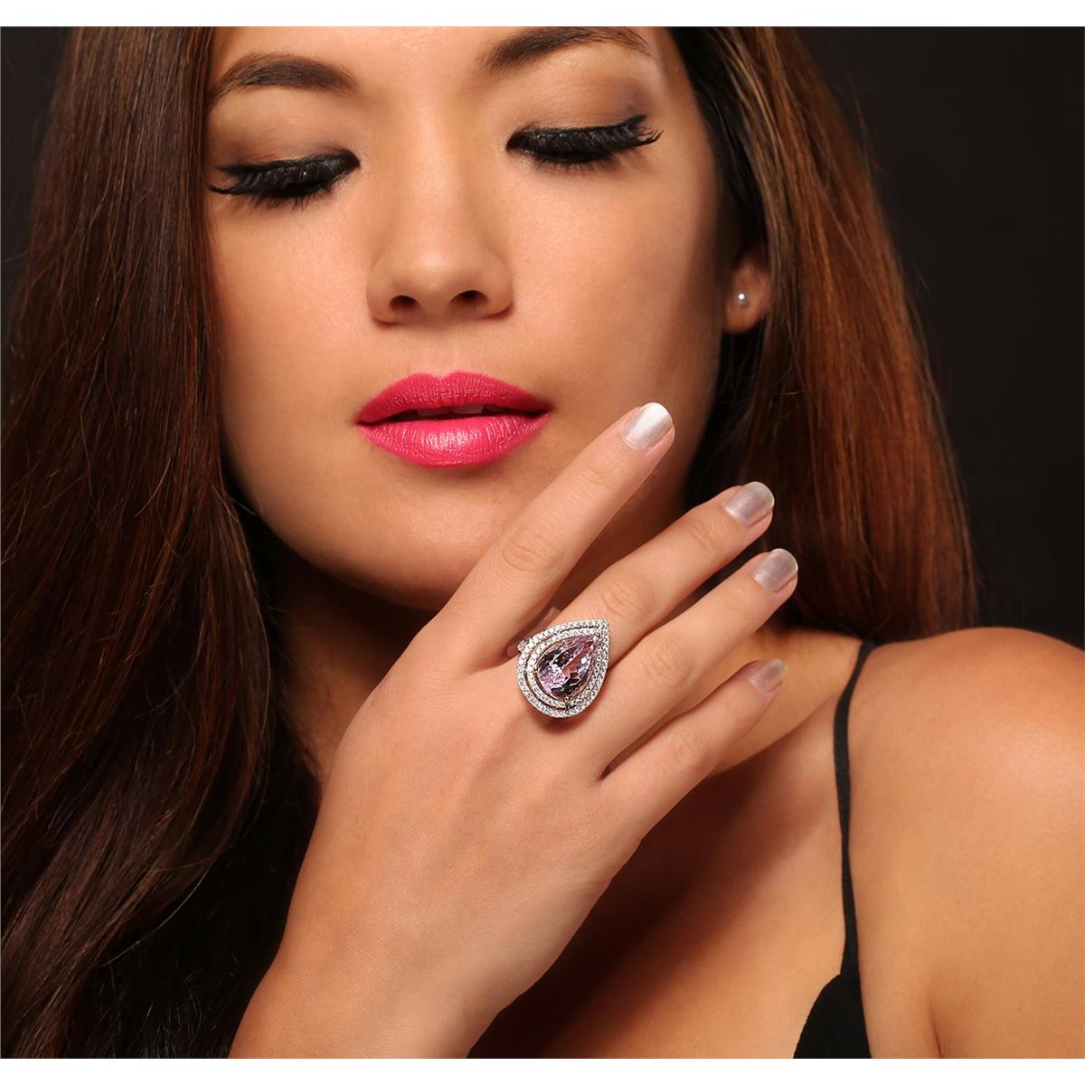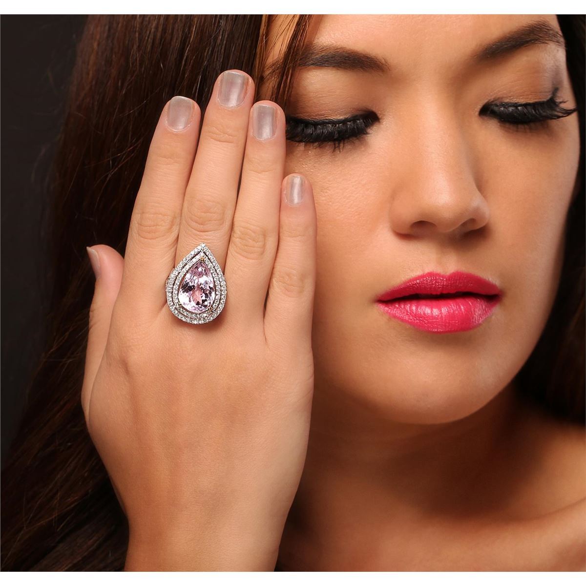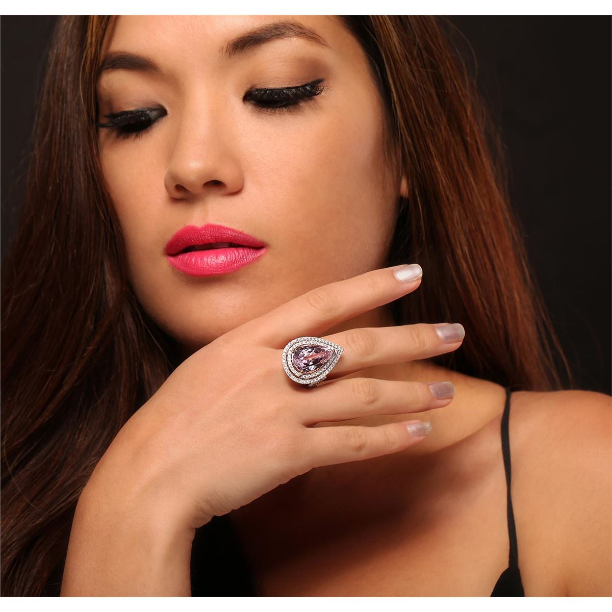 One electronically tested 14KT white and yellow gold Ladies combination cast & assembled ring with a bright polish finish. Condition is new. Identified with markings of "14K". Containing: One Hundred Sixteen prong set round brilliant cut diamonds, measuring 1.40 - 1.40 x 0.84mm (depth est.) approximate. Total Weight of 116 Stones = 1.53ct. Clarity: I-1 to I-2. Color: I - J, Cut is Good. One prong set pear modified brilliant cut natural kunzite, measuring 18.00 x 12.00 x 9.30mm, approximate weight of 12.79ct., clarity is eye clean, type I, medium light, slightly grayish, purple color, (GIA P 4/2), cut is very good. Colored gemstones are presumed to have been subjected to commonly used color/clarity enhancement processes. Total Weight of Colored Stones 12.79ct. Total Weight of Diamonds 1.53ct. Total Weight of Ring 9.20 grams. GGL Appraised at $12,160.00.