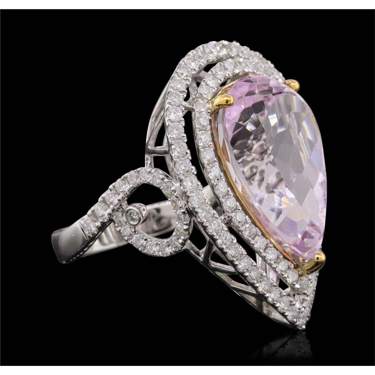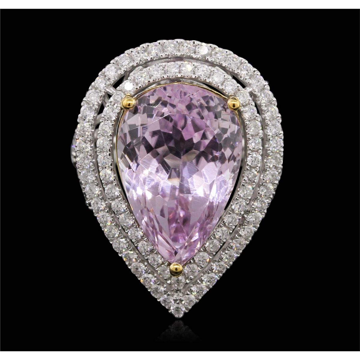One electronically tested 14KT white and yellow gold Ladies combination cast & assembled ring with a bright polish finish. Condition is new. Identified with markings of "14K". Containing: One Hundred Sixteen prong set round brilliant cut diamonds, measuring 1.40 - 1.40 x 0.84mm (depth est.) approximate. Total Weight of 116 Stones = 1.53ct. Clarity: I-1 to I-2. Color: I - J, Cut is Good. One prong set pear modified brilliant cut natural kunzite, measuring 18.00 x 12.00 x 9.30mm, approximate weight of 12.79ct., clarity is eye clean, type I, medium light, slightly grayish, purple color, (GIA P 4/2), cut is very good. Colored gemstones are presumed to have been subjected to commonly used color/clarity enhancement processes. Total Weight of Colored Stones 12.79ct. Total Weight of Diamonds 1.53ct. Total Weight of Ring 9.20 grams. GGL Appraised at $12,160.00.