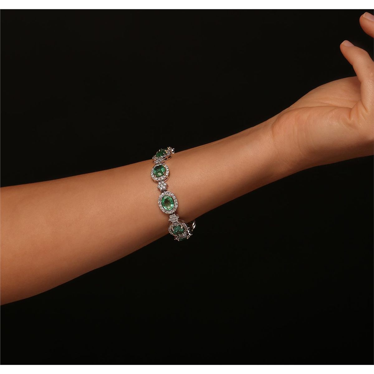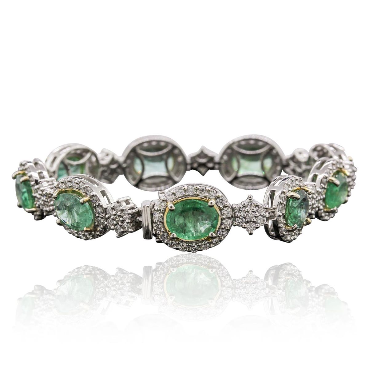 One electronically tested 14KT white and yellow gold Ladies combination cast & assembled bracelet with a hidden box clasp with a bright polish finish. Condition is new. Measurements: 7.25" in length. Identified with markings of "14K". Containing: Nine prong set oval modified mixed cut natural emeralds, measuring 9.00 x 6.80 x 3.70mm, approximate. Total Weight of 13.95ct., clarity is moderately included, type III, medium light, very slightly grayish, very slightly bluish green color, (GIA vslbG 4/3), cut is good. Colored gemstones are presumed to have been subjected to commonly used and possible undetectable color/clarity enhancement processes. Two Hundred Twenty-Five prong set round brilliant cut diamonds, measuring 1.80 - 1.80 x 1.08mm (depth est.) approximate. Total Weight of 225 Stones = 5.08ct. Clarity: SI-2 to I-1. Color: G - H, Cut is Good. Total Weight of Colored Stones 13.95ct. Total Weight of Diamonds 5.08ct. Total Weight of Bracelet 28.60 grams. GGL Appraised at $49,550.00.