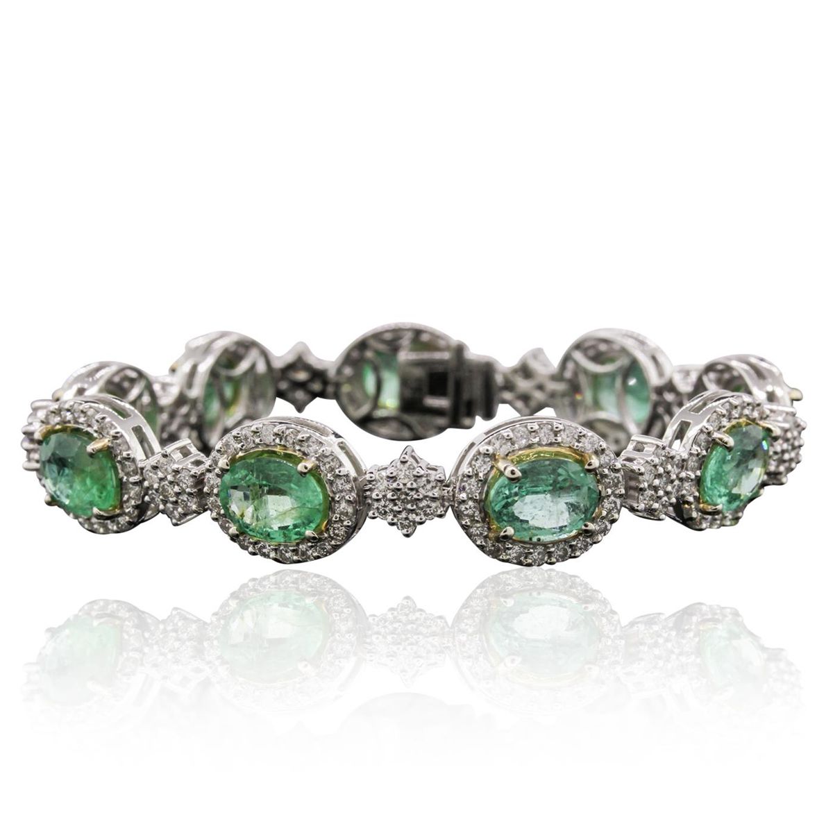 One electronically tested 14KT white and yellow gold Ladies combination cast & assembled bracelet with a hidden box clasp with a bright polish finish. Condition is new. Measurements: 7.25" in length. Identified with markings of "14K". Containing: Nine prong set oval modified mixed cut natural emeralds, measuring 9.00 x 6.80 x 3.70mm, approximate. Total Weight of 13.95ct., clarity is moderately included, type III, medium light, very slightly grayish, very slightly bluish green color, (GIA vslbG 4/3), cut is good. Colored gemstones are presumed to have been subjected to commonly used and possible undetectable color/clarity enhancement processes. Two Hundred Twenty-Five prong set round brilliant cut diamonds, measuring 1.80 - 1.80 x 1.08mm (depth est.) approximate. Total Weight of 225 Stones = 5.08ct. Clarity: SI-2 to I-1. Color: G - H, Cut is Good. Total Weight of Colored Stones 13.95ct. Total Weight of Diamonds 5.08ct. Total Weight of Bracelet 28.60 grams. GGL Appraised at $49,550.00.