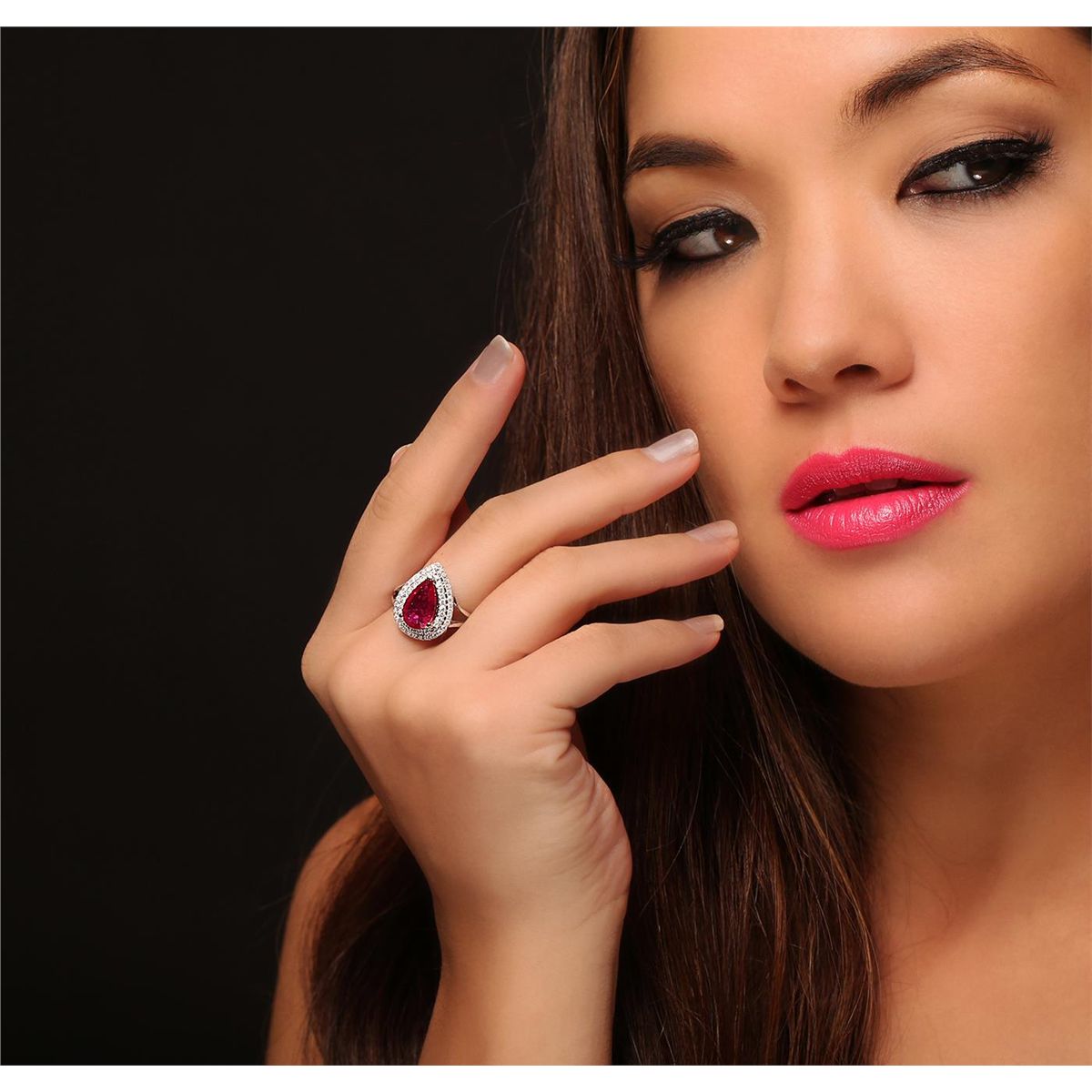 One electronically tested 14KT white and yellow gold Ladies combination cast & assembled ring with a bright polish finish. Condition is new. Identified with markings of "14K". Containing: Fifty-Nine prong set round brilliant cut diamonds, measuring 1.20 - 1.20 x 0.72mm (depth est.) approximate. Total Weight of 59 Stones = 0.53ct. Clarity: I-1 to I-2. Color: H - J, Cut is Good. One prong set pear modified brilliant cut natural ruby, measuring 12.00 x 7.00 x 4.55mm, approximate weight of 2.26ct., clarity is heavily included, type II, cut is good. Colored gemstones are presumed to have been subjected to commonly used color/clarity enhancement processes. Total Weight of Colored Stones 2.26ct. Total Weight of Diamonds 0.53ct. Total Weight of Ring 5.10 grams. GGL Appraised at $4,805.00.