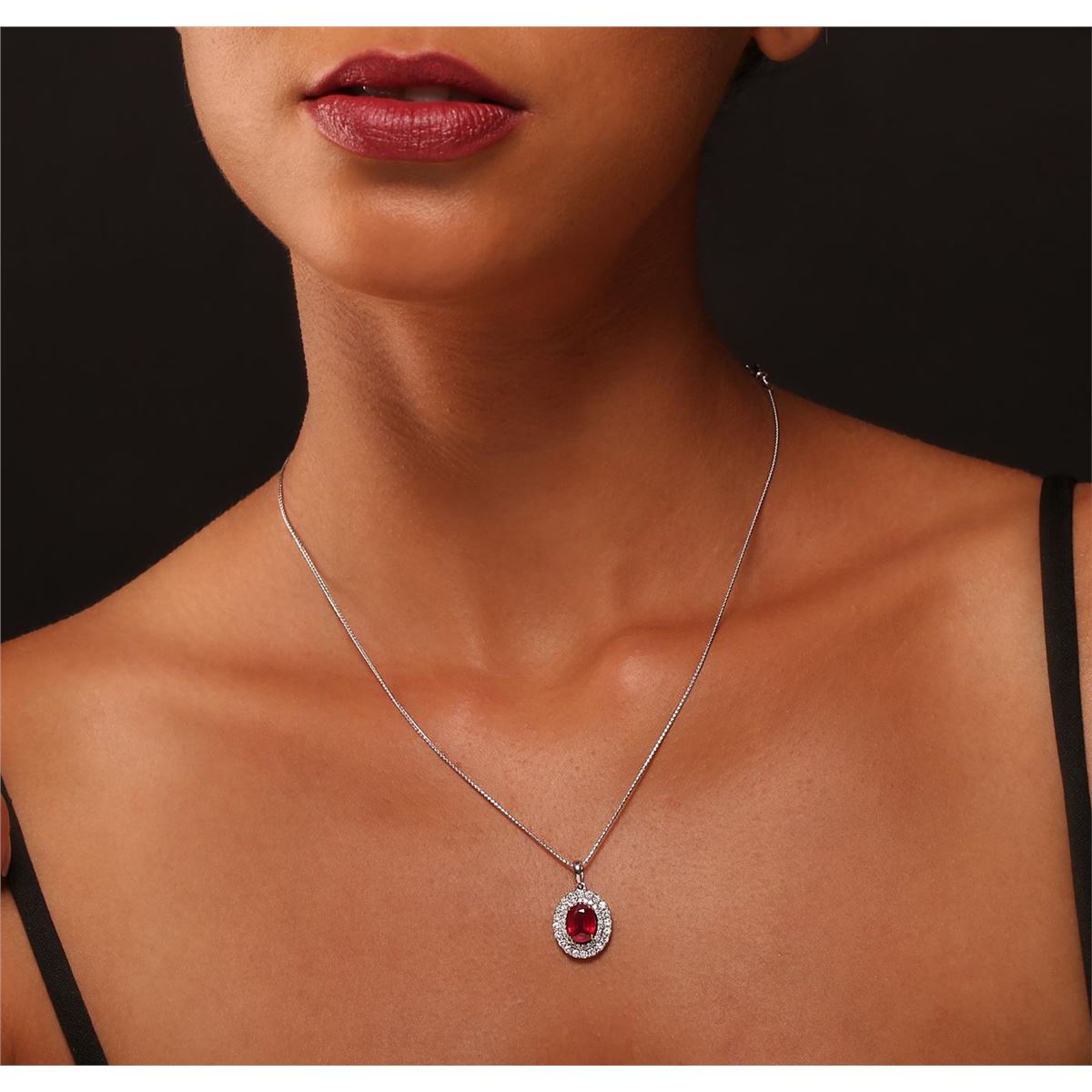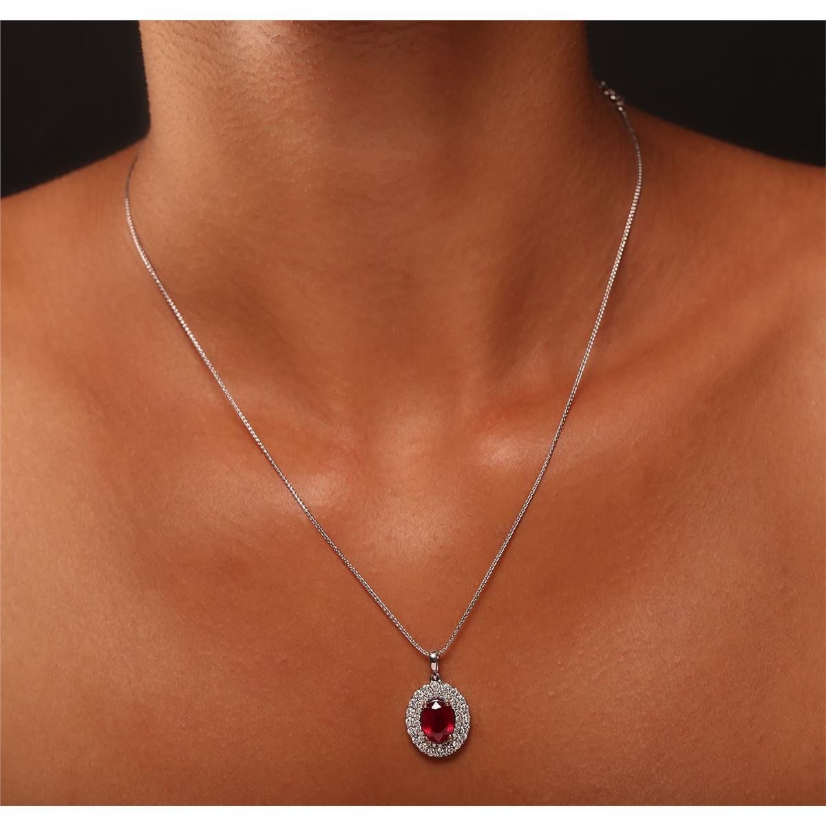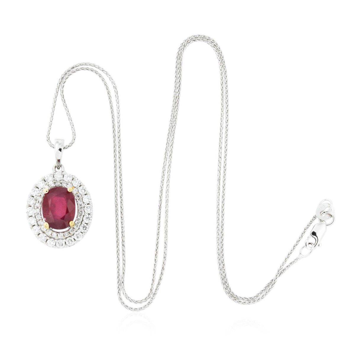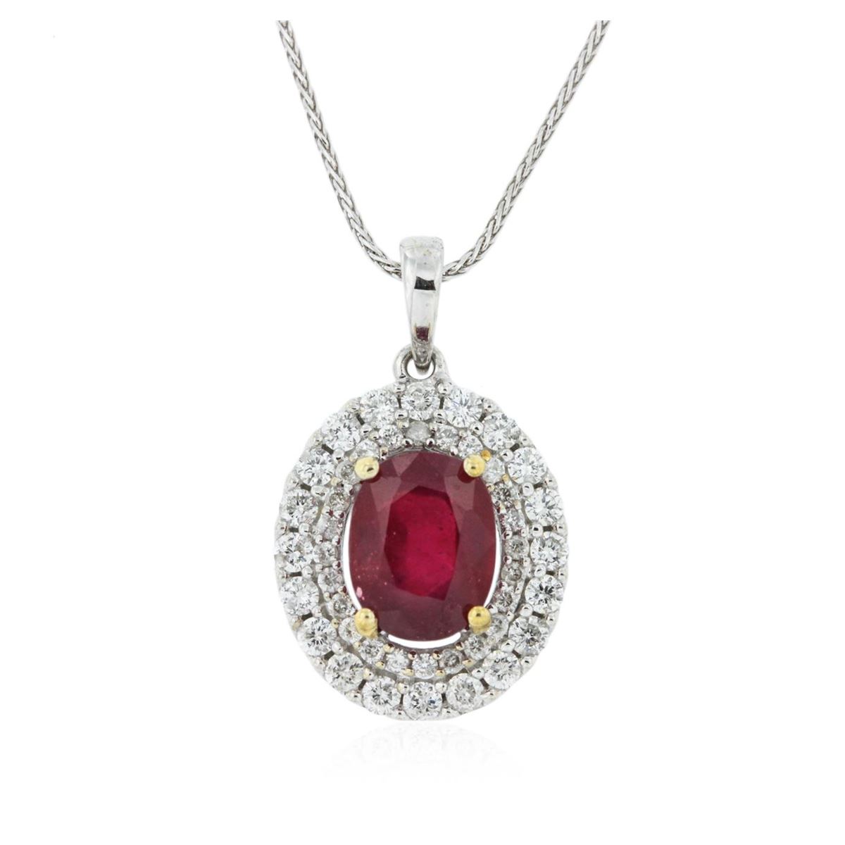 One electronically tested 14KT white and yellow gold Ladies combination cast & assembled pendant with a bright polish finish. Condition is new. Identified with markings of "14K". Containing: One prong set oval modified brilliant cut natural ruby, measuring 8.50 x 6.80 x 4.75mm, exact weight 2.56ct., clarity is heavily included, type II, medium dark, moderately strong, strongly purplish red color, (GIA stpR 6/4), cut is good. Colored gemstones are presumed to have been subjected to commonly used color/clarity enhancement processes. Twenty-Four bead set round brilliant cut diamonds, measuring 1.00 - 1.00 x 0.60mm (depth est.) approximate. Total Weight of 24 Stones = 0.09ct. Clarity: I-1 to I-2. Color: G - H, Cut is Good. Twenty prong set round brilliant cut diamonds, measuring 1.70 - 1.70 x 1.02mm (depth est.) approximate. Total Weight of 20 Stones = 0.69ct. Clarity: SI-1 to I-1. Color: G - H, Cut is Good. Total Weight of Colored Stones 2.56ct. Total Weight of Diamonds 0.78ct. Total Weight of Pendant 4.90 grams. GGL Appraised at $5,375.00.