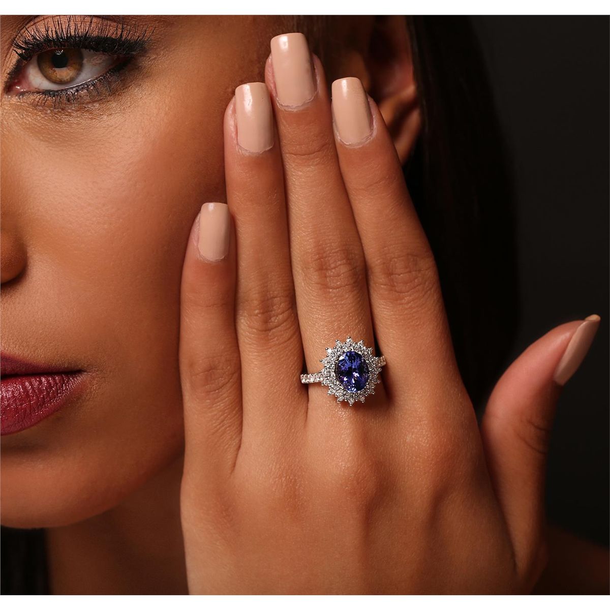 One electronically tested 14KT white and yellow gold Ladies combination cast & assembled ring with a bright polish finish. Condition is new. Identified with markings of "14K". Containing: One prong set oval modified brilliant cut natural tanzanite, measuring 10.10 x 7.50 x 4.88mm, exact weight 2.83ct., clarity is eye clean, type I, medium, very slightly grayish, bluish violet color, (GIA bV 5/3), cut is very good. Colored gemstones are presumed to have been subjected to commonly used color/clarity enhancement processes. Twenty-Six prong set round brilliant cut diamonds, measuring 2.00 - 2.00 x 1.20mm (depth est.) approximate. Total Weight of 26 Stones = 0.89ct. Clarity: SI-1 to I-1. Color: H - I, Cut is Good. Sixteen prong set round brilliant cut diamonds, measuring 1.50 - 1.50 x 0.90mm (depth est.) approximate. Total Weight of 16 Stones = 0.24ct. Clarity: I-1 to I-2. Color: I - J, Cut is Good. Total Weight of Colored Stones 2.83ct. Total Weight of Diamonds 1.13ct. Total Weight of Ring 6.10 grams. GGL Appraised at $8,585.00.