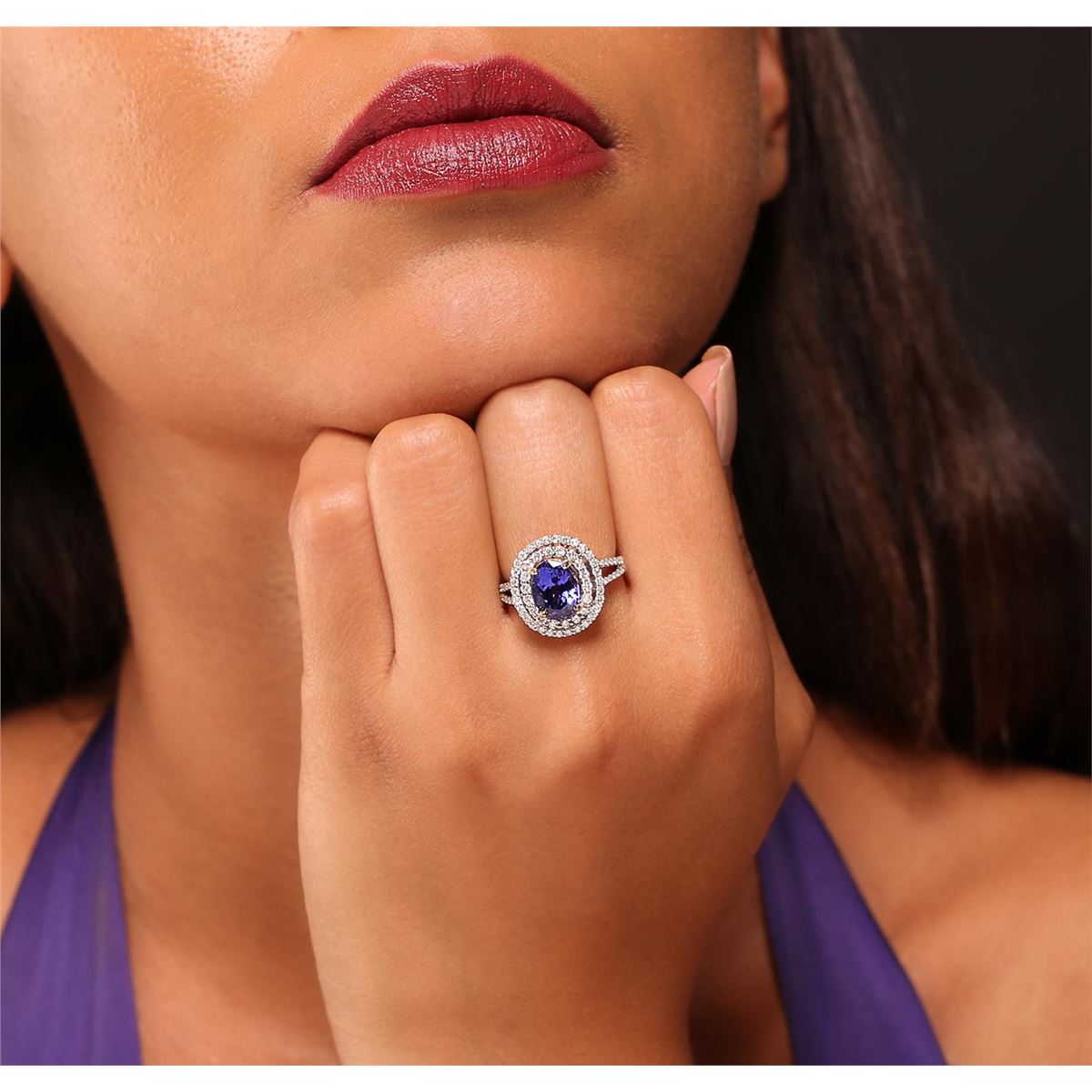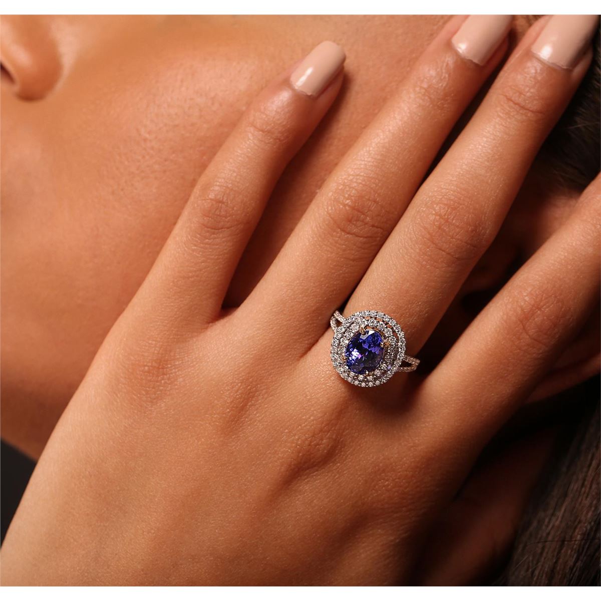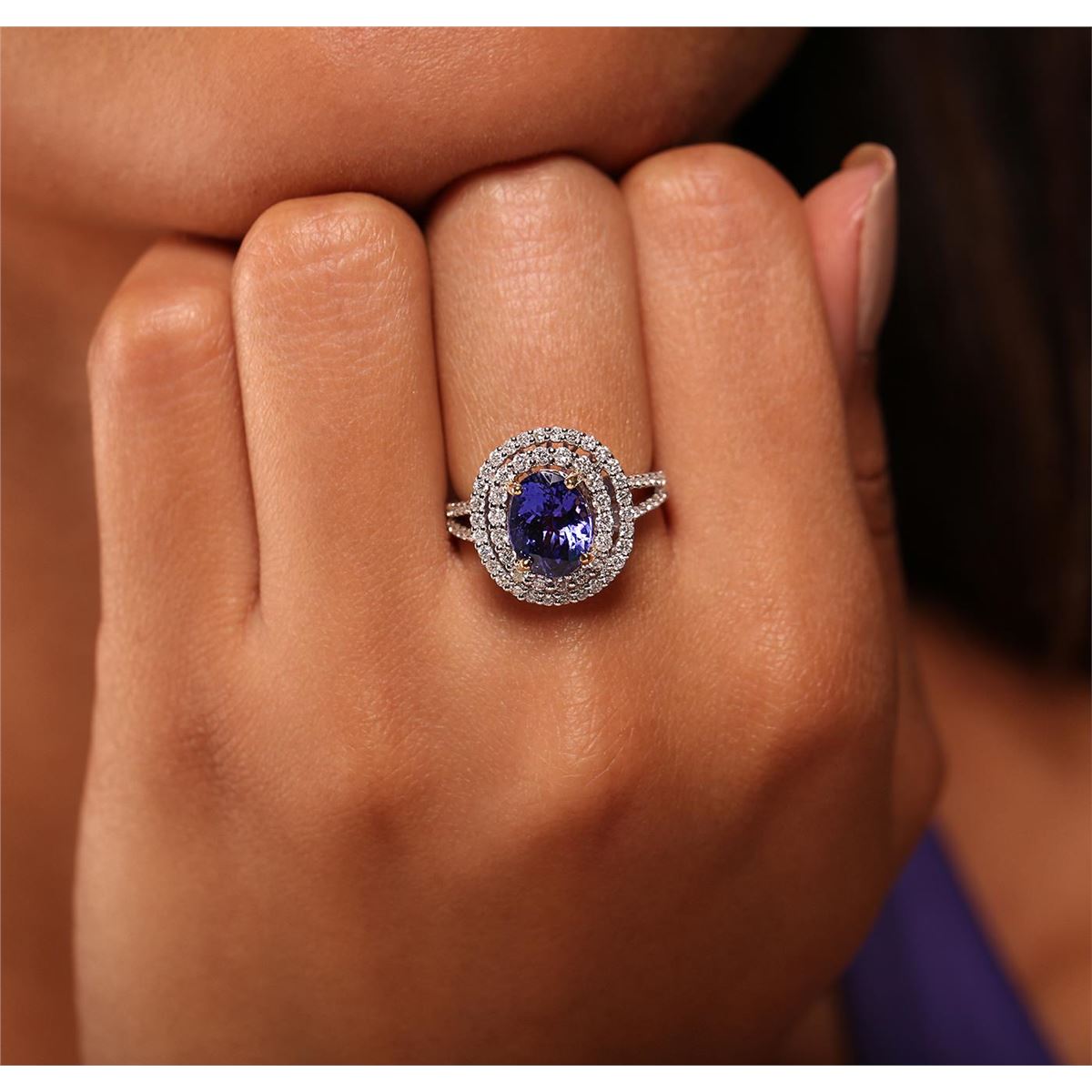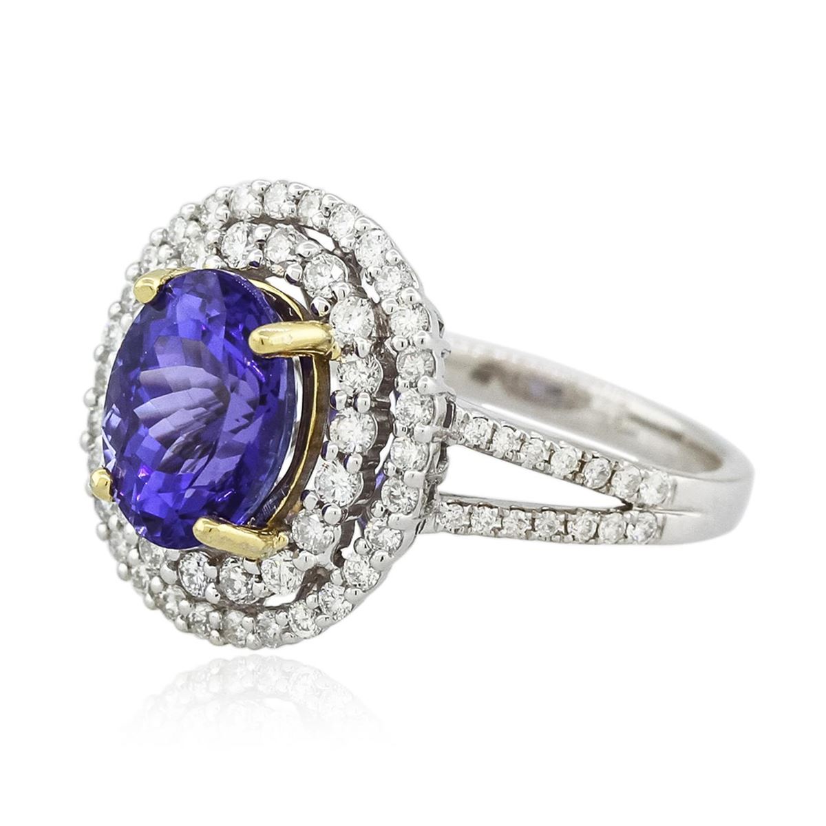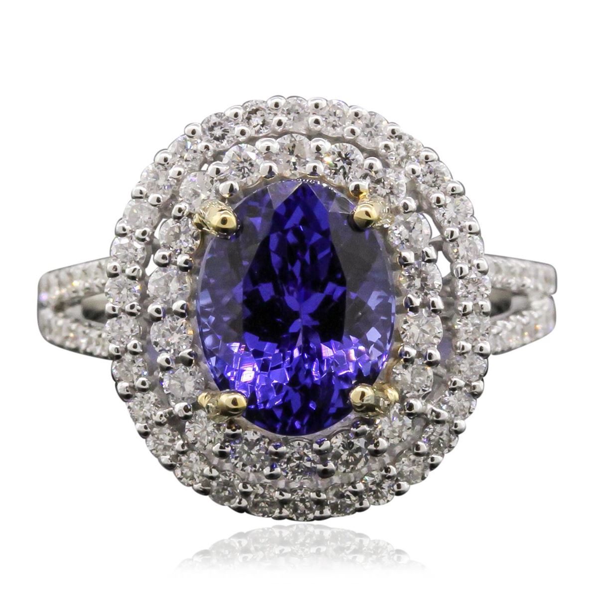 One electronically tested 14KT white and yellow gold Ladies combination cast & assembled ring with a bright polish finish. Condition is new. Identified with markings of "14K". Containing: One prong set oval modified brilliant cut natural tanzanite, measuring 9.80 x 7.60 x 4.94mm, exact weight 3.20ct., clarity is eye clean, type I, medium, moderately strong, bluish violet color, (GIA bV 5/4), cut is very good. Colored gemstones are presumed to have been subjected to commonly used color/clarity enhancement processes. Fifty-Eight prong set round brilliant cut diamonds, measuring 1.10 - 1.10 x 0.66mm (depth est.) approximate. Total Weight of 58 Stones = 0.49ct. Clarity: I-1 to I-2. Color: I - J, Cut is Good. Eighteen prong set round brilliant cut diamonds, measuring 1.50 - 1.50 x 0.90mm (depth est.) approximate. Total Weight of 18 Stones = 0.50ct. Clarity: I-1 to I-2. Color: I - J, Cut is Good.. Total Weight of Colored Stones 3.20ct. Total Weight of Diamonds 0.99ct. Total Weight of Ring 5.60 grams. GGL Appraised at $7,400.00.