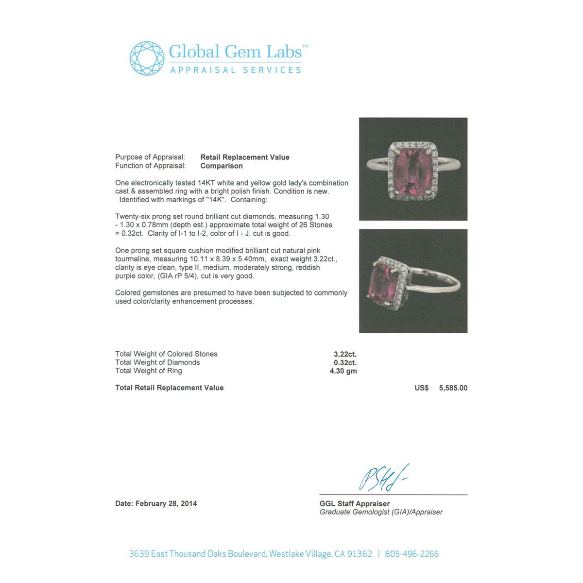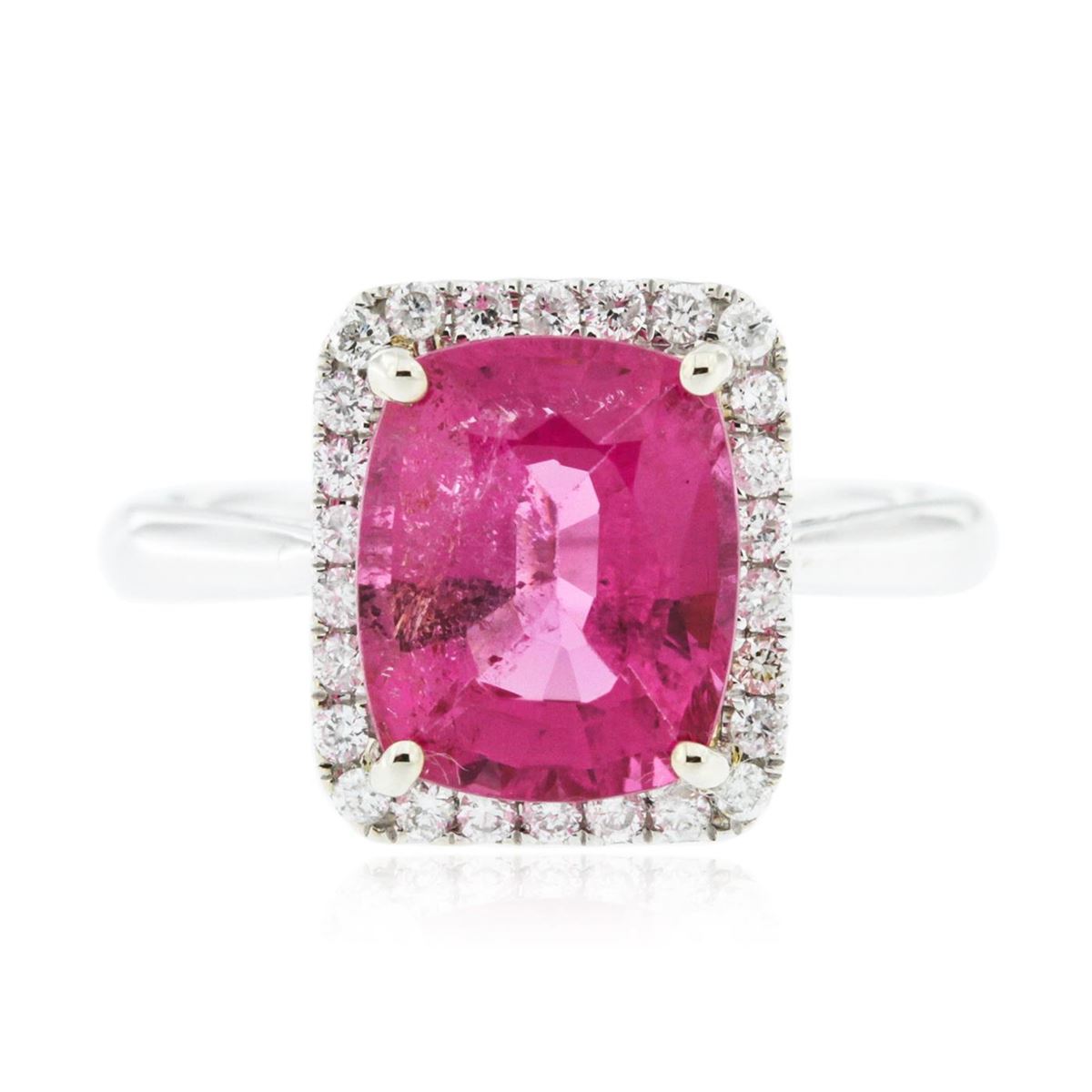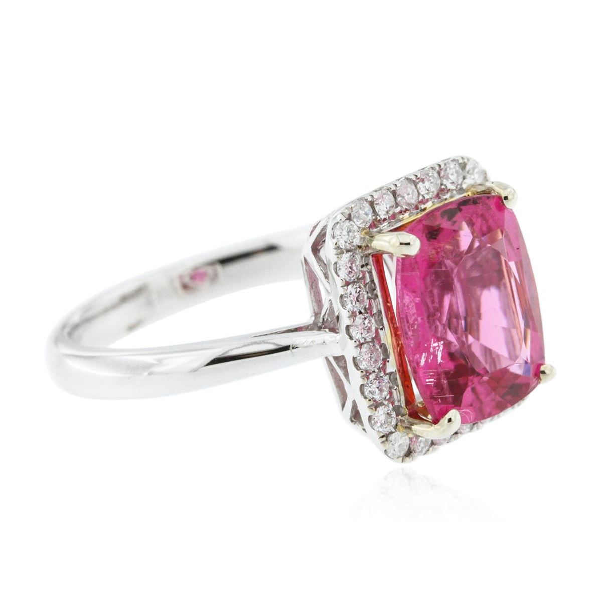 One electronically tested 14KT white and yellow gold Ladies combination cast & assembled ring with a bright polish finish. Identified with markings of "14K". Condition is new. Containing: Twenty-Six prong set round brilliant cut diamonds, measuring 1.30 - 1.30 x 0.78mm (depth est.) approximate. Total Weight of 26 Stones = 0.32ct. Clarity: I-1 to I-2. Color: I - J, Cut is Good. One prong set square cushion modified brilliant cut natural pink tourmaline, measuring 10.11 x 8.39 x 5.40mm, exact weight 3.22ct., clarity is eye clean, type II, medium, moderately strong, reddish purple color, (GIA rP 5/4), cut is very good. Colored gemstones are presumed to have been subjected to commonly used color/clarity enhancement processes. Total Weight of Colored Stones 3.22ct. Total Weight of Diamonds 0.32ct. Total Weight of Ring 4.30gm. GGL Appraised at $5,585.00.
