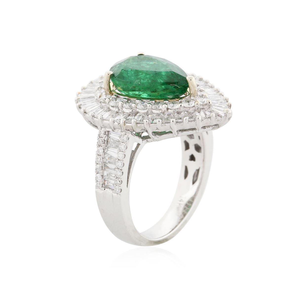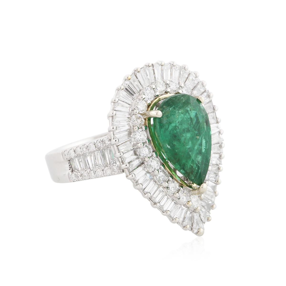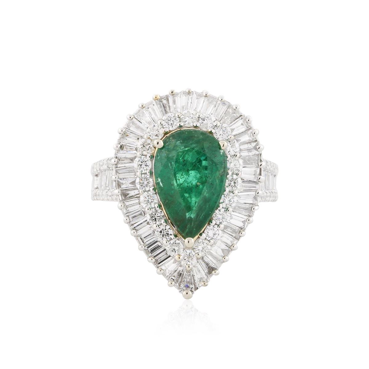 One electronically tested 14KT white and yellow gold Ladies combination cast & assembled fashion ring with a bright polish finish. Condition is new. Identified with markings of "14K". Containing: One prong set pear modified mixed cut natural emerald, measuring 12.50 x 8.40 x 5.90mm, approximate weight of 3.70ct., clarity is moderately included, type III, medium light, moderately strong, very slightly bluish green color, (GIA vslbG 4/4), cut is good. Colored gemstones are presumed to have been subjected to commonly used color/clarity enhancement processes. Twenty-Eight prong set round brilliant cut diamonds, measuring 1.00 - 1.00 x 0.60mm (depth est.) approximate. Total Weight of 28 Stones = 0.10ct. Clarity: I-1. Color: H - I, Cut is Good. Twenty prong set round brilliant cut diamonds, measuring 2.00 - 2.00 x 1.20mm (depth est.) approximate. Total Weight of 20 Stones = 0.58ct. Clarity: SI-1 to I-1. Color: H - I, Cut is Good. Fifty-Three channel set baguette cut diamonds, measuring 2.50 x 1.50 x 1.28mm (depth est.) approximate. Total Weight of 53 Stones = 1.66ct. Clarity: SI-1 to SI-2. Color: H - I, Cut is Good. Total Weight of Colored Stones 3.70ct. Total Weight of Diamonds 2.34ct. Total Weight of Ring 8.90 grams. GGL Appraised at $16,275.00.