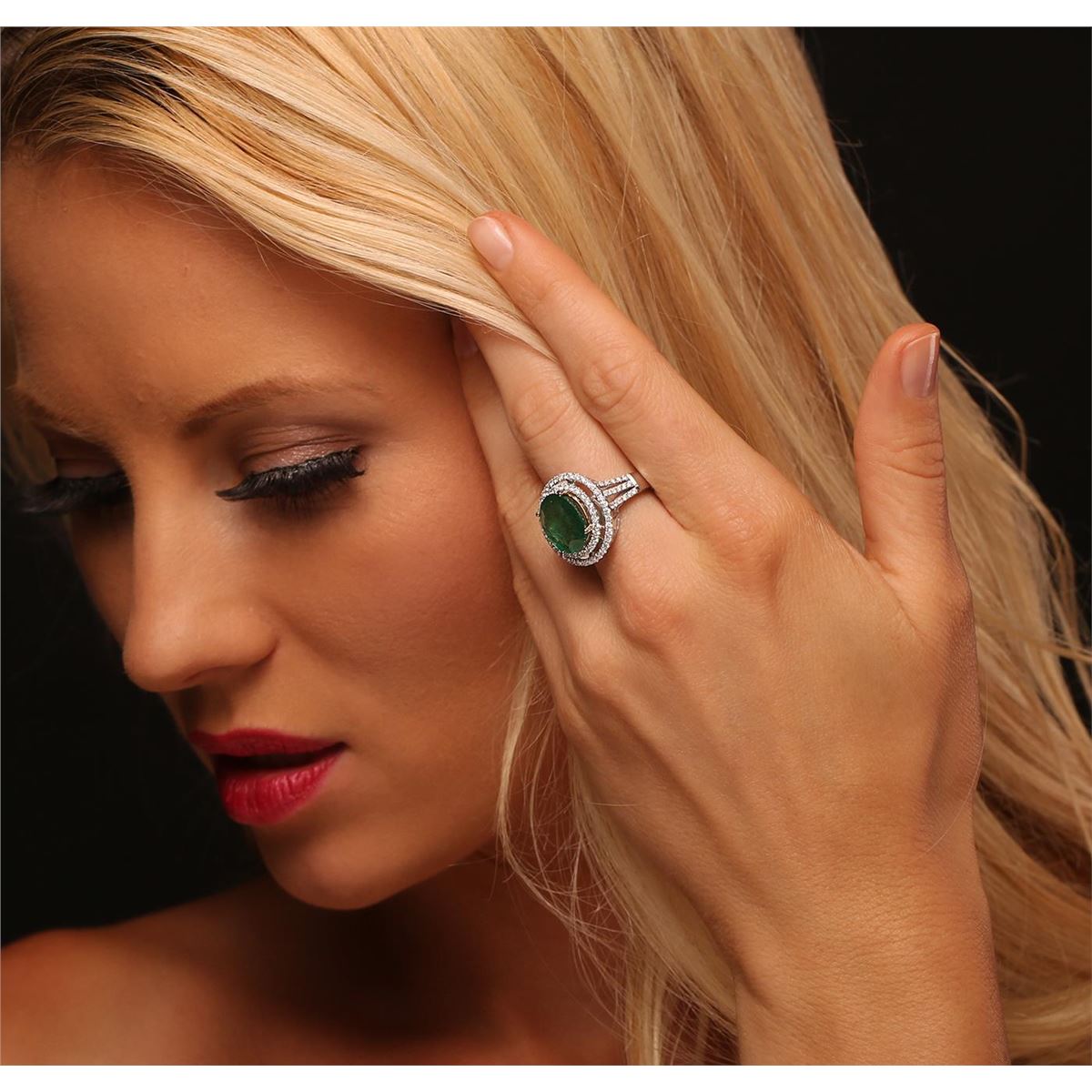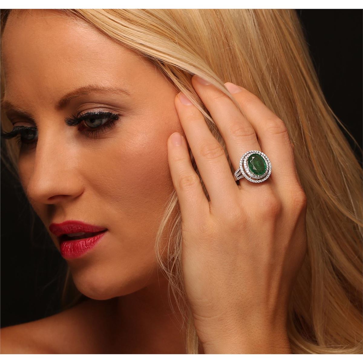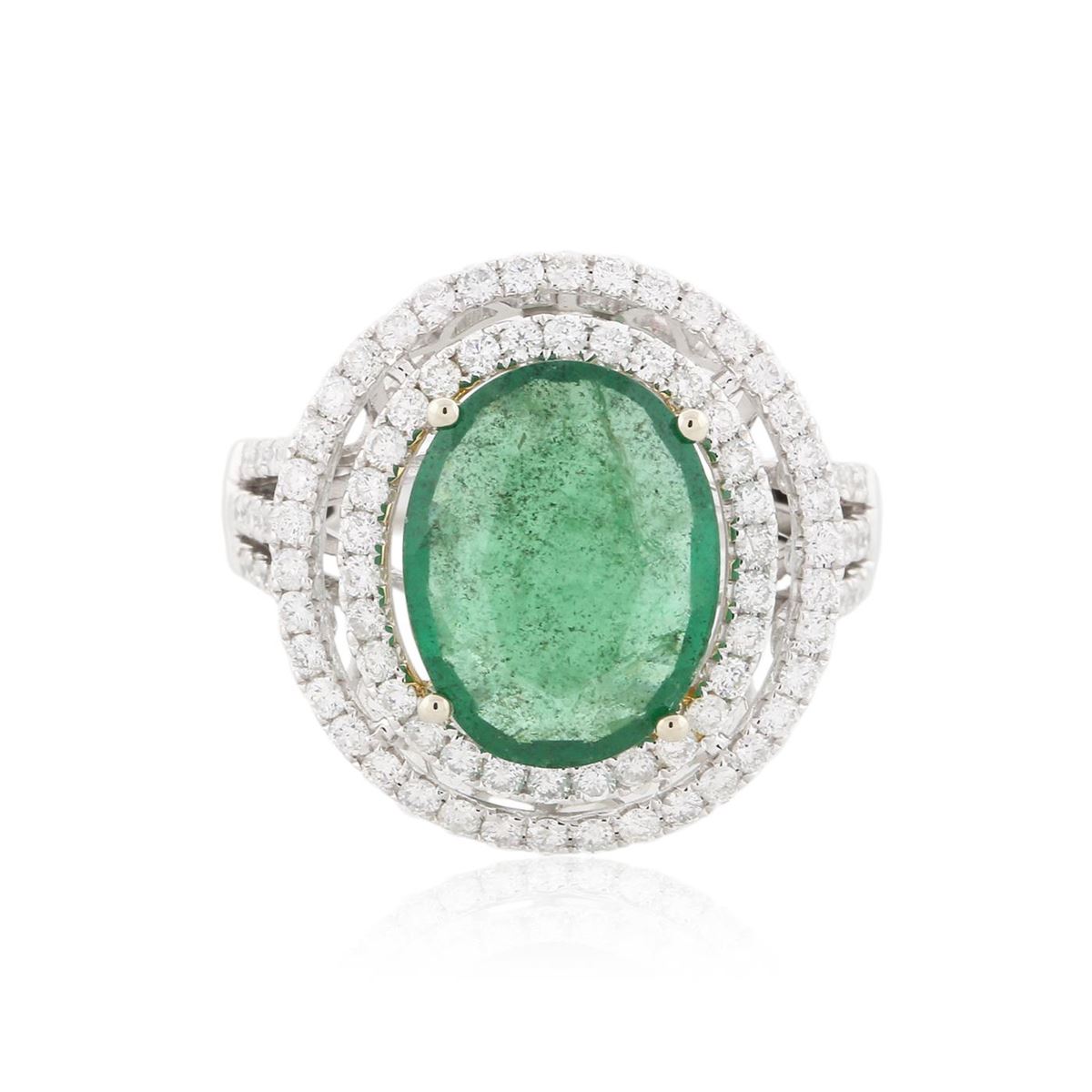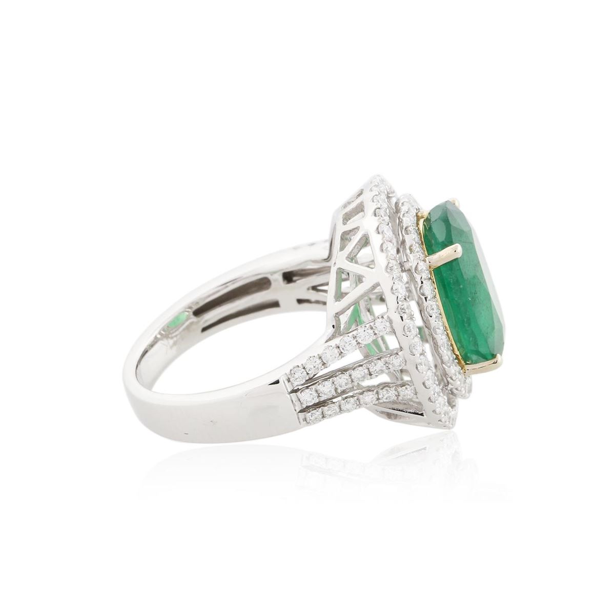 One electronically tested 14KT white and yellow gold Ladies combination cast & assembled fashion ring with a bright polish finish. Condition is new. Identified with markings of "14K". Containing: One prong set oval modified mixed cut natural emerald, measuring 13.00 x 10.20 x 4.40mm, approximate weight of 4.44ct., clarity is moderately included, type III, medium light, very slightly grayish, green color, (GIA G 4/3), cut is good. Colored gemstones are presumed to have been subjected to commonly used and possible undetectable color/clarity enhancement processes. One Hundred Five prong set round brilliant cut diamonds, measuring 1.30 - 1.30 x 0.78mm (depth est.) approximate. Total Weight of 105 Stones = 1.15ct. Clarity: I-1. Color: H - I, Cut is Good. Total Weight of Colored Stones 4.44ct. Total Weight of Diamonds 1.15ct. Total Weight of Ring 7.40 grams. GGL Appraised at $14,040.00.
