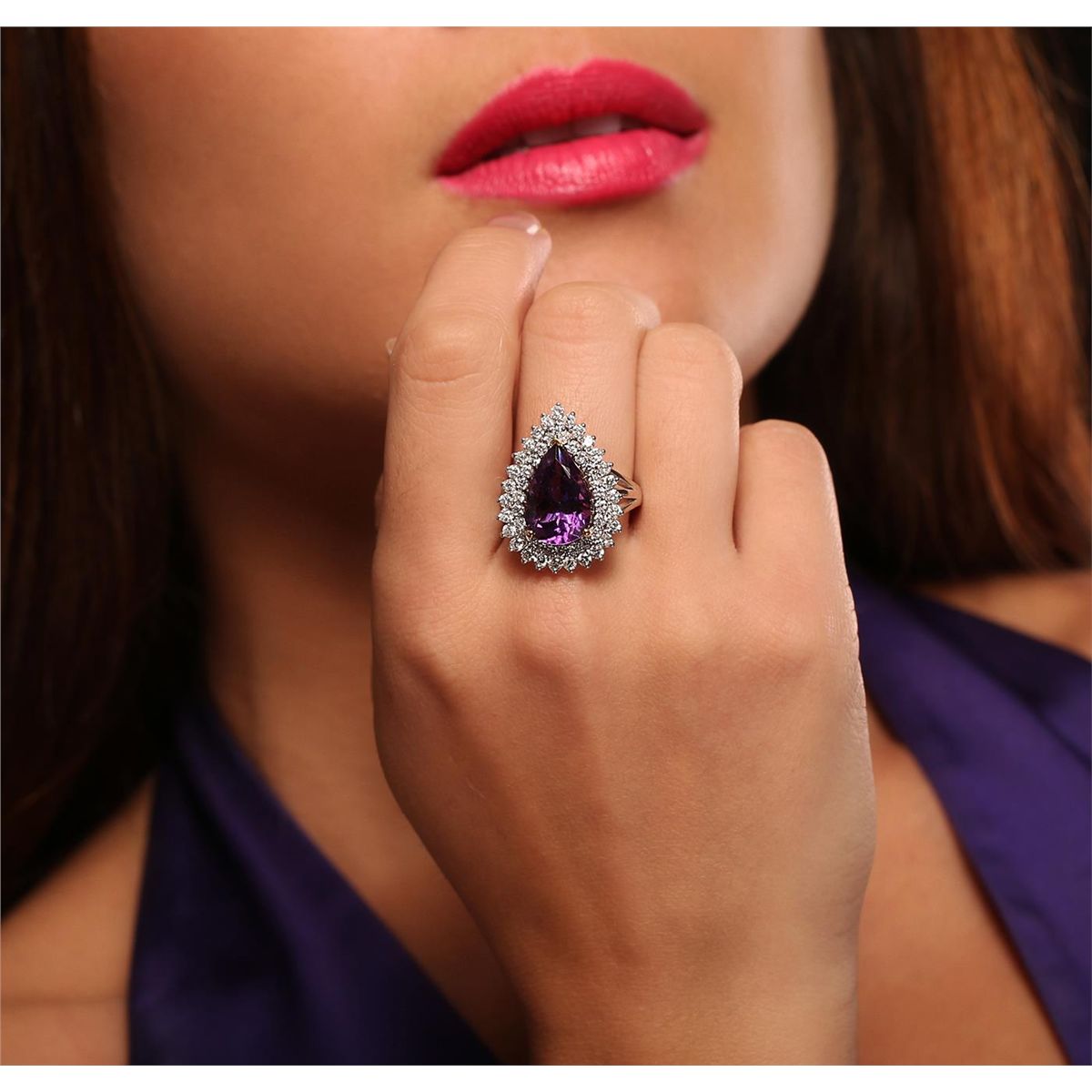 One electronically tested 14KT white and yellow gold Ladies combination cast & assembled ring with a bright polish finish. Condition is new. Identified with markings of "14K". Containing: Twenty-Seven prong set round brilliant cut diamonds, measuring 2.00 - 2.00 x 1.32mm (depth est.) approximate. Total Weight of 27 Stones = 1.24ct. Clarity: SI-2 to I-1. Color: H - I, Cut is Good. Twenty-Four prong set round brilliant cut diamonds, measuring 1.80 - 1.80 x 1.08mm (depth est.) approximate. Total Weight of 24 Stones = 0.75ct. Clarity: SI-2 to I-1. Color: H - I, Cut is Good. One prong set pear modified brilliant cut natural amethyst, measuring 15.00 x 10.00 x 6.50mm, approximate weight of 5.15ct., clarity is eye clean, type II, medium, moderately strong, purple color, (GIA P 5/4), cut is good. Total Weight of Colored Stones 5.15ct. Total Weight of Diamonds 1.99ct. Total Weight of Ring 8.50 grams. GGL Appraised at $9,095.00.