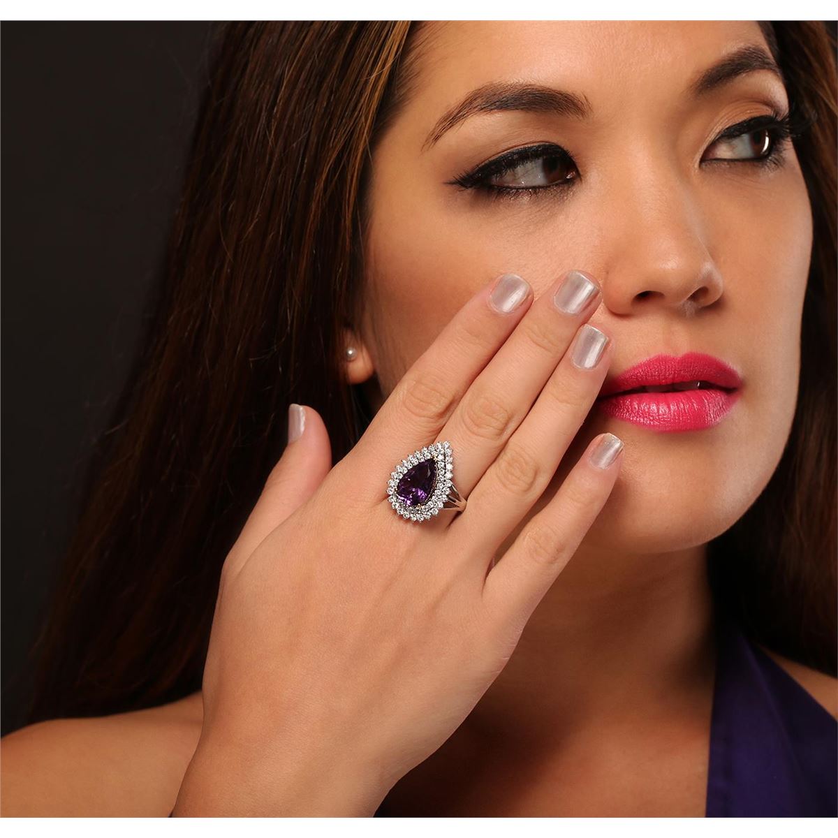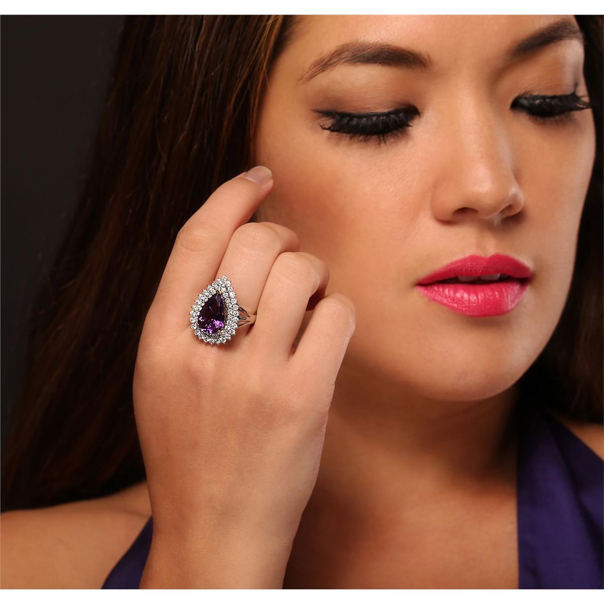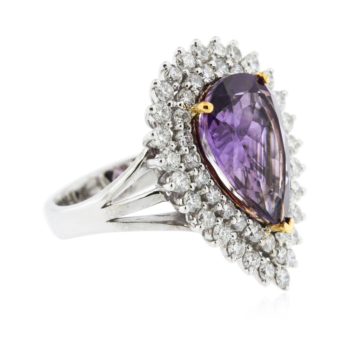 One electronically tested 14KT white and yellow gold Ladies combination cast & assembled ring with a bright polish finish. Condition is new. Identified with markings of "14K". Containing: Twenty-Seven prong set round brilliant cut diamonds, measuring 2.00 - 2.00 x 1.32mm (depth est.) approximate. Total Weight of 27 Stones = 1.24ct. Clarity: SI-2 to I-1. Color: H - I, Cut is Good. Twenty-Four prong set round brilliant cut diamonds, measuring 1.80 - 1.80 x 1.08mm (depth est.) approximate. Total Weight of 24 Stones = 0.75ct. Clarity: SI-2 to I-1. Color: H - I, Cut is Good. One prong set pear modified brilliant cut natural amethyst, measuring 15.00 x 10.00 x 6.50mm, approximate weight of 5.15ct., clarity is eye clean, type II, medium, moderately strong, purple color, (GIA P 5/4), cut is good. Total Weight of Colored Stones 5.15ct. Total Weight of Diamonds 1.99ct. Total Weight of Ring 8.50 grams. GGL Appraised at $9,095.00.