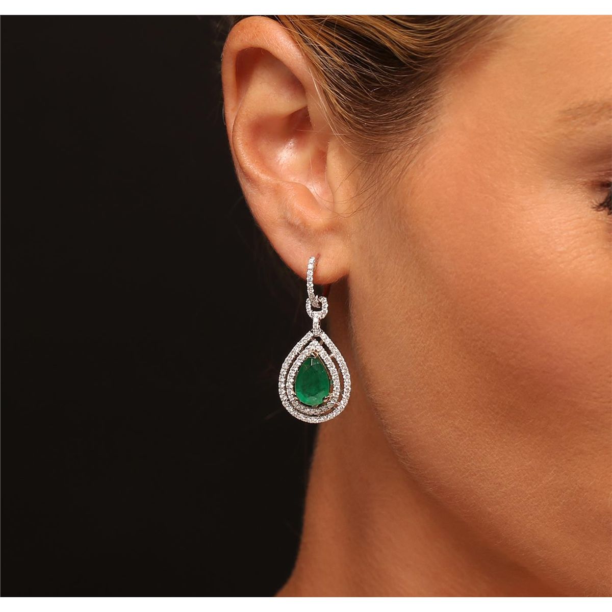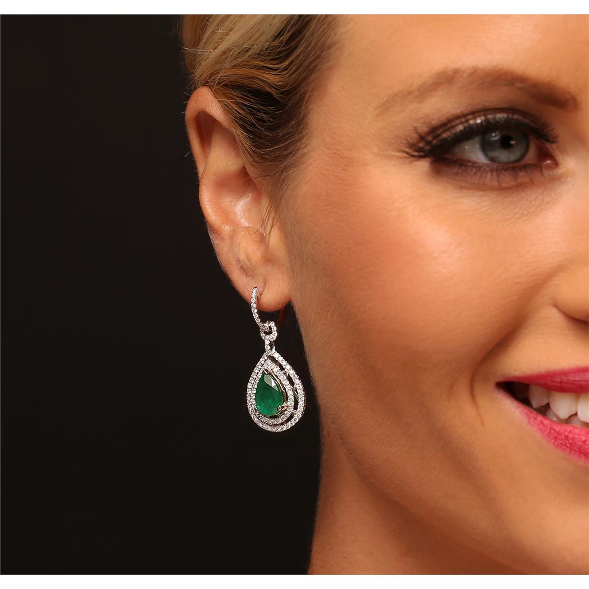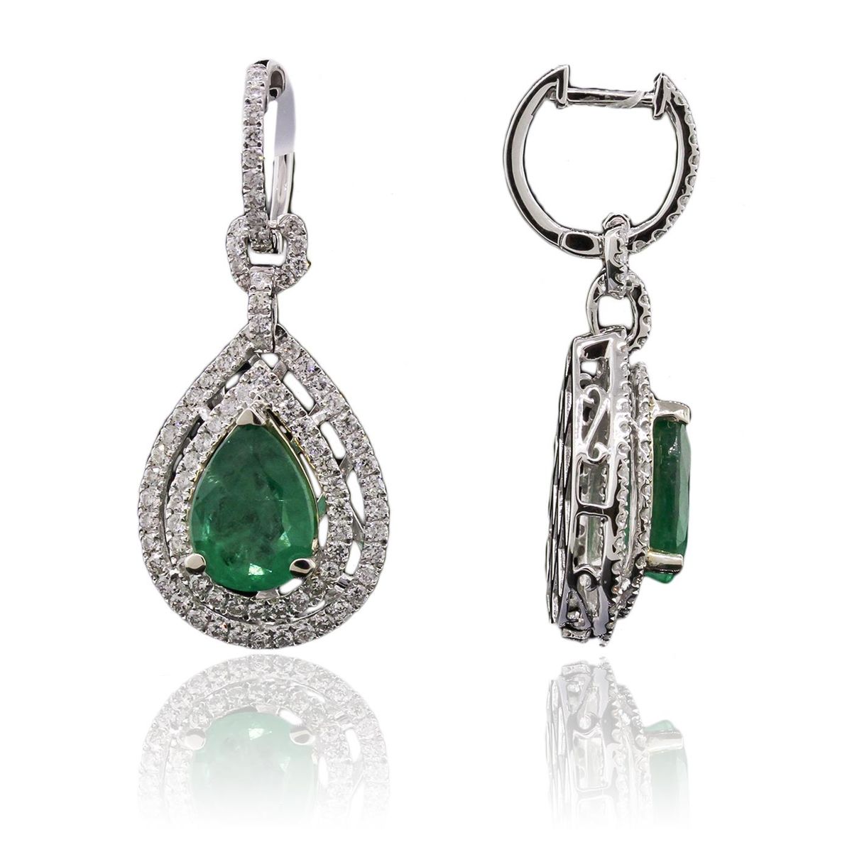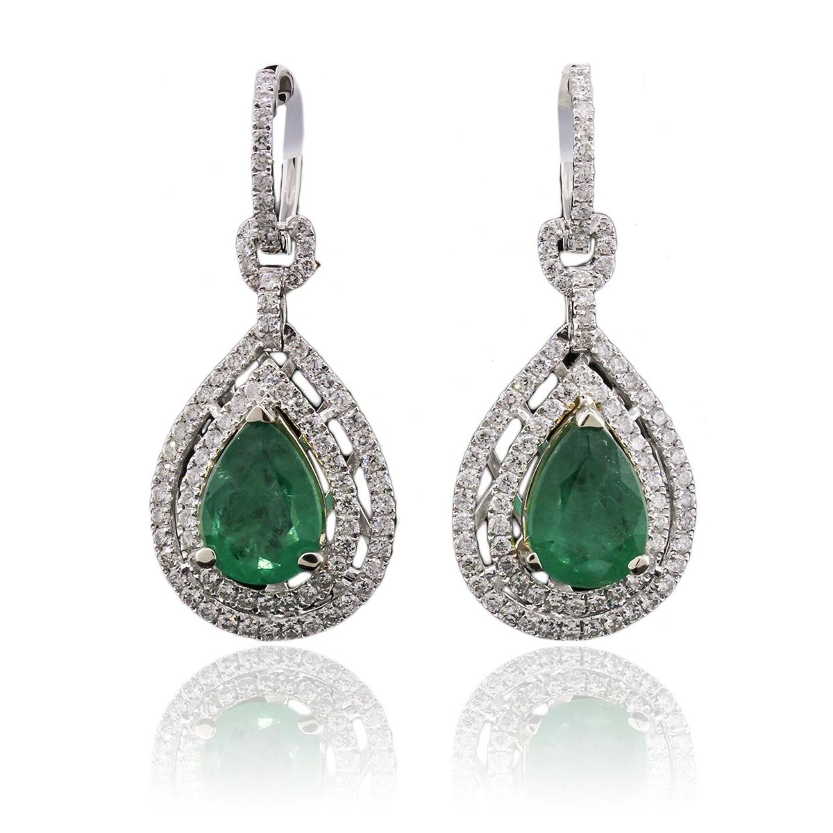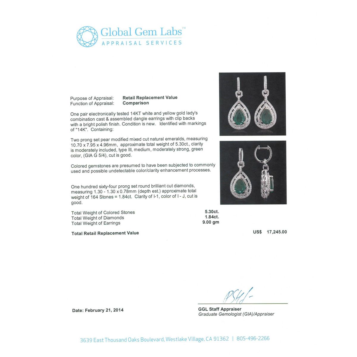 One pair electronically tested 14KT white and yellow gold Ladies combination cast & assembled dangle earrings with hinged clip backs with a bright polish finish. Condition is new. Identified with markings of "14K". Containing: Two prong set pear modified mixed cut natural emeralds, measuring 10.70 x 7.95 x 4.96mm, approximate. Total Weight of 5.30ct., clarity is moderately included, type III, medium, moderately strong, green color, (GIA G 5/4), cut is good. Colored gemstones are presumed to have been subjected to commonly used and possible undetectable color/clarity enhancement processes. One Hundred Sixty-Four prong set round brilliant cut diamonds, measuring 1.30 - 1.30 x 0.78mm (depth est.) approximate. Total Weight of 164 Stones = 1.84ct. Clarity: I-1. Color: I - J, Cut is Good. Total Weight of Colored Stones 5.30ct. Total Weight of Diamonds 1.84ct. Total Weight of Earrings 9.00 grams. GGL Appraised at $17,245.00.