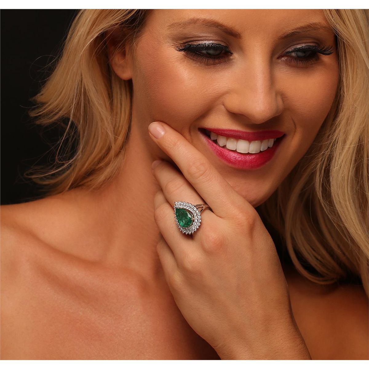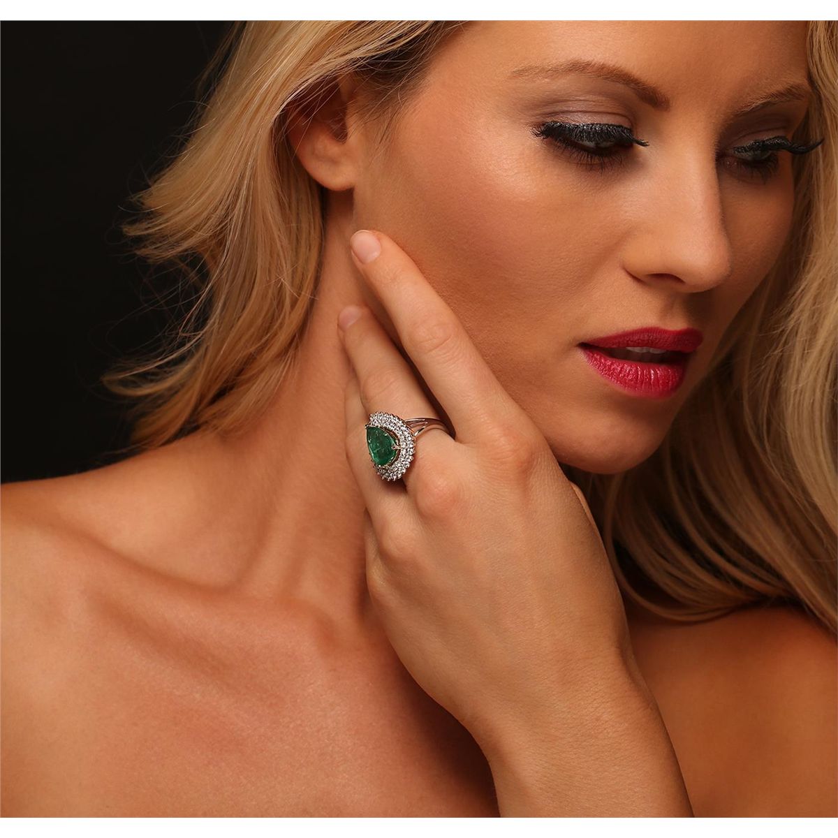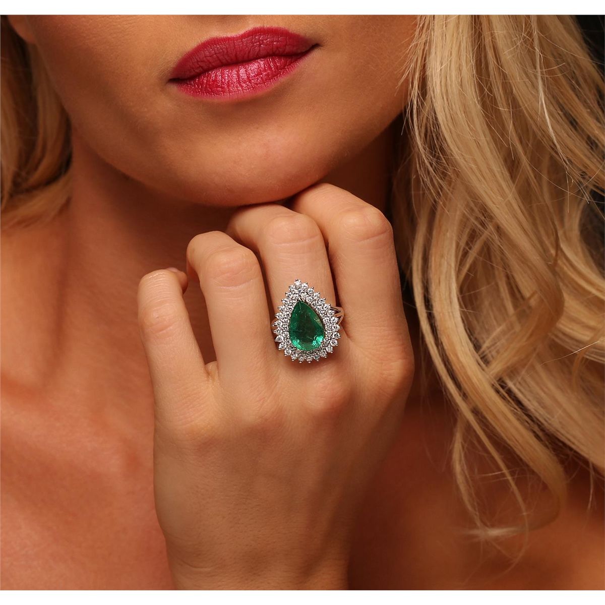 One electronically tested 14KT white and yellow gold Ladies combination cast & assembled fashion ring with a bright polish finish. Condition is new. Identified with markings of "14K". Containing: One prong set pear modified mixed cut natural emerald, measuring 14.70 x 10.10 x 6.00mm, approximate weight of 5.54ct., clarity is moderately included, type III, medium, moderately strong, very slightly bluish green color, (GIA vslbG 5/4), cut is good. Colored gemstones are presumed to have been subjected to commonly used and possible undetectable color/clarity enhancement processes. Twenty-Five prong set round brilliant cut diamonds, measuring 1.70 - 1.70 x 1.02mm (depth est.) approximate. Total Weight of 25 Stones = 0.45ct. Clarity: SI-2 to I-1. Color: H - I, Cut is Good. Twenty-Seven prong set round brilliant cut diamonds, measuring 2.50 - 2.50 x 1.50mm (depth est.) approximate. Total Weight of 27 Stones = 1.46ct. Clarity: SI-2 to I-1. Color: H - I, Cut is Good. Total Weight of Colored Stones 5.54ct. Total Weight of Diamonds 1.91ct. Total Weight of Ring 9.70 grams. GGL Appraised at $19,255.00.