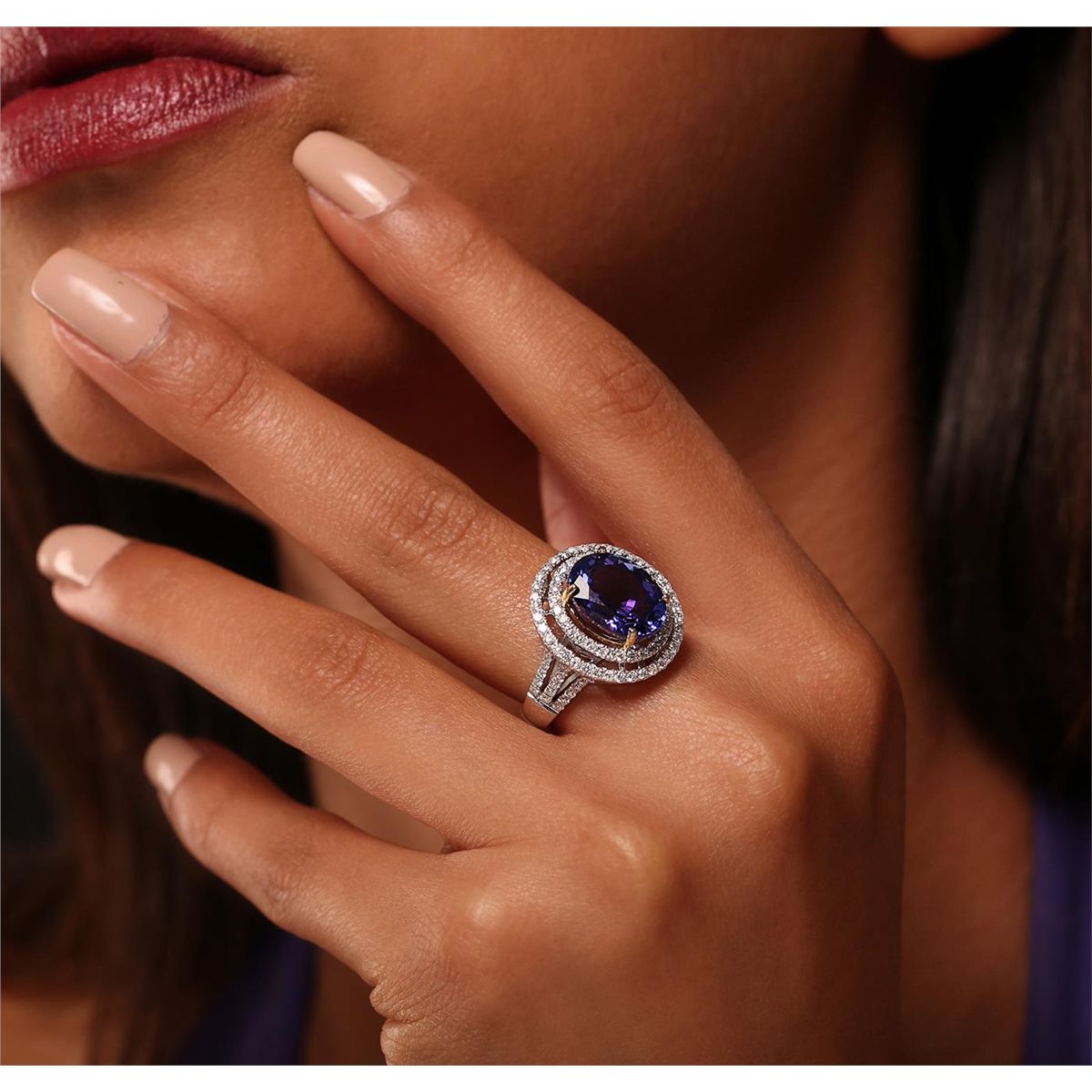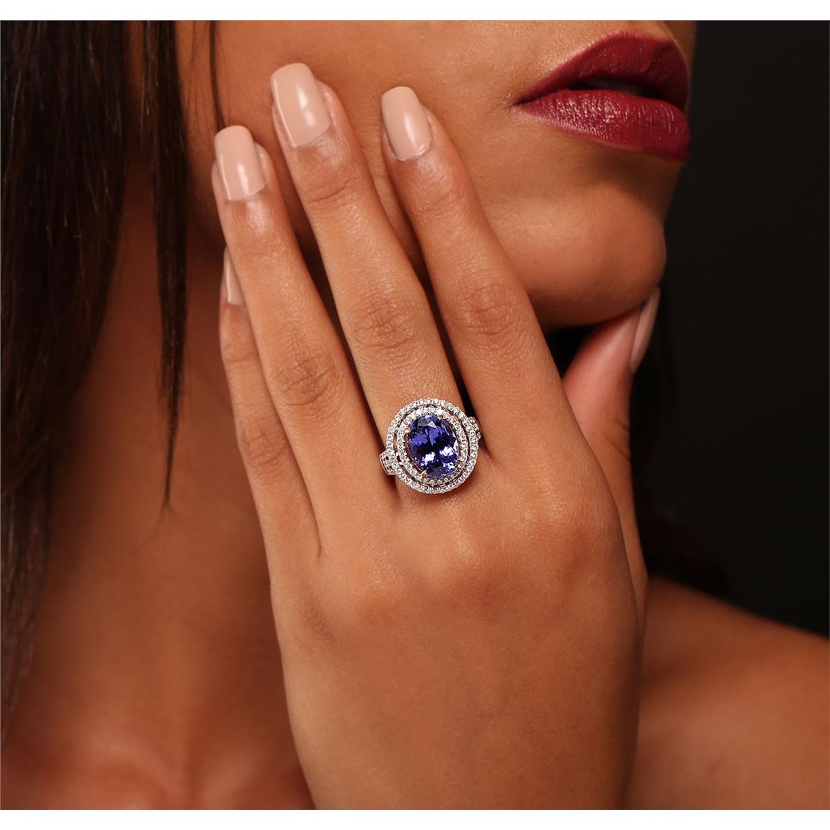 One electronically tested 14KT white and yellow gold Ladies combination cast & assembled ring with a bright polish finish. Condition is new. Identified with markings of "14K". Containing: One prong set oval modified brilliant cut natural tanzanite, measuring 13.00 x 9.80 x 6.70mm, exact weight 6.24ct., clarity is eye clean, type I, medium, very slightly grayish, bluish violet color, (GIA bV 5/3), cut is very good. Colored gemstones are presumed to have been subjected to commonly used color/clarity enhancement processes. One Hundred Four bead set round brilliant cut diamonds, measuring 1.30 - 1.30 x 0.78mm (depth est.) approximate. Total Weight of 104 Stones = 1.19ct. Clarity: I-1 to I-2. Color: H - I, Cut is Good.. Total Weight of Colored Stones 6.24ct. Total Weight of Diamonds 1.19ct. Total Weight of Ring 7.90 grams. GGL Appraised at $10,285.00.