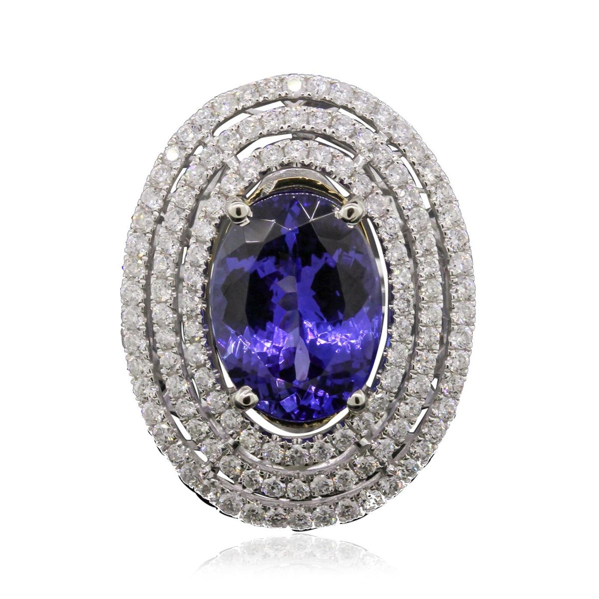 One electronically tested 14KT white and yellow gold Ladies combination cast & assembled fashion ring with a bright polish finish. Condition is new. Identified with markings of "14K". Containing: One Hundred Sixty-Six prong set round brilliant cut diamonds, measuring 1.45 - 1.45 x 0.87mm (depth est.) approximate. Total Weight of 166 Stones = 1.96ct. Clarity: SI-2. Color: H, Cut is Good. Eight invisible set princess cut diamonds, measuring 1.50 x 1.50 x 1.13mm (depth est.) approximate. Total Weight of 8 Stones = 0.20ct. Clarity: SI-2. Color: I - J, Cut is Good. One prong set oval modified brilliant cut natural tanzanite, measuring 14.00 x 10.00 x 6.70mm, approximate weight of 6.46ct., clarity is eye clean, type I, medium, moderately strong, bluish violet color, (GIA bV 5/4), cut is very good. Colored gemstones are presumed to have been subjected to commonly used color/clarity enhancement processes. Total Weight of Colored Stones 6.46ct. Total Weight of Diamonds 2.16ct. Total Weight of Ring 10.20 grams. GGL Appraised at $16,625.00.
