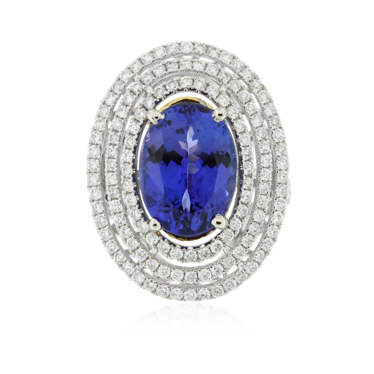 One electronically tested 14KT white and yellow gold Ladies combination cast & assembled fashion ring with a bright polish finish. Condition is new. Identified with markings of "14K". Containing: One Hundred Sixty-Six prong set round brilliant cut diamonds, measuring 1.45 - 1.45 x 0.87mm (depth est.) approximate. Total Weight of 166 Stones = 1.96ct. Clarity: SI-2. Color: H, Cut is Good. Eight invisible set princess cut diamonds, measuring 1.50 x 1.50 x 1.13mm (depth est.) approximate. Total Weight of 8 Stones = 0.20ct. Clarity: SI-2. Color: I - J, Cut is Good. One prong set oval modified brilliant cut natural tanzanite, measuring 14.00 x 10.00 x 6.70mm, approximate weight of 6.46ct., clarity is eye clean, type I, medium, moderately strong, bluish violet color, (GIA bV 5/4), cut is very good. Colored gemstones are presumed to have been subjected to commonly used color/clarity enhancement processes. Total Weight of Colored Stones 6.46ct. Total Weight of Diamonds 2.16ct. Total Weight of Ring 10.20 grams. GGL Appraised at $16,625.00.
