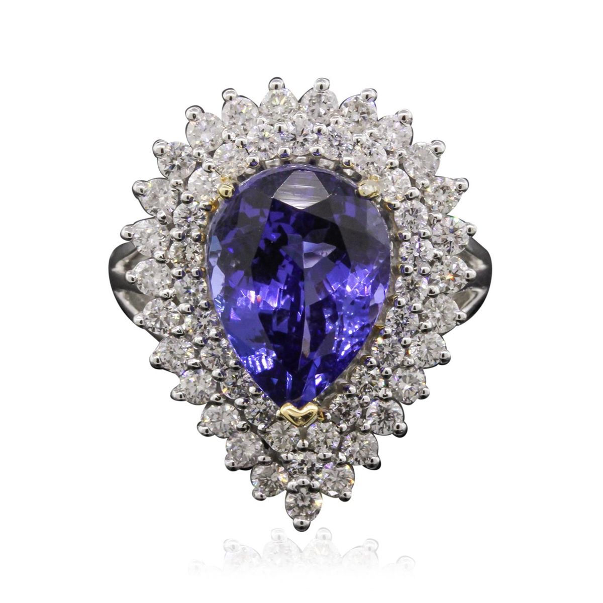 One electronically tested 14KT white and yellow gold Ladies combination cast & assembled fashion ring with a bright polish finish. Condition is new. Identified with markings of "14K". Containing: Twenty-Four prong set round brilliant cut diamonds, measuring 1.80 - 1.80 x 1.08mm (depth est.) approximate. Total Weight of 24 Stones = 0.65ct. Clarity: SI-2 to I-1. Color: H - I, Cut is Good. Twenty-Seven prong set round brilliant cut diamonds, measuring 2.00 - 2.00 x 1.50mm (depth est.) approximate. Total Weight of 27 Stones = 1.26ct. Clarity: SI-2. Color: H - I, Cut is Good. One prong set pear modified brilliant cut natural tanzanite, measuring 14.00 x 10.00 x 6.50mm, approximate weight of 6.89ct., clarity is eye clean, type I, medium, moderately strong, bluish violet color, (GIA bV 5/4), cut is very good. Colored gemstones are presumed to have been subjected to commonly used color/clarity enhancement processes. Total Weight of Colored Stones 6.89ct. Total Weight of Diamonds 1.91ct. Total Weight of Ring 9.90 grams. GGL Appraised at $17,260.00.