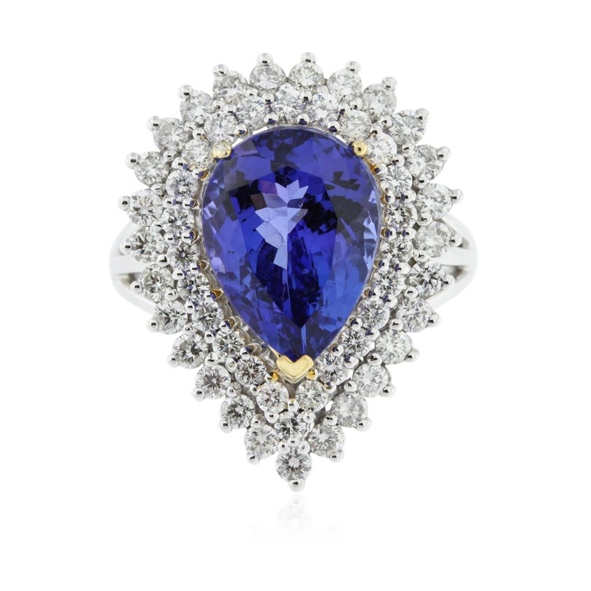 One electronically tested 14KT white and yellow gold Ladies combination cast & assembled fashion ring with a bright polish finish. Condition is new. Identified with markings of "14K". Containing: Twenty-Four prong set round brilliant cut diamonds, measuring 1.80 - 1.80 x 1.08mm (depth est.) approximate. Total Weight of 24 Stones = 0.65ct. Clarity: SI-2 to I-1. Color: H - I, Cut is Good. Twenty-Seven prong set round brilliant cut diamonds, measuring 2.00 - 2.00 x 1.50mm (depth est.) approximate. Total Weight of 27 Stones = 1.26ct. Clarity: SI-2. Color: H - I, Cut is Good. One prong set pear modified brilliant cut natural tanzanite, measuring 14.00 x 10.00 x 6.50mm, approximate weight of 6.89ct., clarity is eye clean, type I, medium, moderately strong, bluish violet color, (GIA bV 5/4), cut is very good. Colored gemstones are presumed to have been subjected to commonly used color/clarity enhancement processes. Total Weight of Colored Stones 6.89ct. Total Weight of Diamonds 1.91ct. Total Weight of Ring 9.90 grams. GGL Appraised at $17,260.00.
