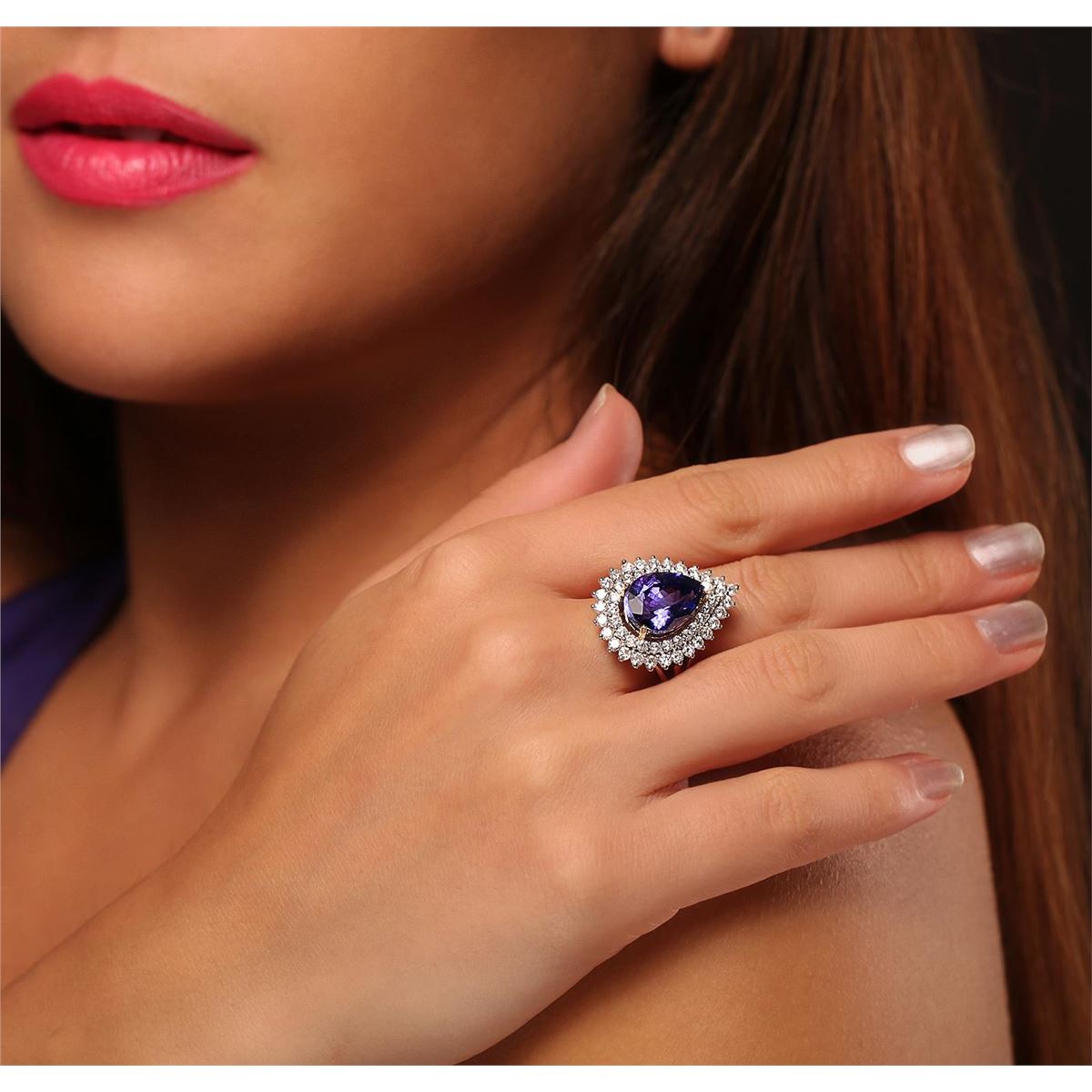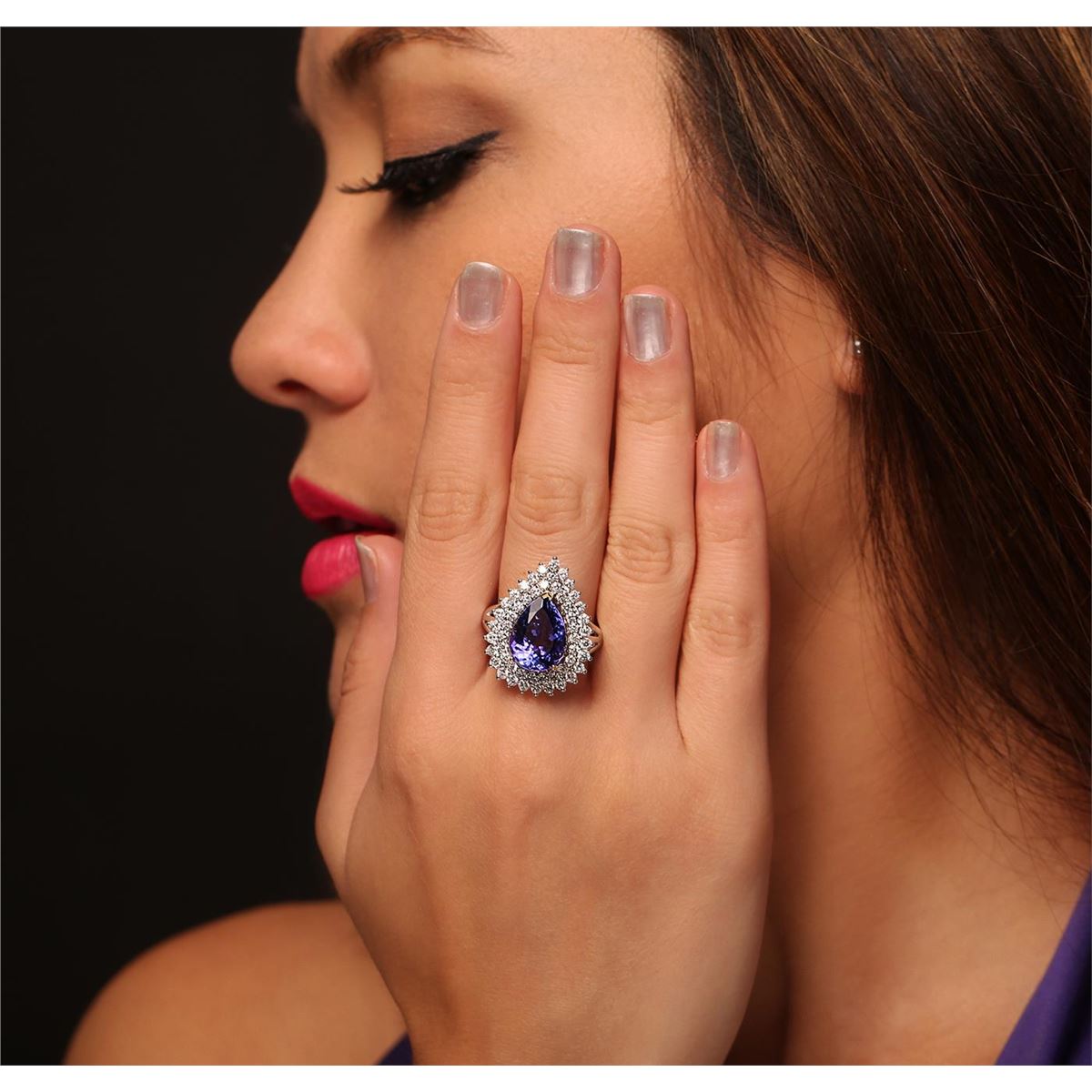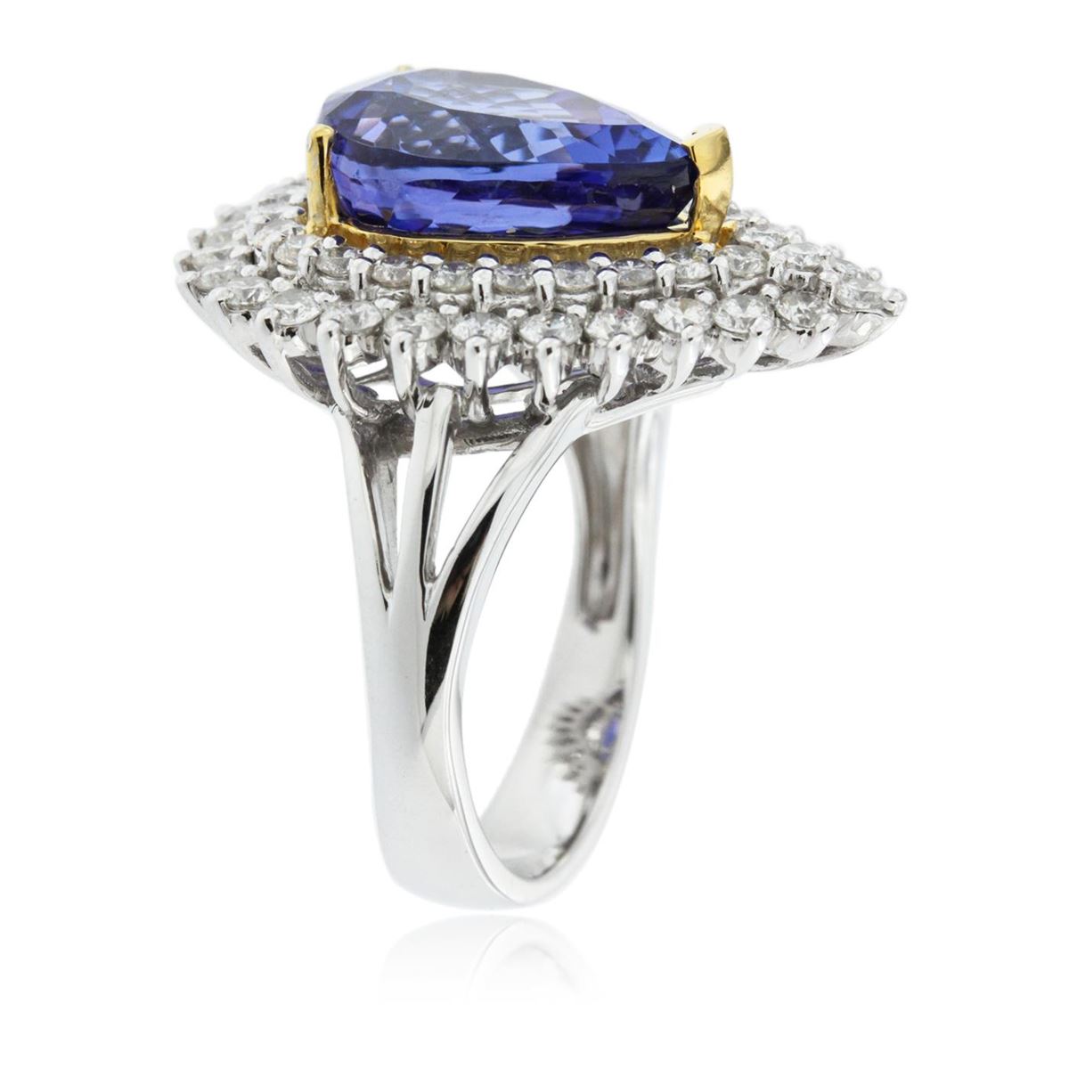 One electronically tested 14KT white and yellow gold Ladies combination cast & assembled fashion ring with a bright polish finish. Condition is new. Identified with markings of "14K". Containing: Twenty-Four prong set round brilliant cut diamonds, measuring 1.80 - 1.80 x 1.08mm (depth est.) approximate. Total Weight of 24 Stones = 0.65ct. Clarity: SI-2 to I-1. Color: H - I, Cut is Good. Twenty-Seven prong set round brilliant cut diamonds, measuring 2.00 - 2.00 x 1.50mm (depth est.) approximate. Total Weight of 27 Stones = 1.26ct. Clarity: SI-2. Color: H - I, Cut is Good. One prong set pear modified brilliant cut natural tanzanite, measuring 14.00 x 10.00 x 6.50mm, approximate weight of 6.89ct., clarity is eye clean, type I, medium, moderately strong, bluish violet color, (GIA bV 5/4), cut is very good. Colored gemstones are presumed to have been subjected to commonly used color/clarity enhancement processes. Total Weight of Colored Stones 6.89ct. Total Weight of Diamonds 1.91ct. Total Weight of Ring 9.90 grams. GGL Appraised at $17,260.00.