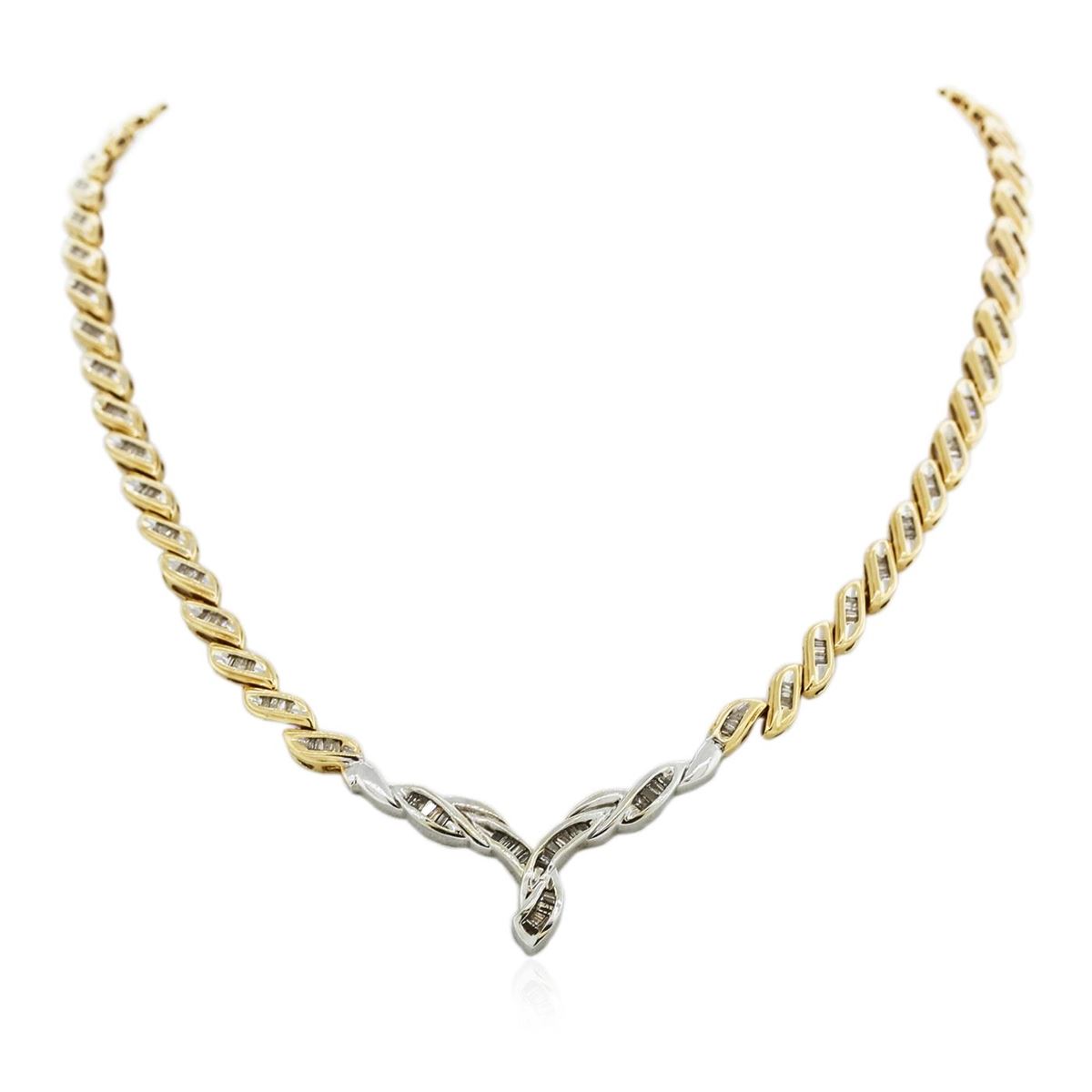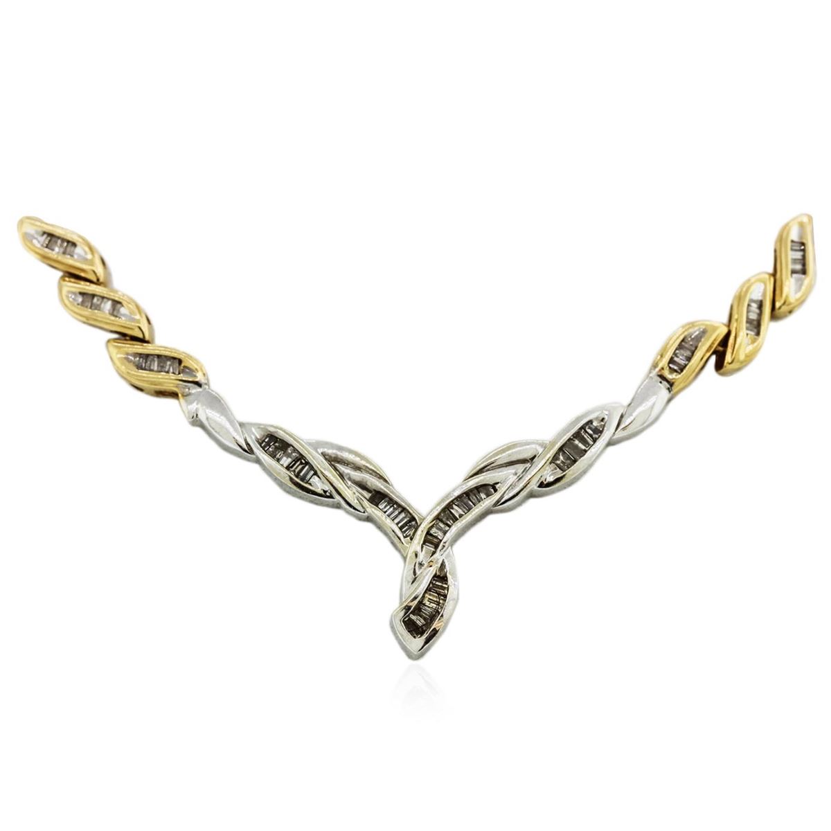 One electronically tested 14KT white and yellow gold Ladies combination cast & assembled Shevron necklace with a hidden box clasp with a bright polish finish. Identified with markings of "14K". Condition is excellent. Containing: Two Hundred Twenty-One channel set baguette cut diamonds, measuring from 1.50 x 1.00 x 0.85mm (depth est.) to 2.50 x 1.50 x 1.28mm (depth est.) approximate total weight of 221 Stones = 8.84ct. Clarity of I-1 to I-2, Color of H - J, Cut is Fair. Total Weight of Diamonds 8.84ct. Total Weight of Necklace 26.70gm. GGL Appraised at $12,600.00.