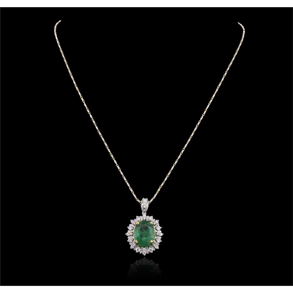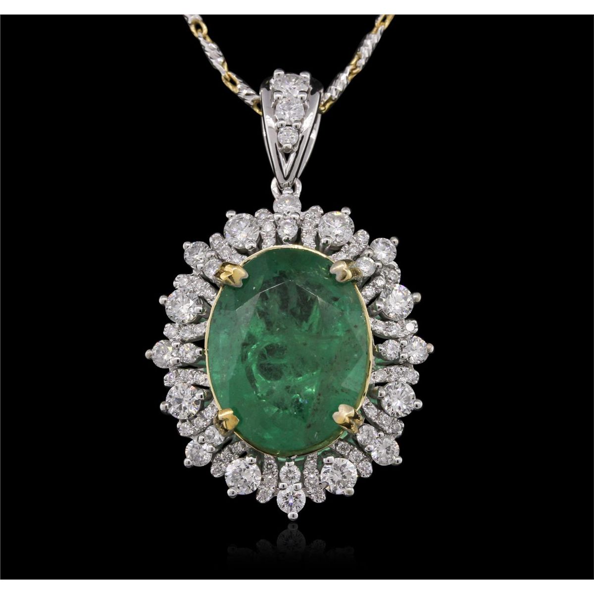 One electronically tested 14KT white and yellow gold Ladies combination cast & assembled pendant & chain 17.5" long, light open cable link with a lobster claw clasp with a bright polish finish. Condition is new. Identified with markings of "14K". Containing: One prong set oval modified mixed cut natural emerald, measuring 15.50 x 12.10 x 7.00mm, exact weight 8.95ct., clarity is moderately included, type III, medium, moderately strong, very slightly bluish green color, (GIA vslbG 5/4), cut is good. Colored gemstones are presumed to have been subjected to commonly used and possible undetectable color/clarity enhancement processes. Nine prong set round brilliant cut diamonds, measuring 2.60 - 2.60 x 1.56mm (depth est.) approximate. Total Weight of 9 Stones = 0.77ct. Clarity: SI-1 to SI-2. Color: G, Cut is Good. Ten prong set round brilliant cut diamonds, measuring 2.00 - 2.00 x 1.20mm (depth est.) approximate. Total Weight of 10 Stones = 0.35ct. Clarity: SI-1. Color: G, Cut is Good. Nine channel set round brilliant cut diamonds, measuring 1.50 - 1.50 x 0.90mm (depth est.) approximate. Total Weight of 9 Stones = 0.20ct. Clarity: SI-1. Color: H - I, Cut is Good. Forty-Eight prong set round brilliant cut diamonds, measuring 1.10 - 1.10 x 0.66mm (depth est.) approximate. Total Weight of 48 Stones = 0.33ct. Clarity: SI-1 to SI-2. Color: H - I, Cut is Good. Total Weight of Colored Stones 8.95ct. Total Weight of Diamonds 1.65ct. Total Weight of Pendant & Chain 11.10 grams. GGL Appraised at $23,760.00.