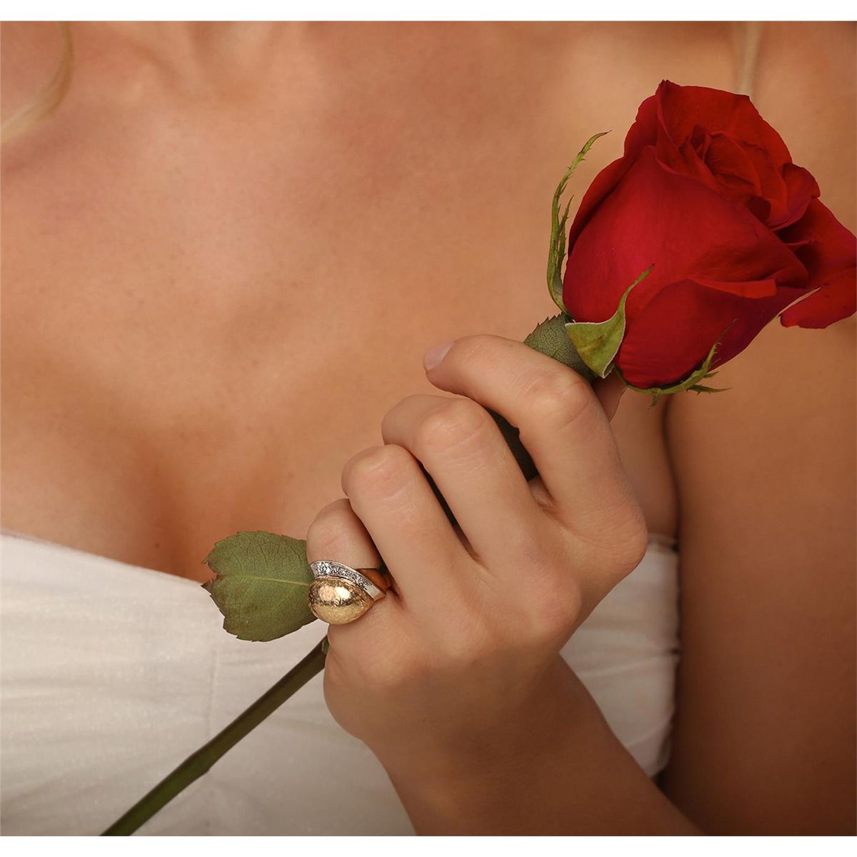 One electronically tested 14KT yellow gold lady's hand assembled fancy ring with a etched finish. Condition is very good. Containing: One prong set round brilliant cut diamond, measuring 3.30 - 3.30 x 1.98mm (depth est.) approximate weight of 0.13ct. Clarity of VS-2, Color of G, Cut is Good. Four prong set single cut diamonds, measuring 1.30 - 1.00 x 0.69mm (depth est.) approximate total weight of 4 Stones = 0.02ct. Clarity of VS-2, Color of F, Cut is Good. Total Weight of Diamonds 0.15ct. Total Weight of Ring 8.20gm. GGL Appraised at $3,375.00.
