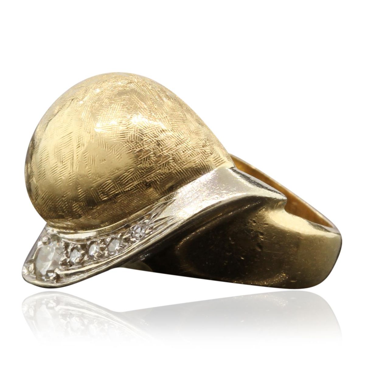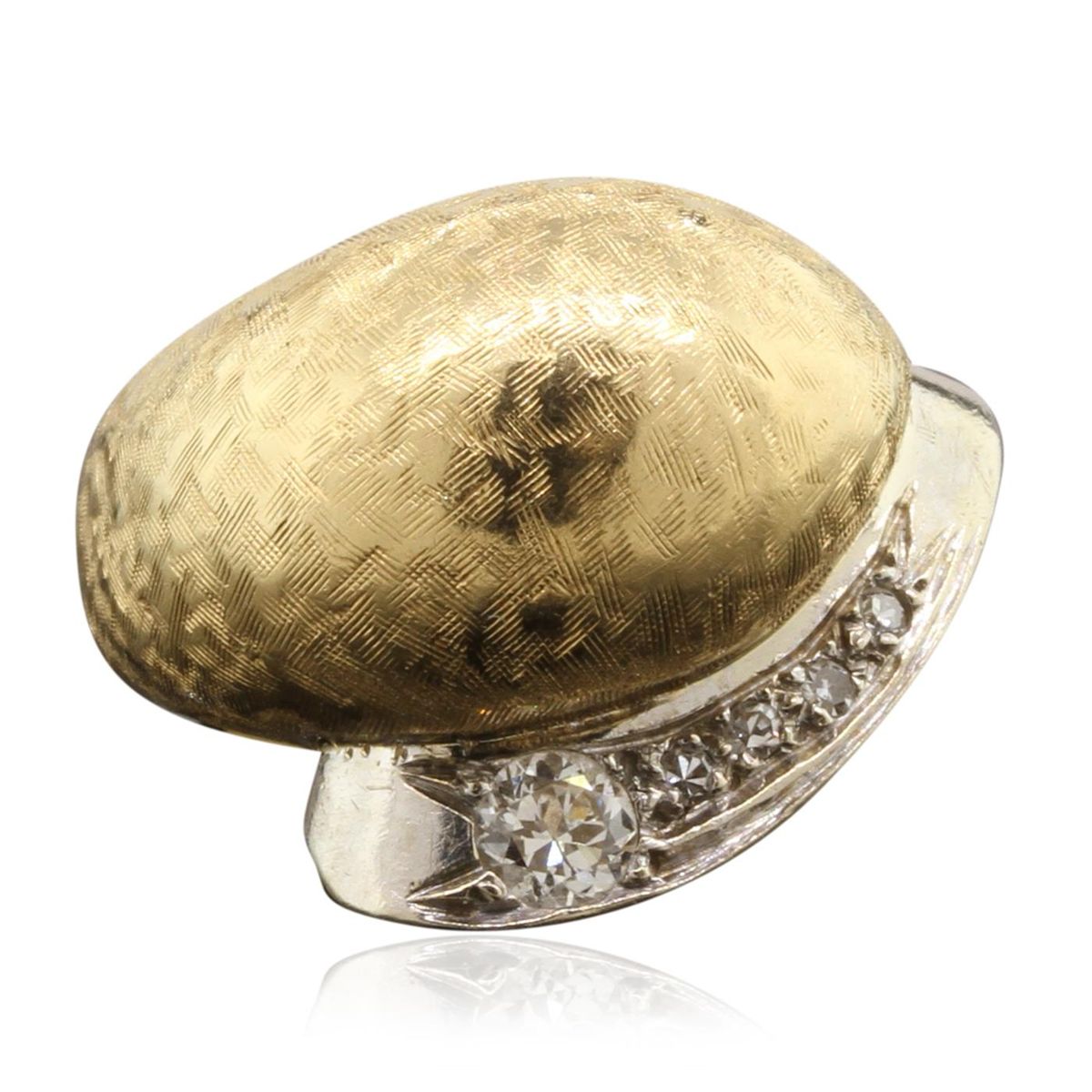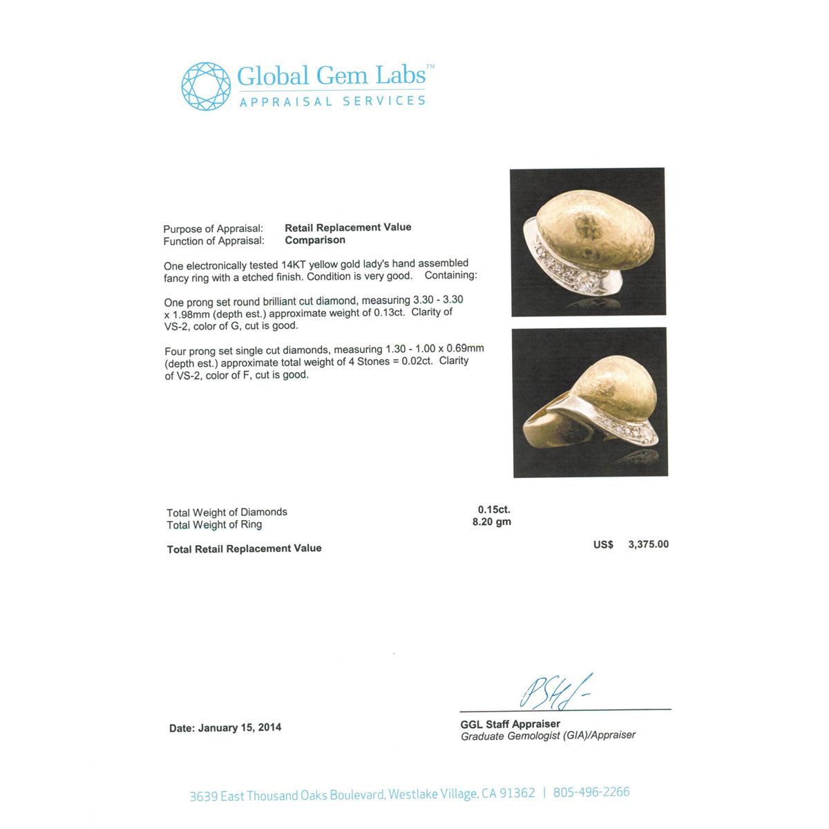 One electronically tested 14KT yellow gold lady's hand assembled fancy ring with a etched finish. Condition is very good. Containing: One prong set round brilliant cut diamond, measuring 3.30 - 3.30 x 1.98mm (depth est.) approximate weight of 0.13ct. Clarity of VS-2, Color of G, Cut is Good. Four prong set single cut diamonds, measuring 1.30 - 1.00 x 0.69mm (depth est.) approximate total weight of 4 Stones = 0.02ct. Clarity of VS-2, Color of F, Cut is Good. Total Weight of Diamonds 0.15ct. Total Weight of Ring 8.20gm. GGL Appraised at $3,375.00.