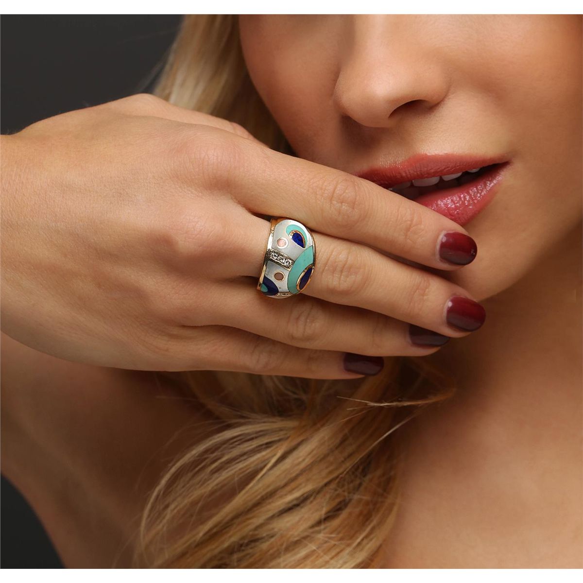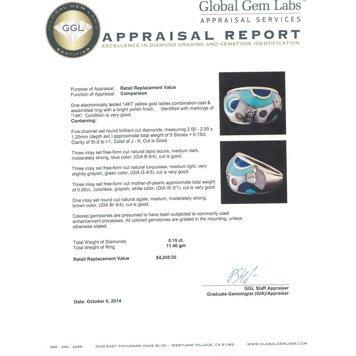 One electronically tested 14KT yellow gold ladies combination cast & assembled ring with a bright polish finish. Identified with markings of "14K". Condition is very good. Containing: Five channel set round brilliant cut diamonds, measuring 2.00 - 2.00 x 1.20mm (depth est.) approximate total weight of 5 Stones = 0.15ct. Clarity: SI-2 to I-1. Color: J - K, Cut is Good. Three inlay set free-form cut natural lapis lazulis, medium dark, moderately strong, blue color, (GIA B 6/4), cut is good. Three inlay set free-form cut natural turquoises, medium light, very slightly grayish, green color, (GIA G 4/3), cut is very good. Three inlay set free-form cut mother-of-pearls, colorless, grayish, white color, (GIA W 0/1), cut is very good. One inlay set round cut natural agate, medium, moderately strong, brown color, (GIA Br 5/4), cut is good. Colored gemstones are presumed to have been subjected to commonly used enhancement processes. All colored gemstones are graded in the mounting, unless otherwise stated. Total Weight of Diamonds 0.15ct. Total Weight of Ring 11.40 grams. GGL Appraised at $4,205.00.
