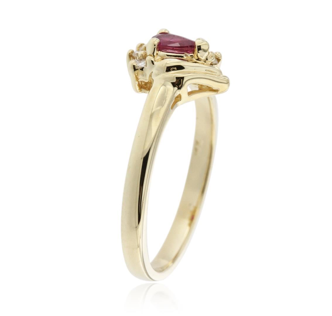 One ring featuring: 14KT yellow gold weighing 3.31 grams containing one pear shaped ruby center weighing 0.26ct and round cut diamonds weighing a total of 0.10ct.