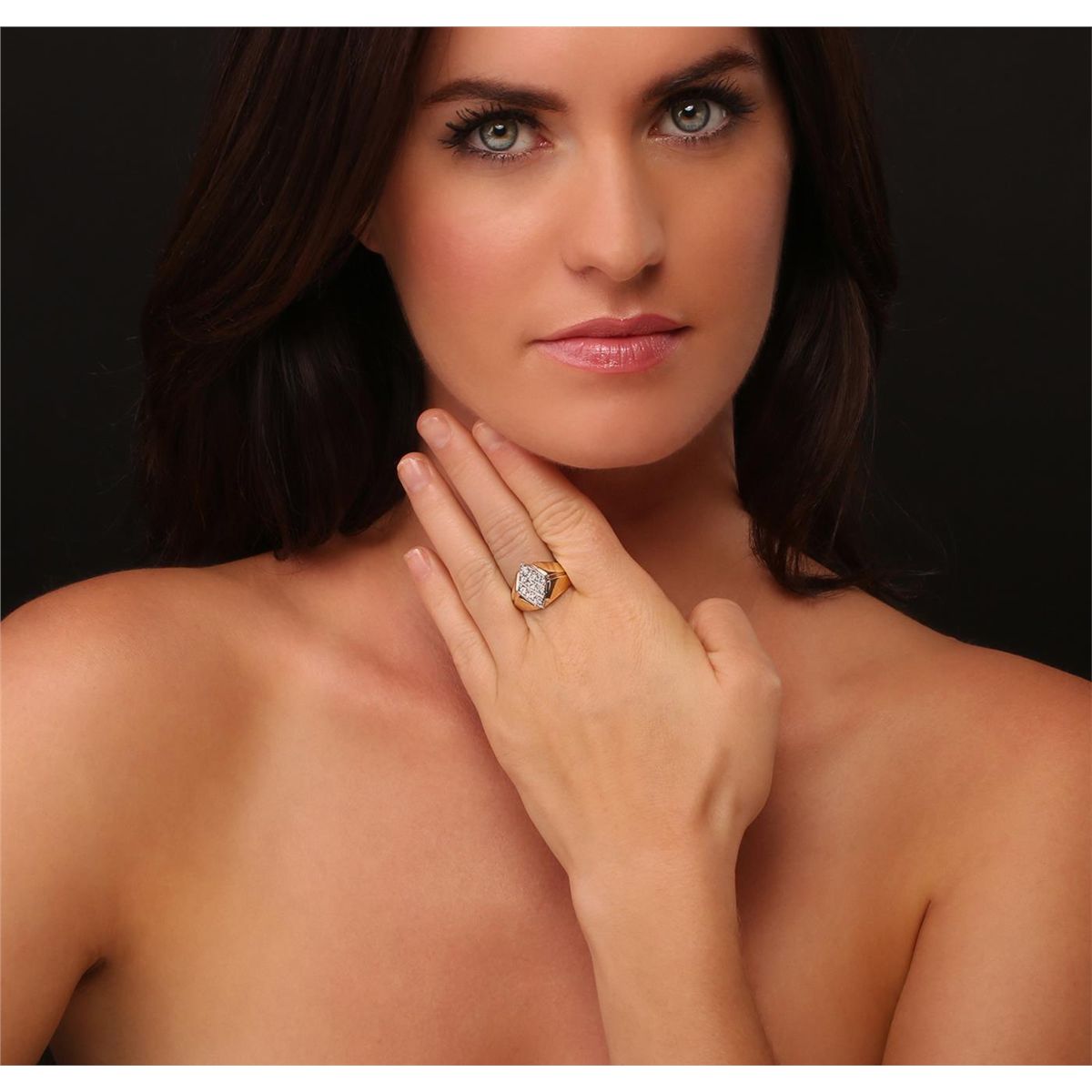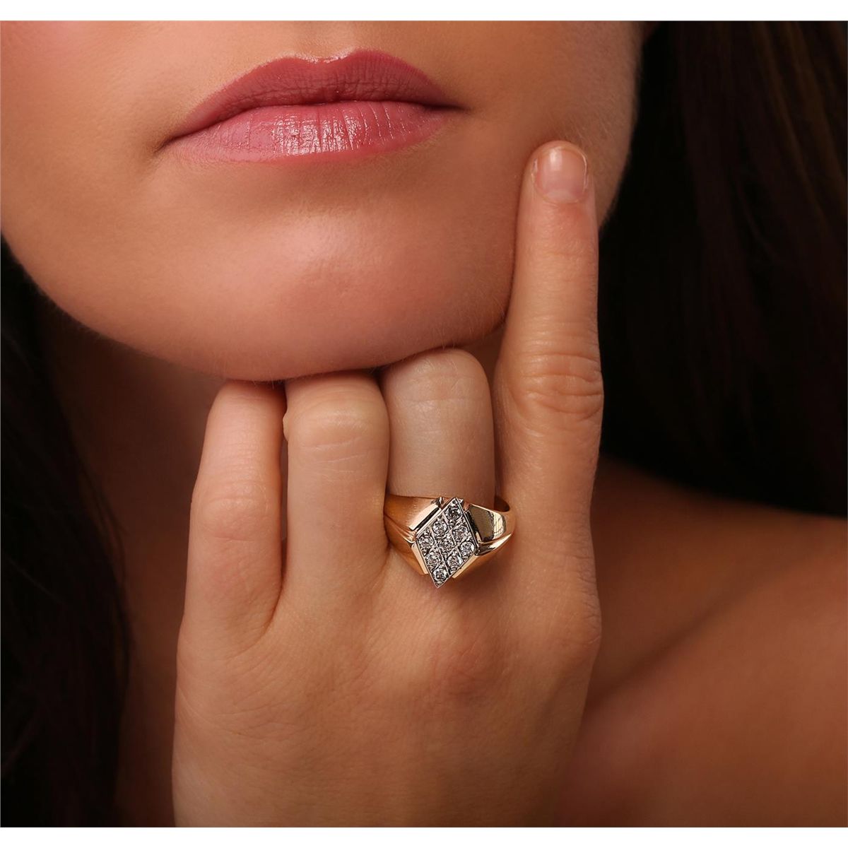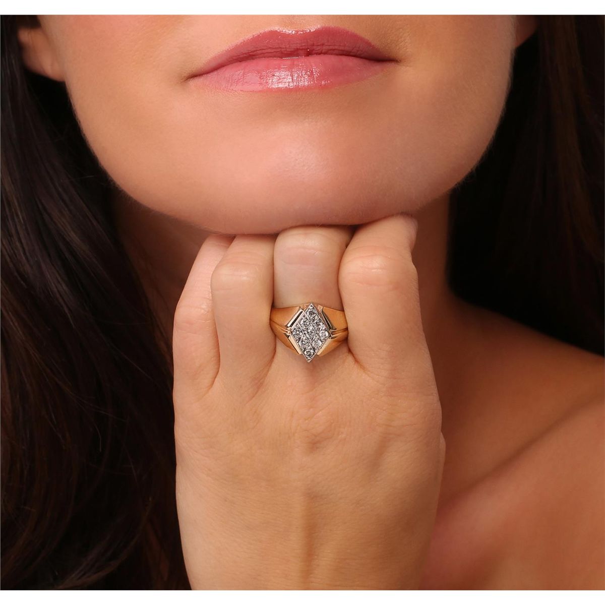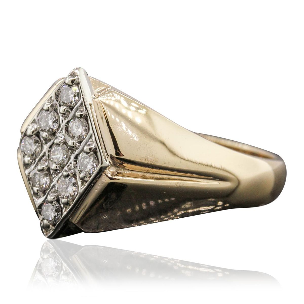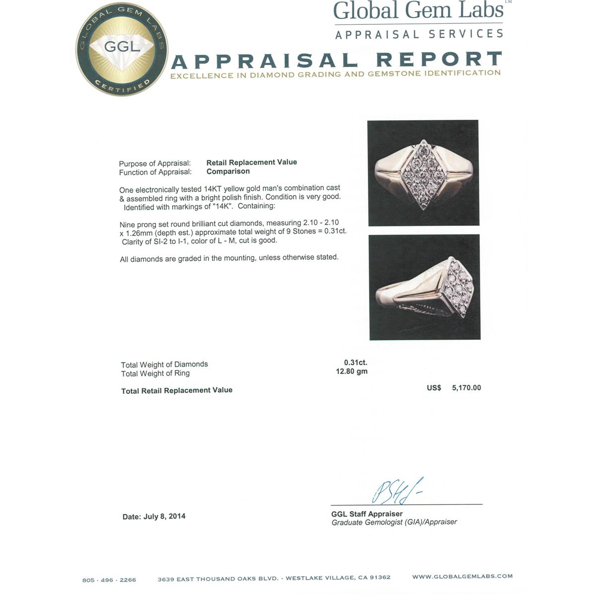 One electronically tested 14KT yellow gold man's combination cast & assembled ring with a bright polish finish. Condition is very good. Identified with markings of "14K". Containing: Nine prong set round brilliant cut diamonds, measuring 2.10 - 2.10 x 1.26mm (depth est.) approximate. Total Weight of 9 Stones = 0.31ct. Clarity: SI-2 to I-1. Color: L - M, Cut is Good. All diamonds are graded in the mounting, unless otherwise stated. Total Weight of Diamonds 0.31ct. Total Weight of Ring 12.80 grams. GGL Appraised at $5,170.00.