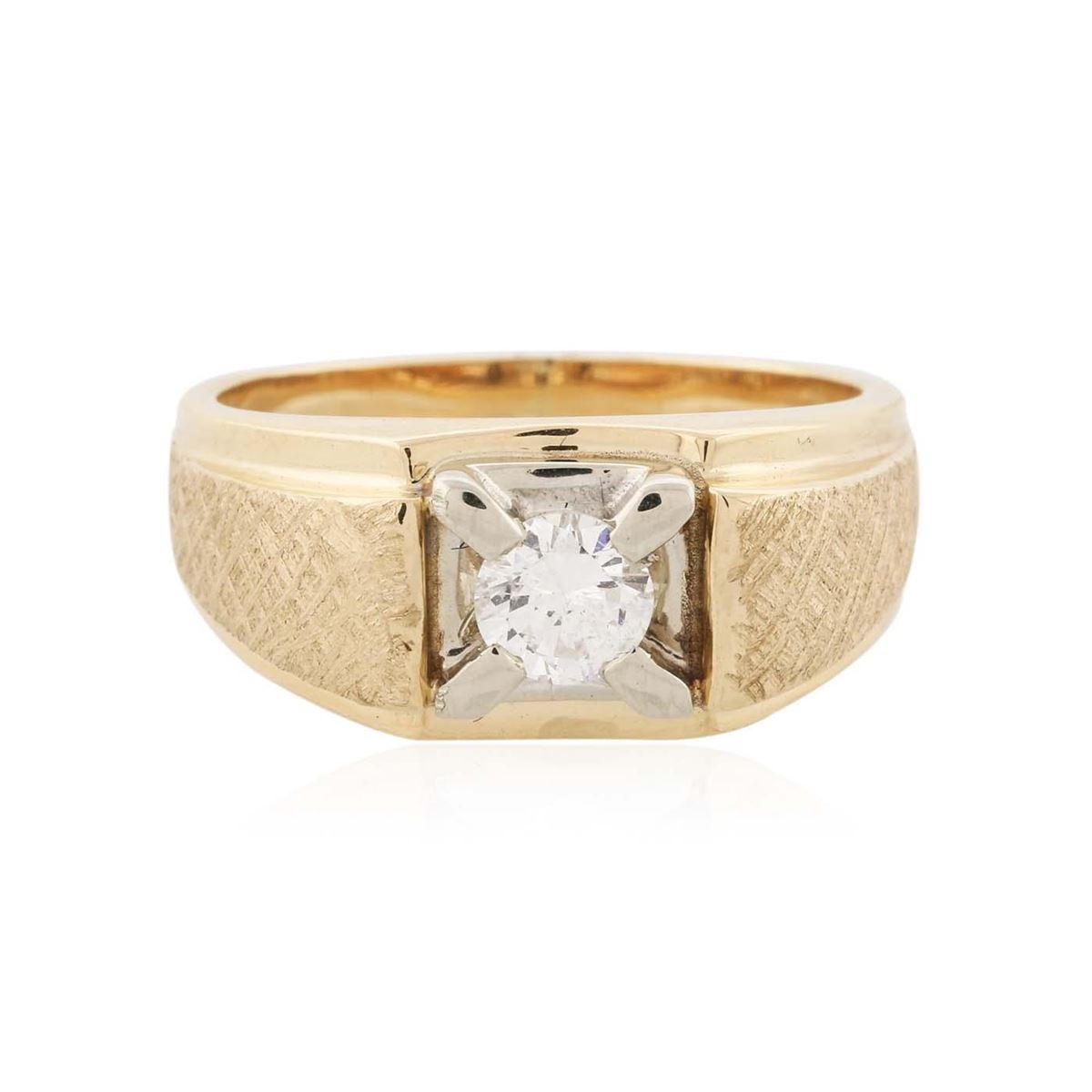 One electronically tested 14KT yellow gold ladies cast solitaire ring with a hammered finish. Condition is very good. Identified with markings of "14K". Containing: One prong set round brilliant cut diamond, measuring 4.30 - 4.30 x 3.00mm (depth est.) approximate weight of 0.34ct. Clarity: SI-2. Color: I, Cut is Good. All diamonds are graded in the mounting, unless otherwise stated. Total Weight of Diamonds 0.34ct. Total Weight of Ring 8.60 grams. GGL Appraised at $5,175.00.
