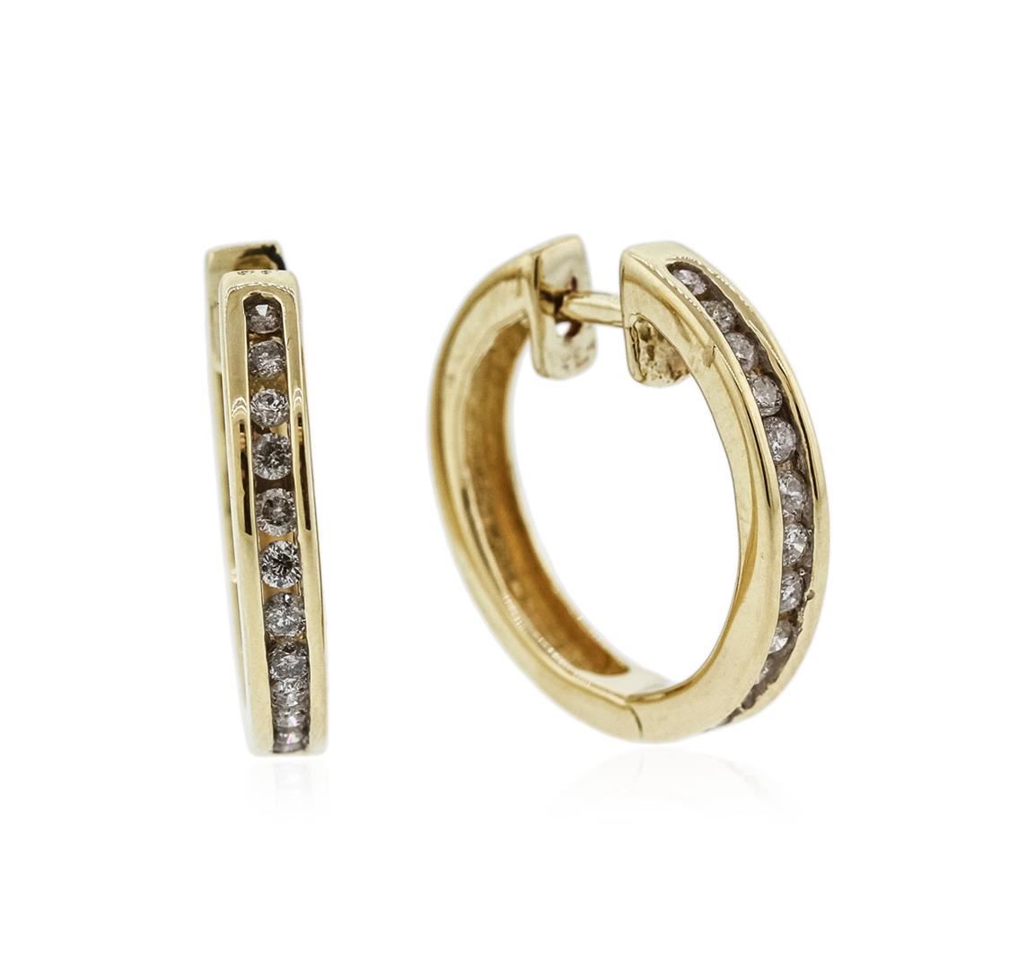 One pair of hoop earrings featuring: 14KT yellow gold weighing 5.40 grams containing diamonds with a total weight of 0.39ct.