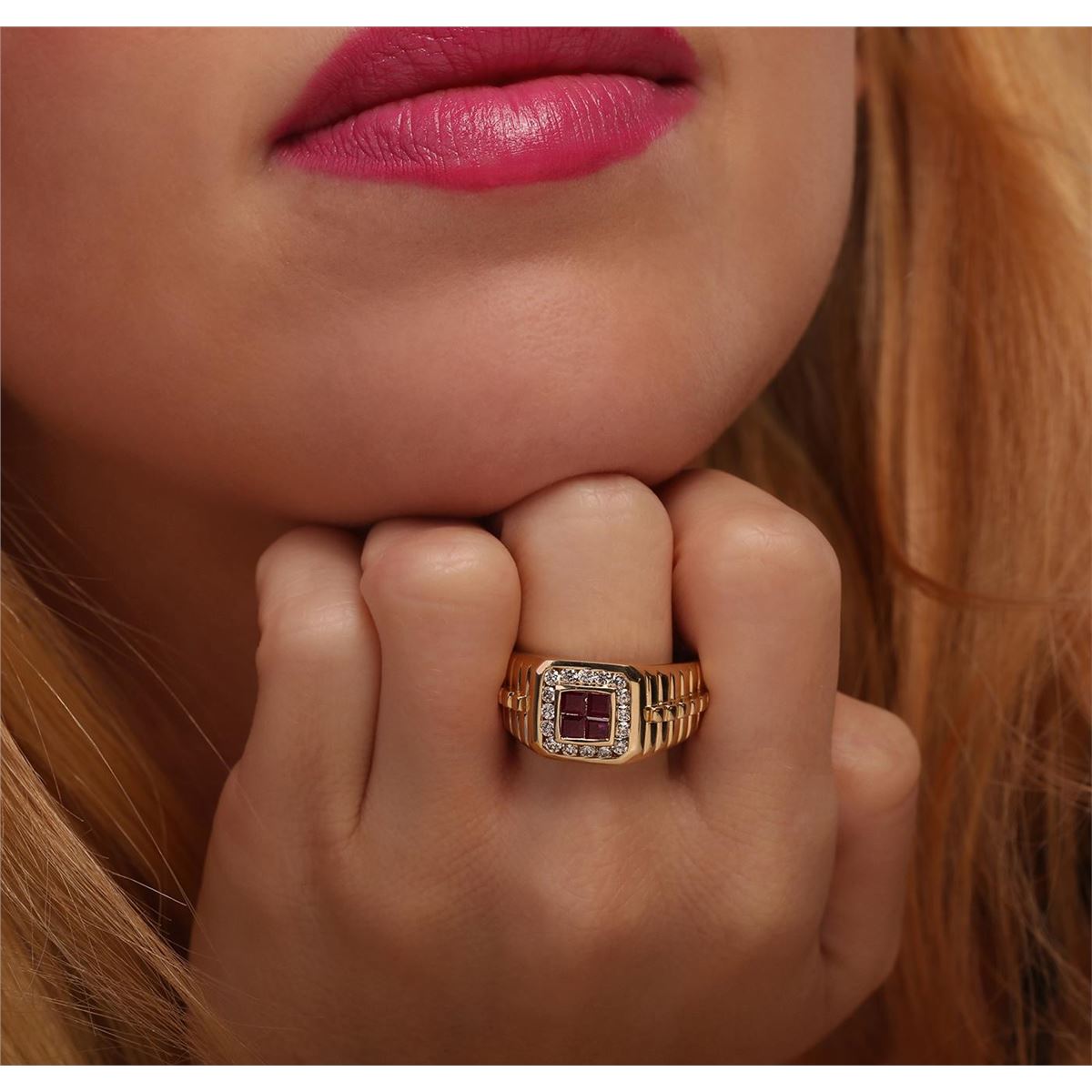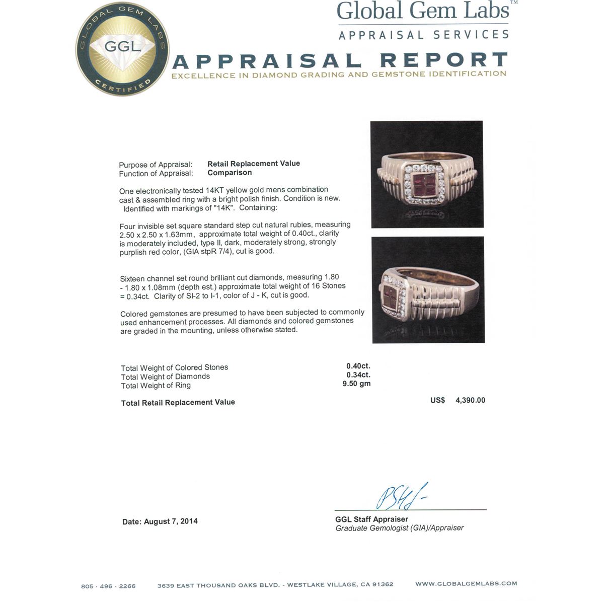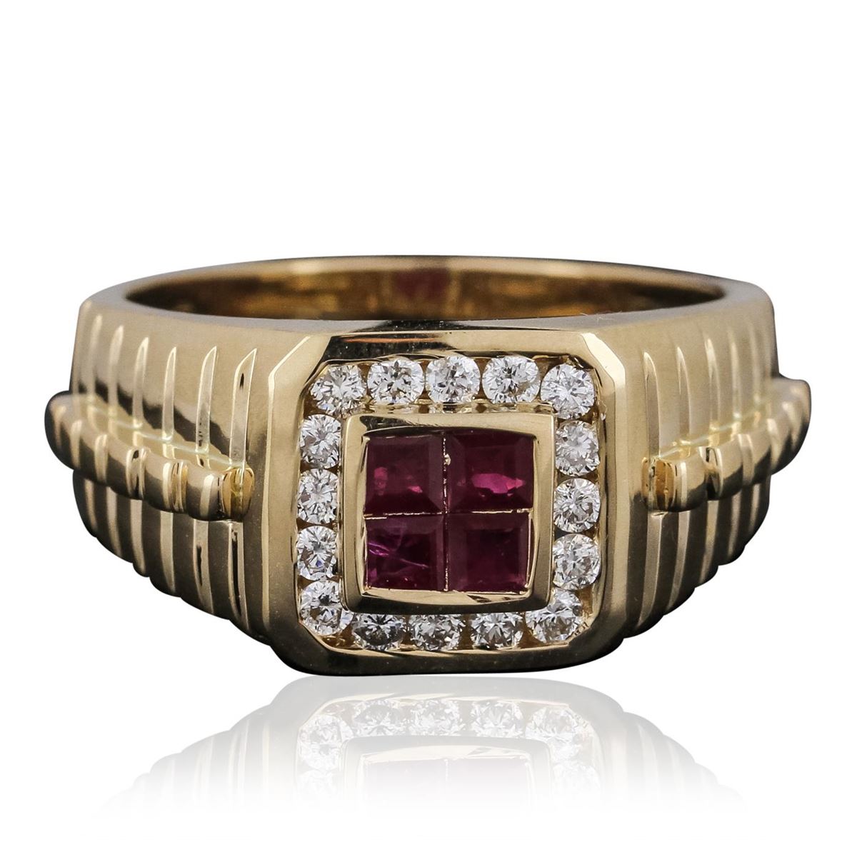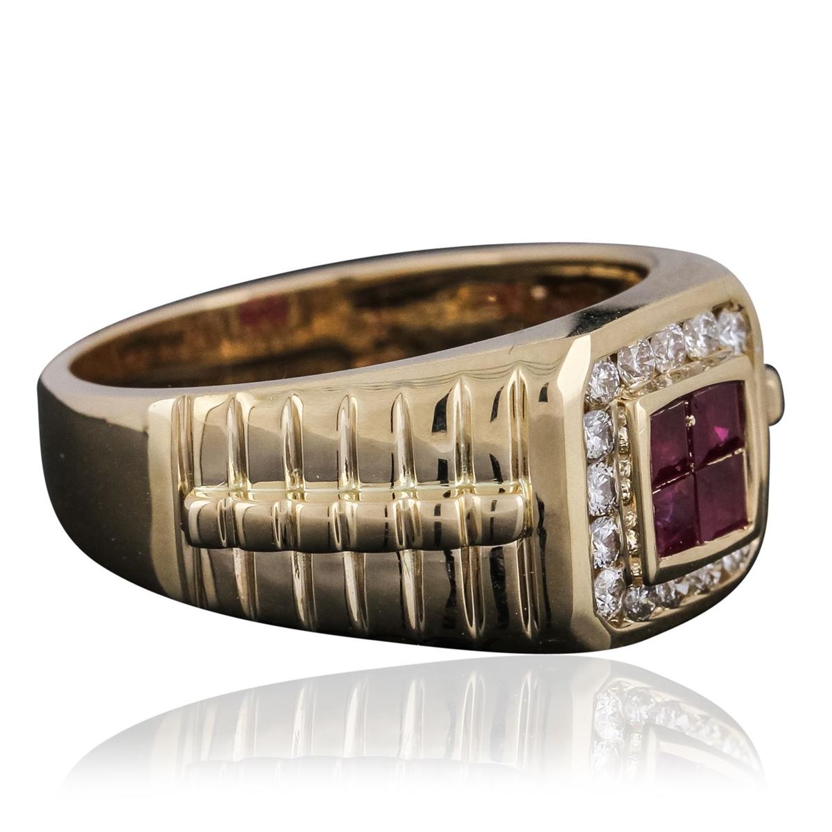 One electronically tested 14KT yellow gold mens combination cast & assembled ring with a bright polish finish. Identified with markings of "14K". Condition is new. Containing: Four invisible set square standard step cut natural rubies, measuring 2.50 x 2.50 x 1.63mm, approximate total weight of 0.40ct., clarity is moderately included, type II, dark, moderately strong, strongly purplish red color, (GIA stpR 7/4), cut is good. Sixteen channel set round brilliant cut diamonds, measuring 1.80 - 1.80 x 1.08mm (depth est.) approximate total weight of 16 Stones = 0.34ct. Clarity: SI-2 to I-1. Color: J - K, Cut is Good. Colored gemstones are presumed to have been subjected to commonly used enhancement processes. All diamonds and colored gemstones are graded in the mounting, unless otherwise stated. Total Weight of Colored Stones 0.40ct. Total Weight of Diamonds 0.34ct. Total Weight of Ring 9.50 grams. GGL Appraised at $4,390.00.