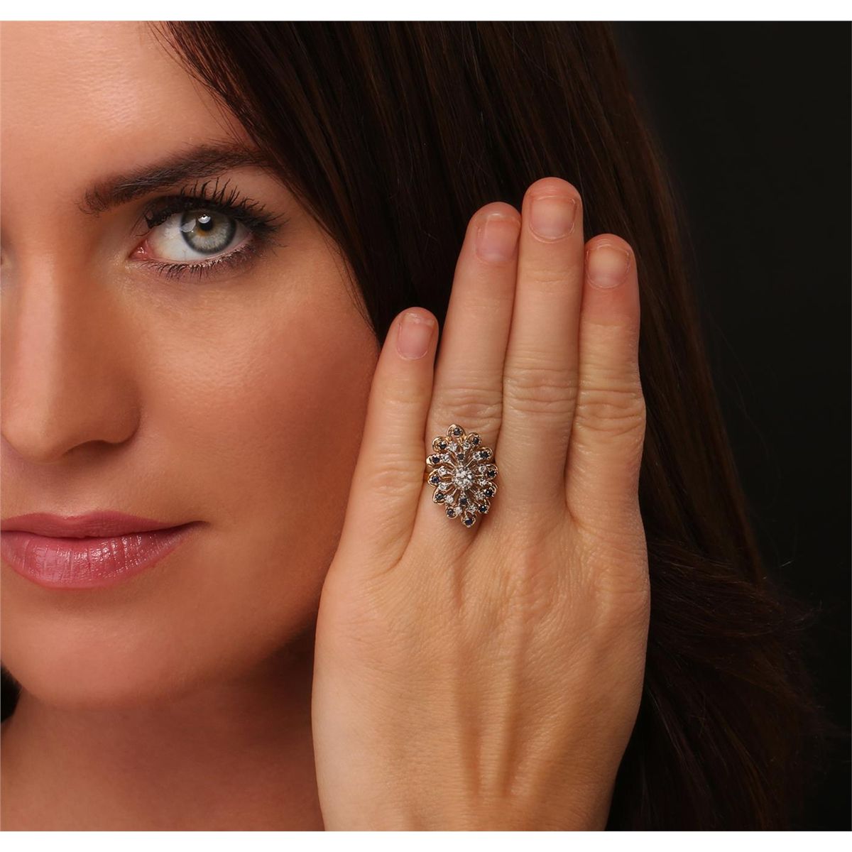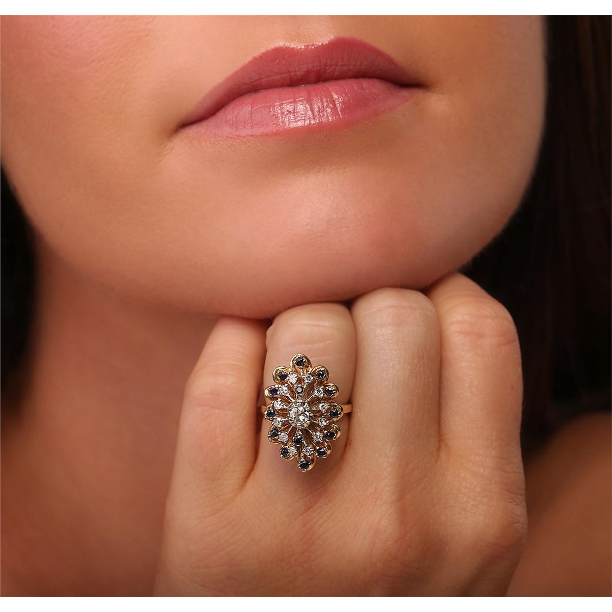 One electronically tested 14KT yellow gold Ladies combination cast & assembled ring with a bright polish finish. Condition is very good. Identified with markings of "14K". Containing: One prong set Old European cut diamond, measuring 3.50 - 3.50 x 2.17mm (depth est.) approximate weight of 0.20ct. Clarity: SI-2. Color: K. Twelve prong set single cut diamonds, measuring 1.70 - 1.70 x 1.02mm (depth est.) approximate. Total Weight of 12 Stones = 0.22ct. Clarity: SI-1. Color: G - H. Fourteen prong set round modified brilliant cut natural blue sapphires, measuring 2.00 - 1.80 x 1.24 mm, approximate. Total Weight of 0.56ct., clarity is heavily included, type II, medium, moderately strong, blue color, (GIA B 5/4), cut is good. Colored gemstones are presumed to have been subjected to commonly used enhancement processes. All diamonds and colored gemstones are graded in the mounting, unless otherwise stated. Total Weight of Colored Stones 0.56ct. Total Weight of Diamonds 0.42ct. Total Weight of Ring 8.20 grams. GGL Appraised at $4,345.00.