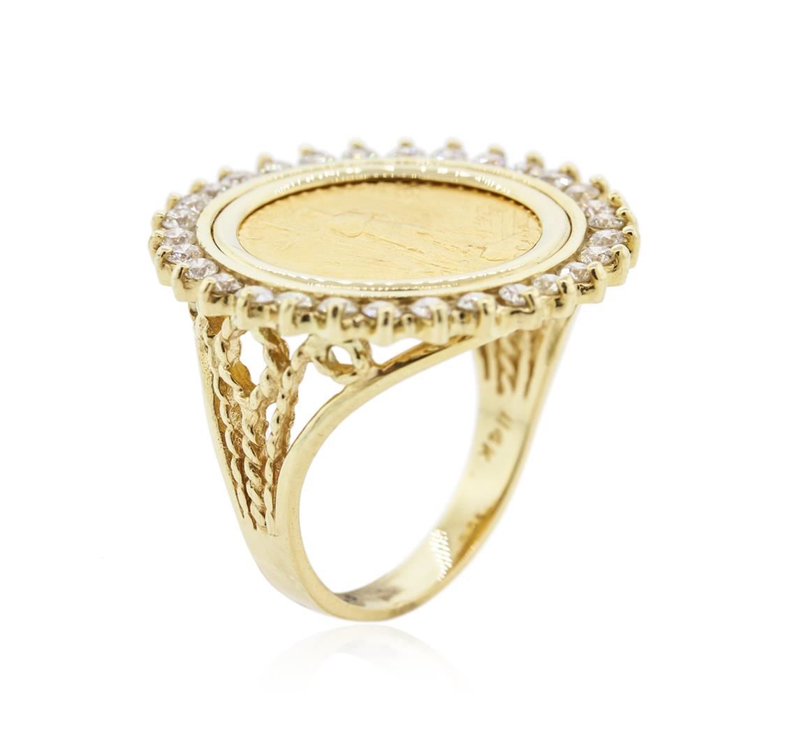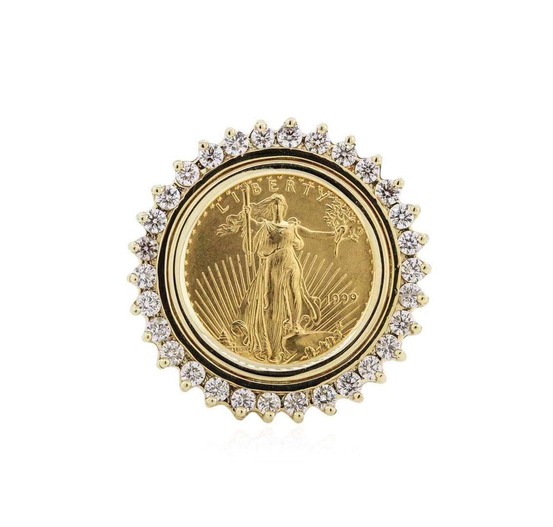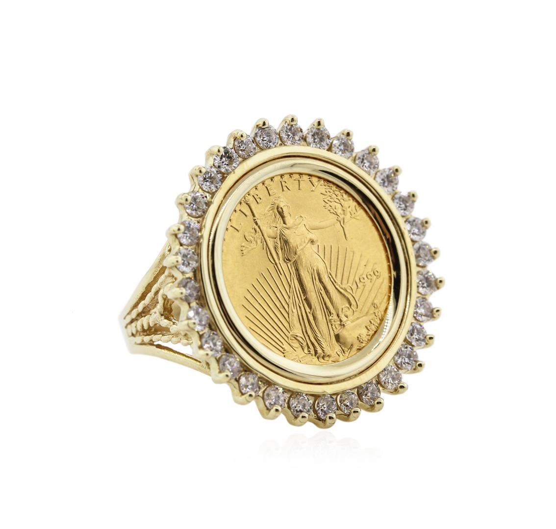 One electronically tested 14KT yellow gold mens cast 1/10oz $5 Liberty Coin 1999 diamond ring with a bright polish finish. Identified with markings of "14K". Condition is new. Containing: Thirty prong set round brilliant cut diamonds, measuring 1.60 - 1.60 x 0.96mm (depth est.) approximate total weight of 30 Stones = 0.45ct. Clarity: SI-2 to I-1. Color: J - K, Cut is Good. Diamonds are graded in the mounting, unless otherwise stated. Total Weight of Diamonds 0.45ct. Total Weight of Diamond Ring 8.40 grams. GGL Appraised at $2,665.00.