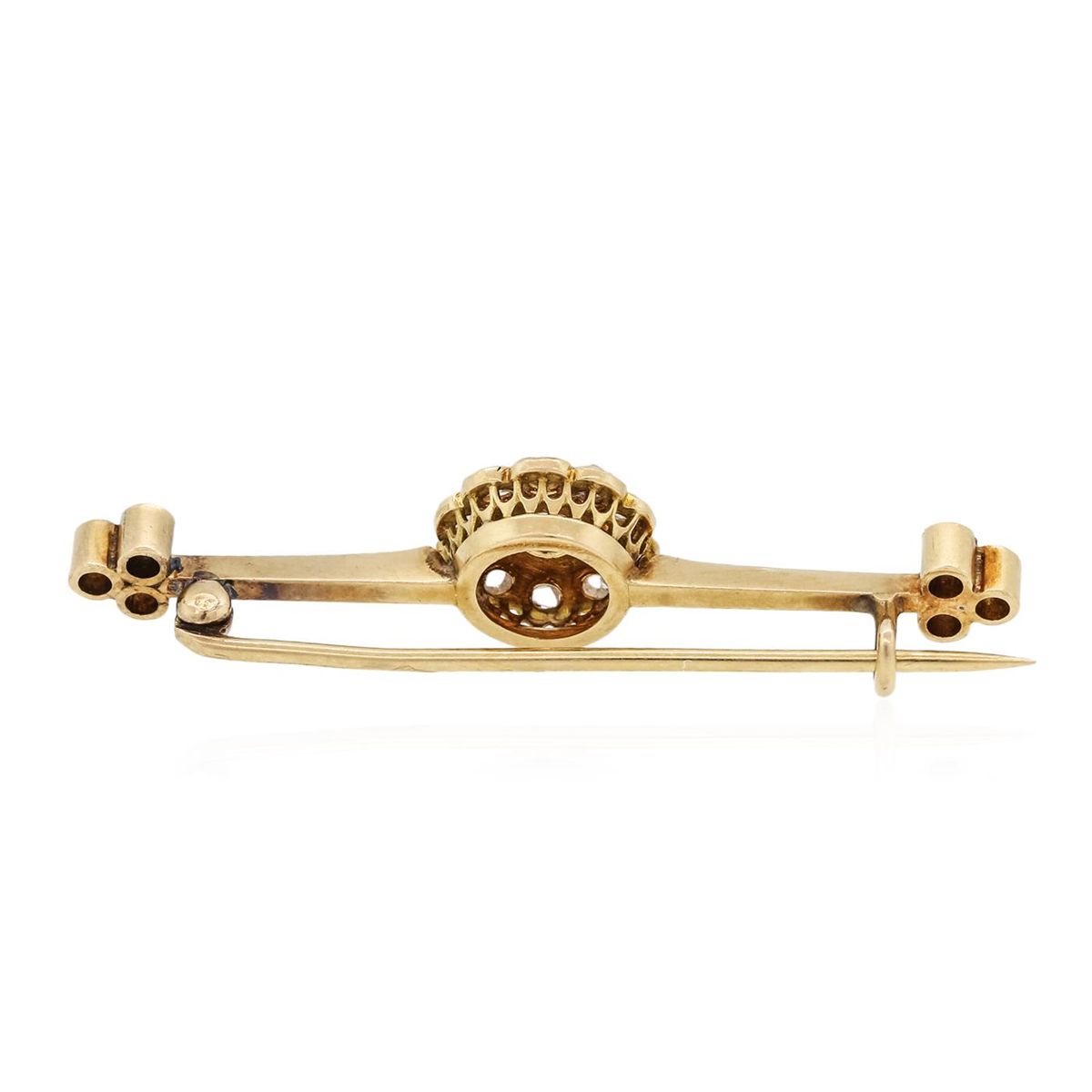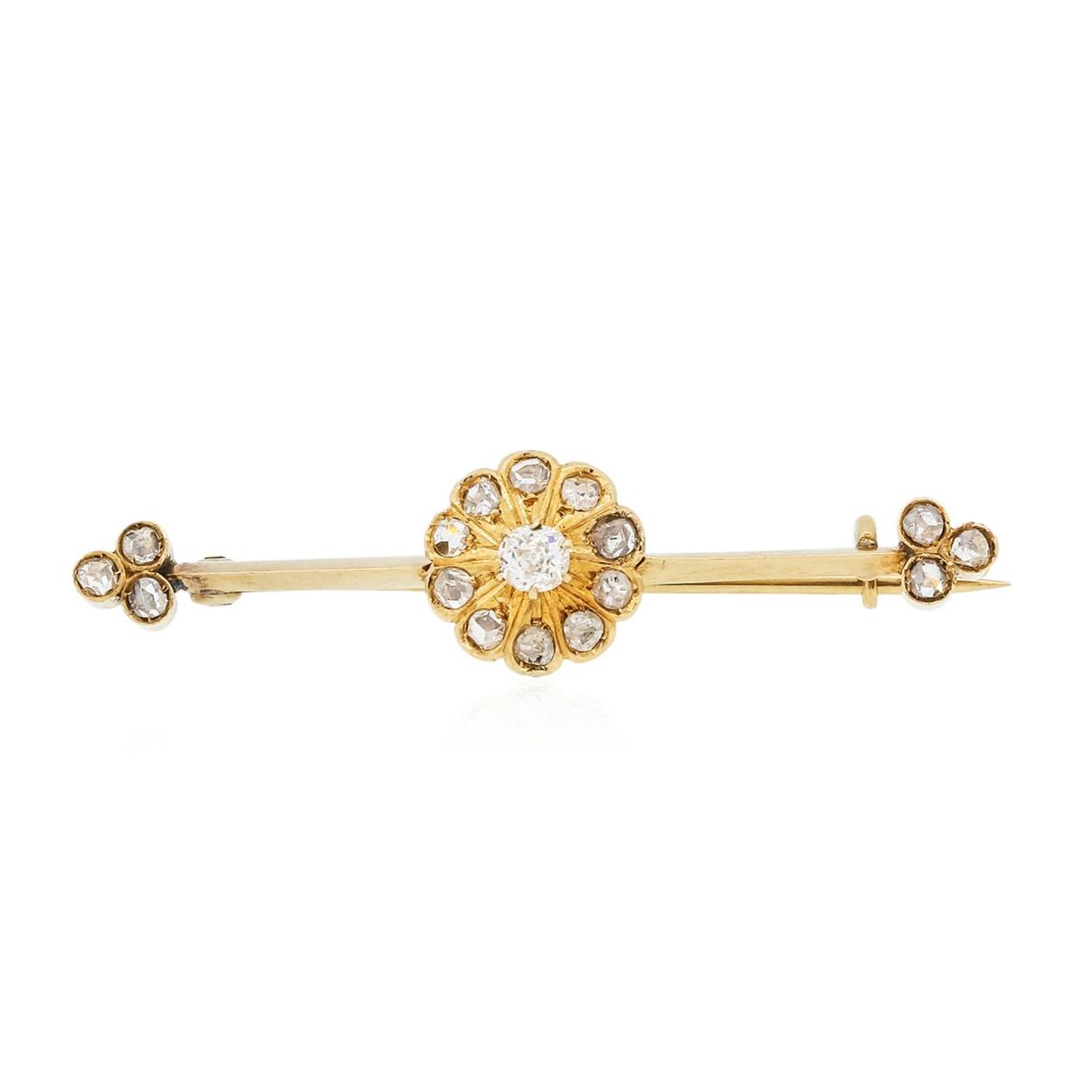 One electronically tested 14KT yellow gold ladies hand made antique pin with a bright polish finish. Condition is very good. Containing: One prong set old mine cut diamond, measuring 3.50 - 3.20 x 2.08mm (depth est.) approximate weight of 0.14ct. Clarity: SI-2. Color: J. Sixteen bezel set rose cut diamonds, measuring 2.00 - 2.00 x 1.24mm (depth est.) approximate total weight of 16 Stones = 0.34ct. Clarity: I-1 to I-2. Color: G - H. All diamonds are graded in the mounting, unless otherwise stated. Total Weight of Diamonds 0.48ct. Total Weight of Pin 5.00 grams. GGL Appraised at $2,330.00.