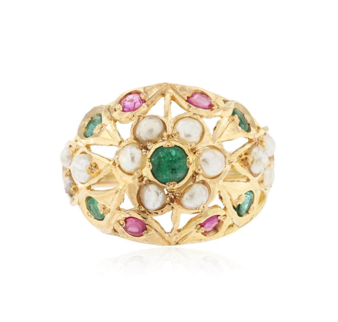 One ring featuring: 14KT yellow gold weighing 4.98 grams containing emeralds with a total weight of 0.50ct, rubies with a total weight of 0.24ct, and pearls.