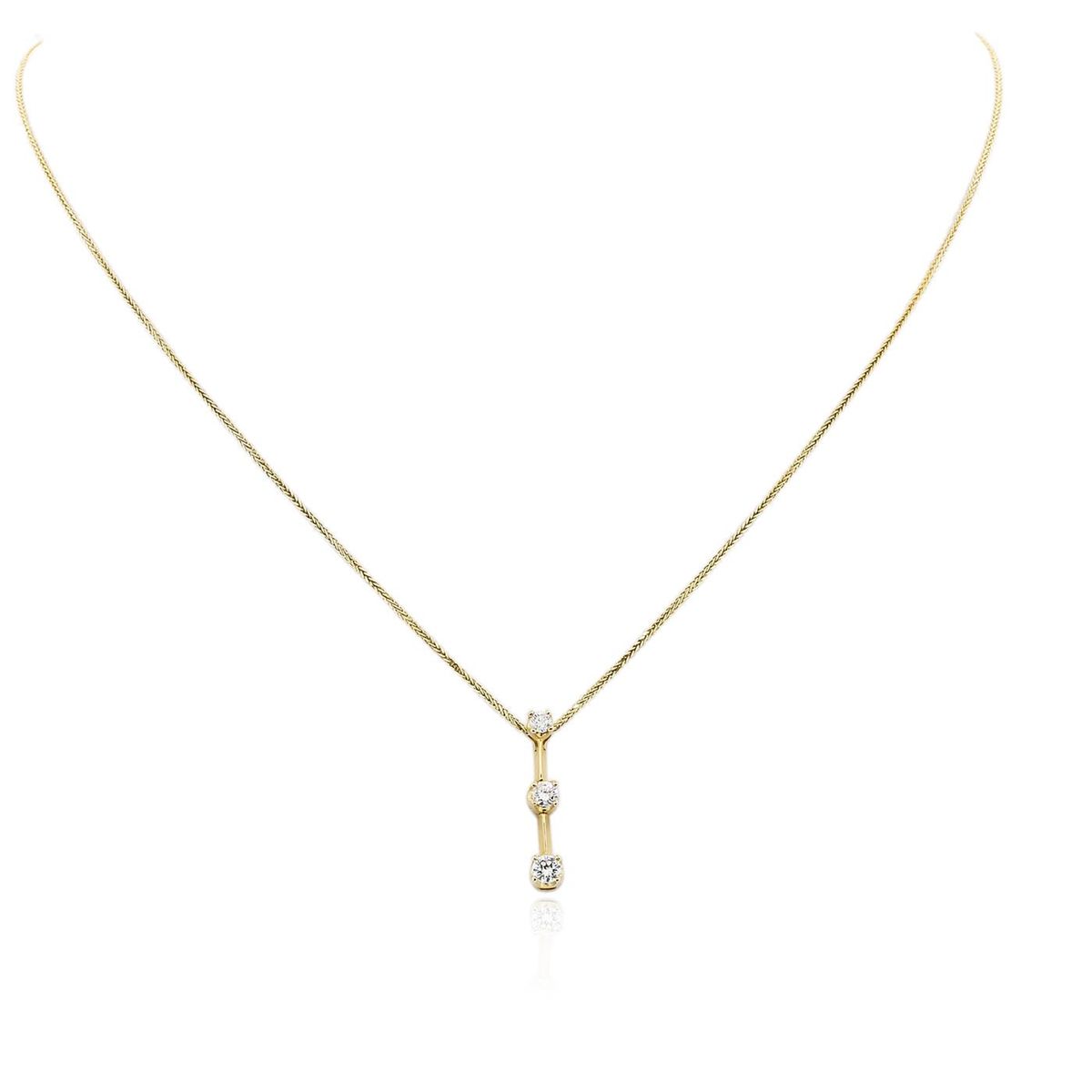 One electronically tested 14KT yellow gold ladies cast & assembled three diamond pendant with chain. The pendant is supported by an eighteen inch length 14KT yellow gold designer style chain, terminating in a lobster claw clasp. Bright polish finish. Trademark is KEEPSAKE. Identified with markings of "14K". Condition is new, good workmanship. Containing: One prong set round brilliant cut diamond, measuring 2.80 - 2.79 x 1.60mm (depth est.) approximate weight of 0.10ct. Graded in the setting. Clarity: I-1. Color: 57.1%. Table 64.6%. One prong set round brilliant cut diamond, measuring 3.40 - 3.35 x 2.05mm (depth est.) approximate weight of 0.20ct. Graded in the setting. Clarity: I-1. Color: 60.7%. Table 65.1%. One prong set round brilliant cut diamond, measuring 3.65 - 3.60 x 2.30mm (depth est.) approximate weight of 0.25ct with a faint blue fluorescence. Graded in the setting. Clarity: SI-2. Color: 63.4%. Table 66.1%. Total Weight of Diamonds 0.55ct. Total Weight of Pendant With Chain 2.93 grams. AIG Appraised at $2,415.00.