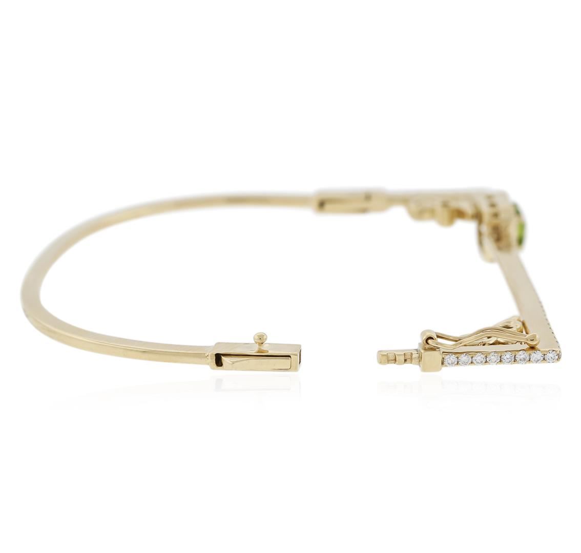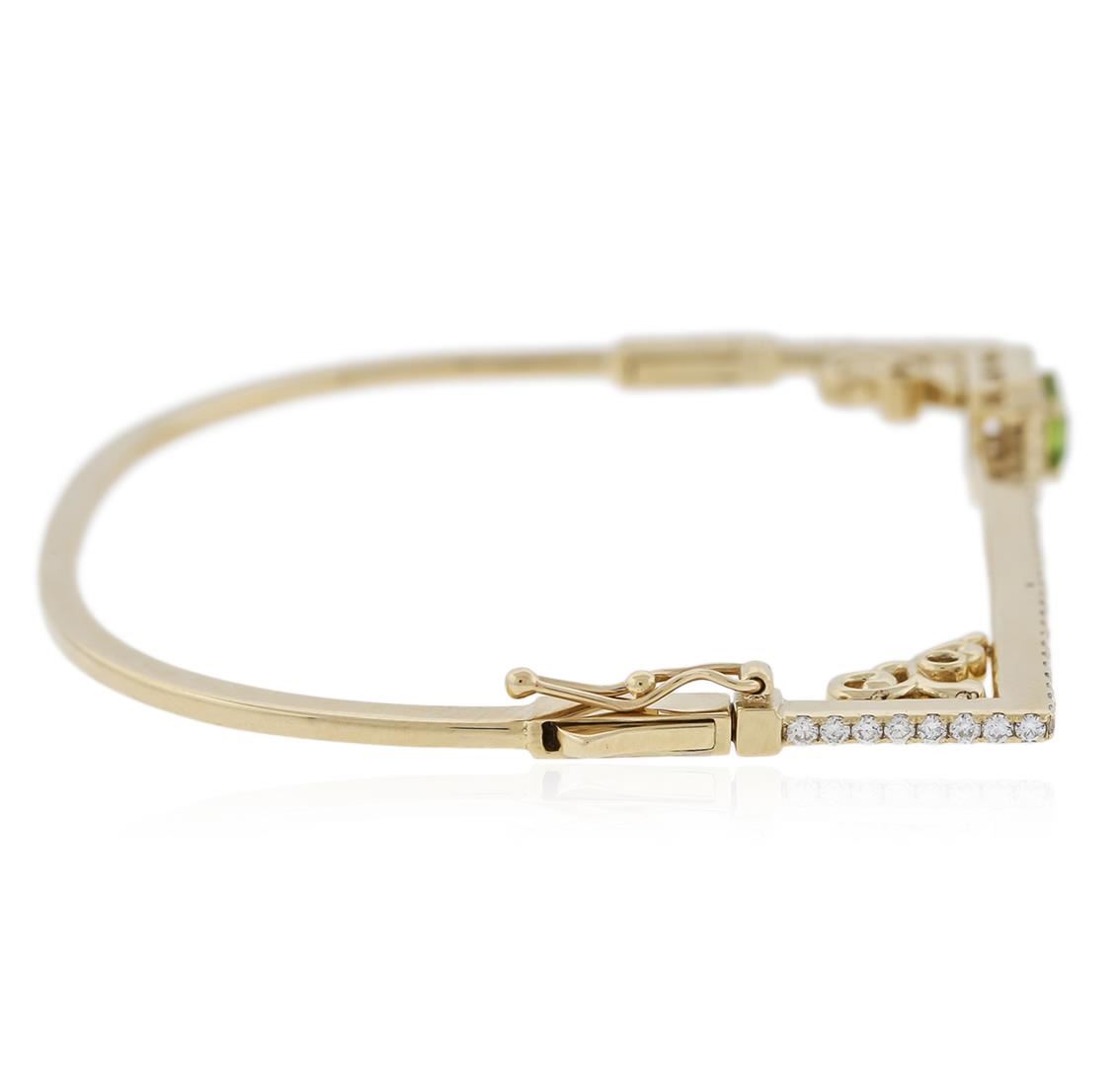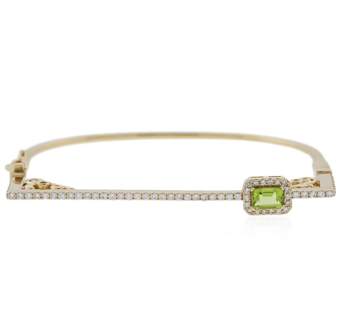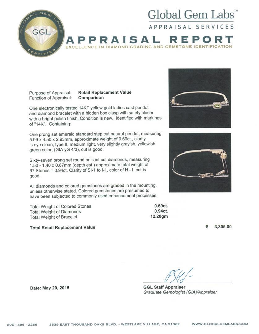 One electronically tested 14KT yellow gold ladies cast peridot and diamond bracelet with a hidden box clasp with safety closer with a bright polish finish. Identified with markings of "14K". Condition is new. Containing: One prong set emerald standard step cut natural peridot, measuring 5.99 x 4.50 x 2.93mm, approximate weight of 0.69ct., clarity is eye clean, type II, medium light, very slightly grayish, yellowish green color, (GIA yG 4/3), cut is good. Sixty-Seven prong set round brilliant cut diamonds, measuring 1.50 - 1.40 x 0.87mm (depth est.) approximate total weight of 67 Stones = 0.94ct. Clarity: SI-1 to I-1. Color: H - I, Cut is Good. All diamonds and colored gemstones are graded in the mounting, unless otherwise stated. Colored gemstones are presumed to have been subjected to commonly used enhancement processes. Total Weight of Colored Stones 0.69ct. Total Weight of Diamonds 0.94ct. Total Weight of Bracelet 12.20 grams. GGL Appraised at $3,305.00.