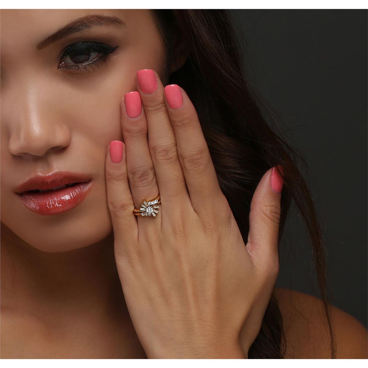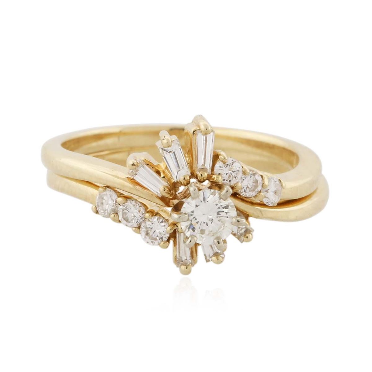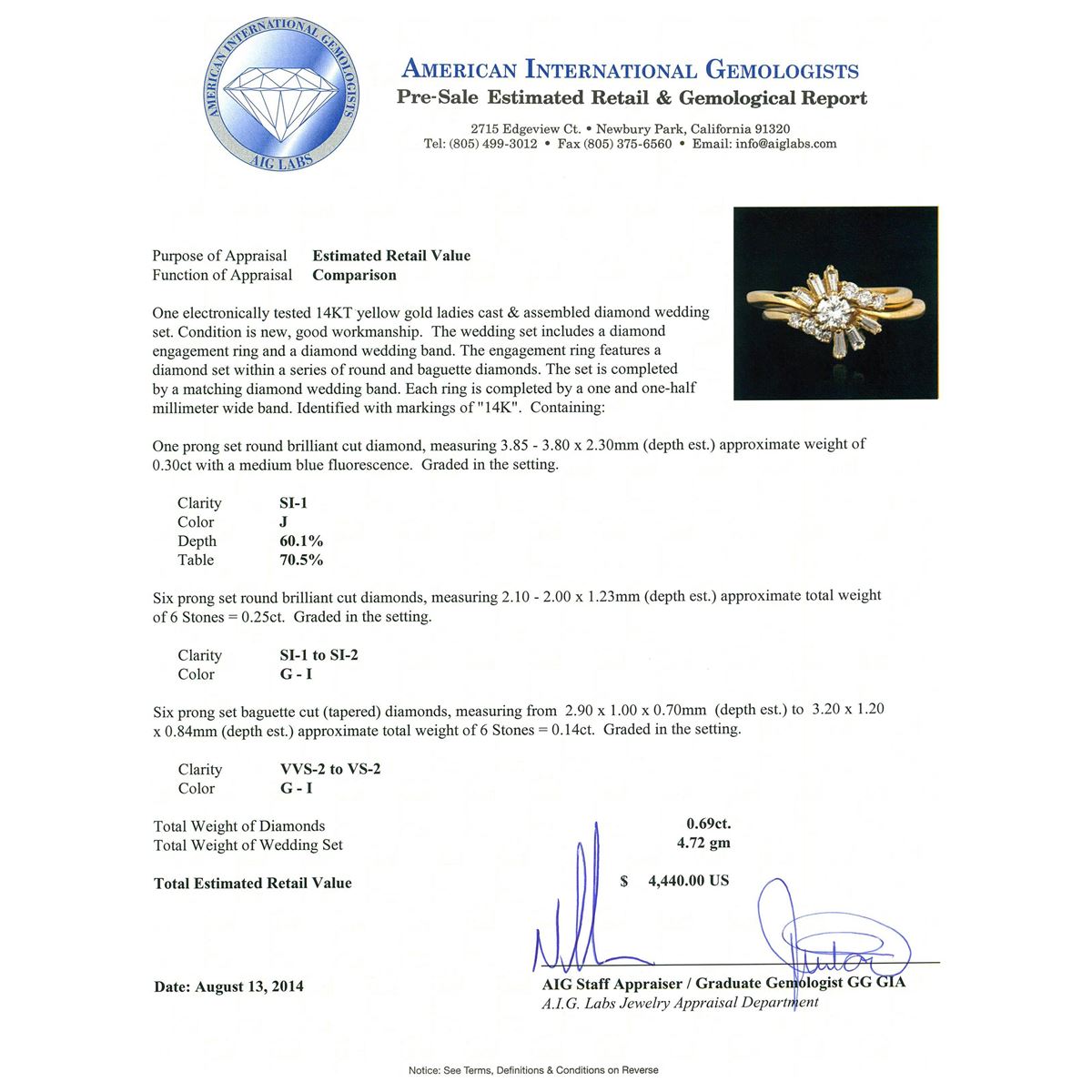 One electronically tested 14KT yellow gold ladies cast & assembled diamond wedding set. The wedding set includes a diamond engagement ring and a diamond wedding band. The engagement ring features a diamond set within a series of round and baguette diamonds. The set is completed by a matching diamond wedding band. Each ring is completed by a one and one-half millimeter wide band. Identified with markings of "14K". Condition is new, good workmanship. Containing: One prong set round brilliant cut diamond, measuring 3.85 - 3.80 x 2.30mm (depth est.) approximate weight of 0.30ct with a medium blue fluorescence. Graded in the setting. Clarity: SI-1. Color: J. Depth 60.1%. Table 70.5%. Six prong set round brilliant cut diamonds, measuring 2.10 - 2.00 x 1.23mm (depth est.) approximate total weight of 6 Stones = 0.25ct. Graded in the setting. Clarity: SI-1 to SI-2. Color: G - I Six prong set baguette cut (tapered) diamonds, measuring from 2.90 x 1.00 x 0.70mm (depth est.) to 3.20 x 1.20 x 0.84mm (depth est.) approximate total weight of 6 Stones = 0.14ct. Graded in the setting. Clarity: VVS-2 to VS-2. Color: G - I. Total Weight of Diamonds 0.69ct. Total Weight of Wedding Set 4.72 grams. AIG Appraised at $4,440.00.