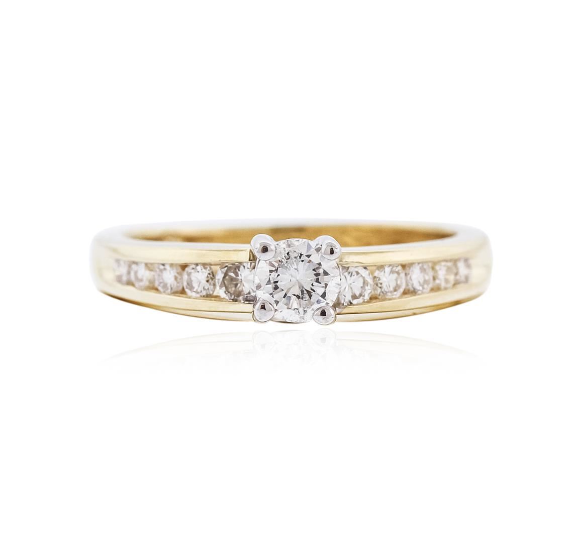 One wedding ring set featuring: 14KT yellow gold weighing 5.70 grams containing one center diamond with a total weight of 0.25ct and diamonds with a total weight of 0.45ct.