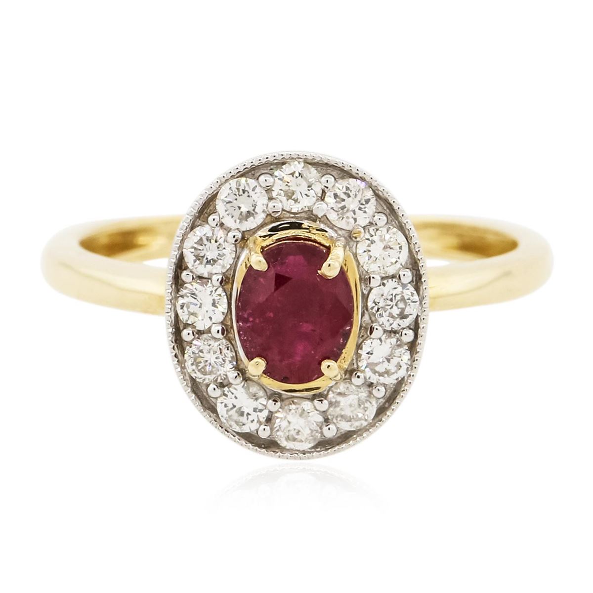 One 14KT yellow gold ruby and diamond ring weighing approx. 2.70 grams. Containing: one oval cut natural ruby, pinkish red (GIA rR 5/4) hue, medium tone, moderately strong saturation, moderately included - type II (see below). 12 round brilliant cut diamonds total approx. 0.39 carat, measuring approx. 2.00 mm, with an average quality of SI3-I1; H-1 color grade. Gem type: natural ruby. Shape: oval cut. Carat weight: approx. 0.74 carat. Measurement: approx. 5.50 x 4.47 mm. Clarity: moderately included. Metal content: 14KT yellow gold. Setting: center is prong set, side stones are pave set. Comments: ruby indicates laboratory high temperature heat treatment, with glass and flux additives. GLA Appraised at $2,694.00.