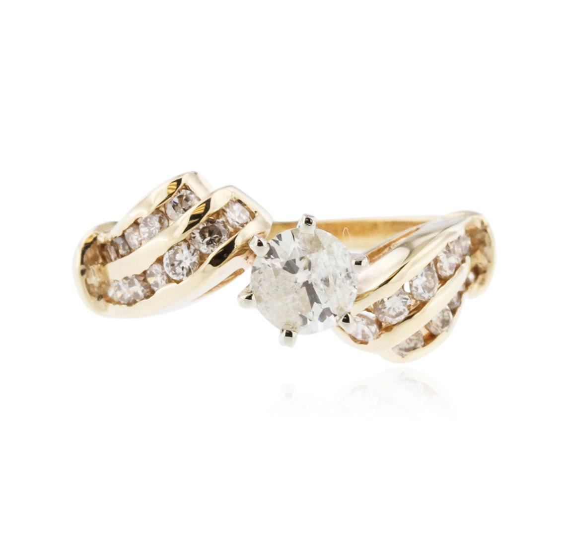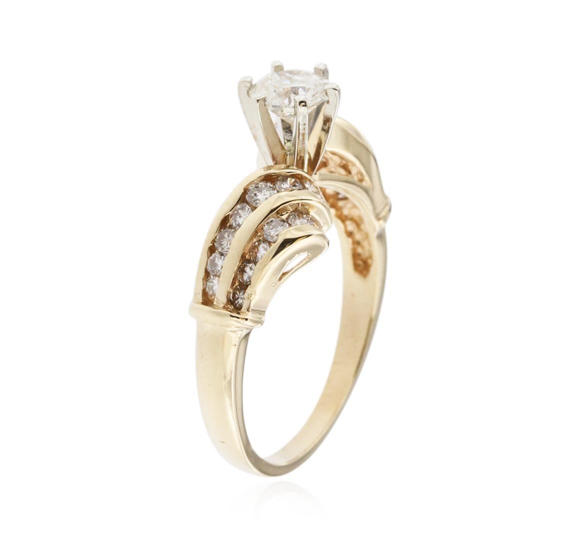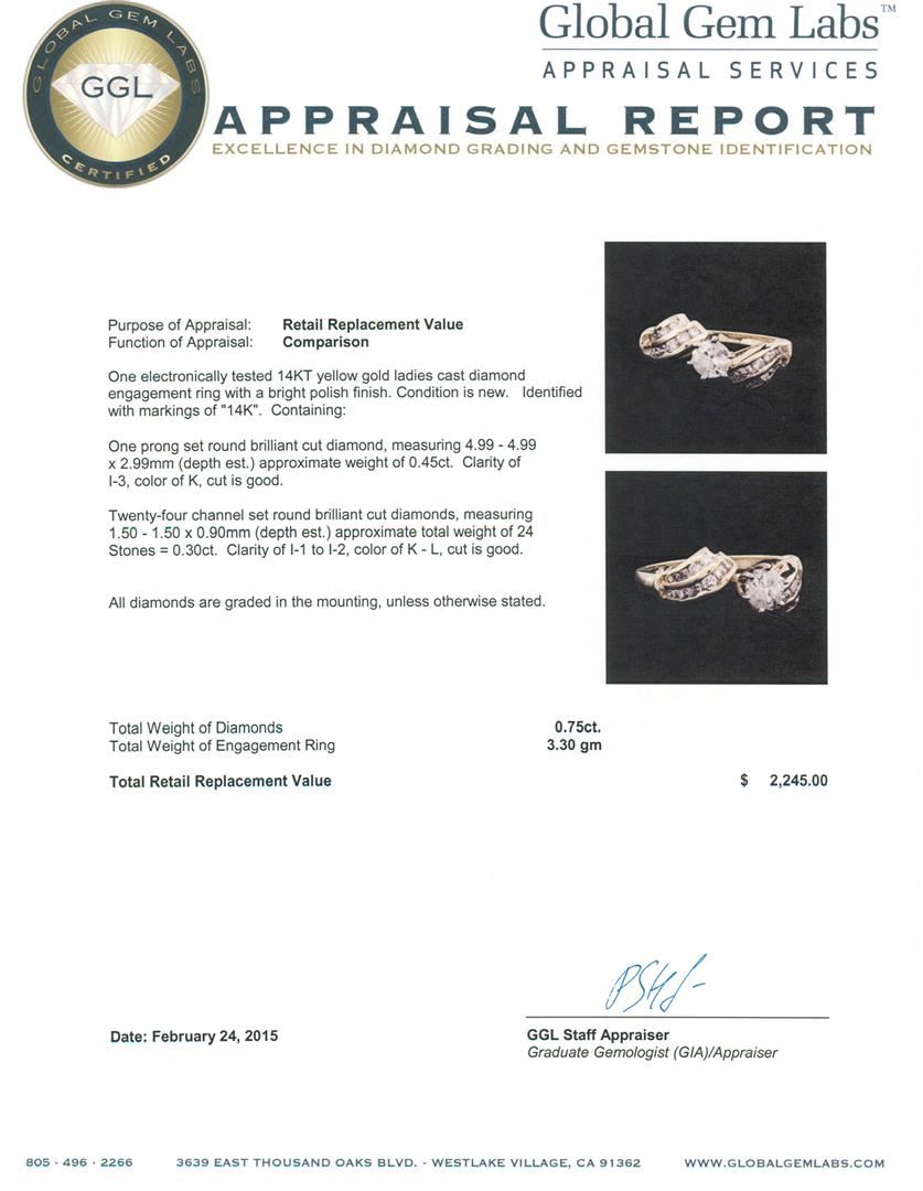 One electronically tested 14KT yellow gold ladies cast diamond engagement ring with a bright polish finish. Identified with markings of "14K". Condition is new. Containing: One prong set round brilliant cut diamond, measuring 4.99 - 4.99 x 2.99mm (depth est.) approximate weight of 0.45ct. Clarity: I-3. Color: K, Cut is Good. Twenty-Four channel set round brilliant cut diamonds, measuring 1.50 - 1.50 x 0.90mm (depth est.) approximate total weight of 24 Stones = 0.30ct. Clarity: I-1 to I-2. Color: K - L, Cut is Good. All diamonds are graded in the mounting, unless otherwise stated. Total Weight of Diamonds 0.75ct. Total Weight of Engagement Ring 3.30 grams. GGL Appraised at $2,245.00.