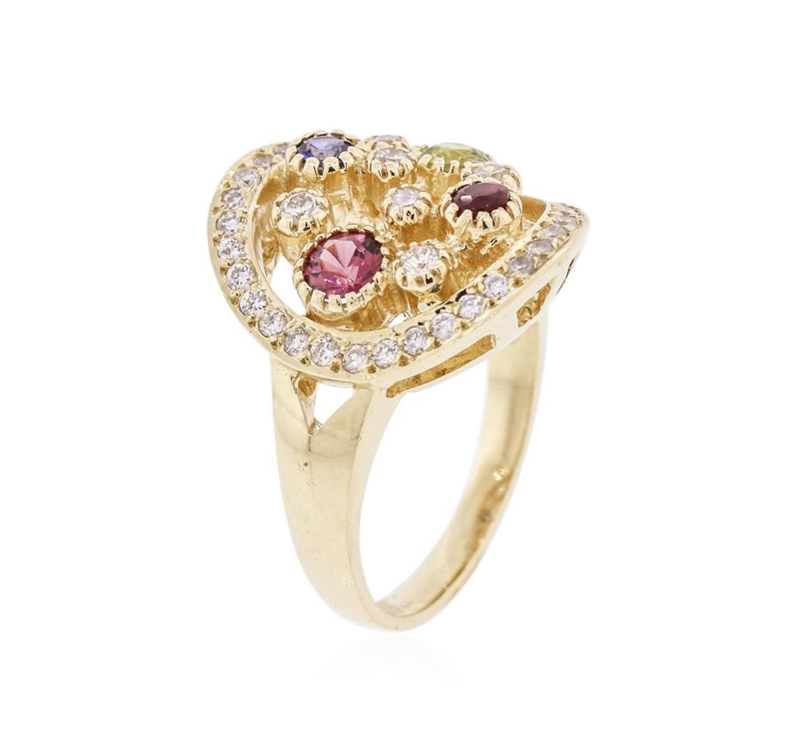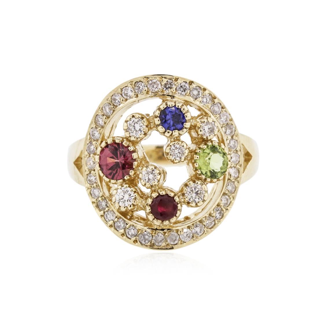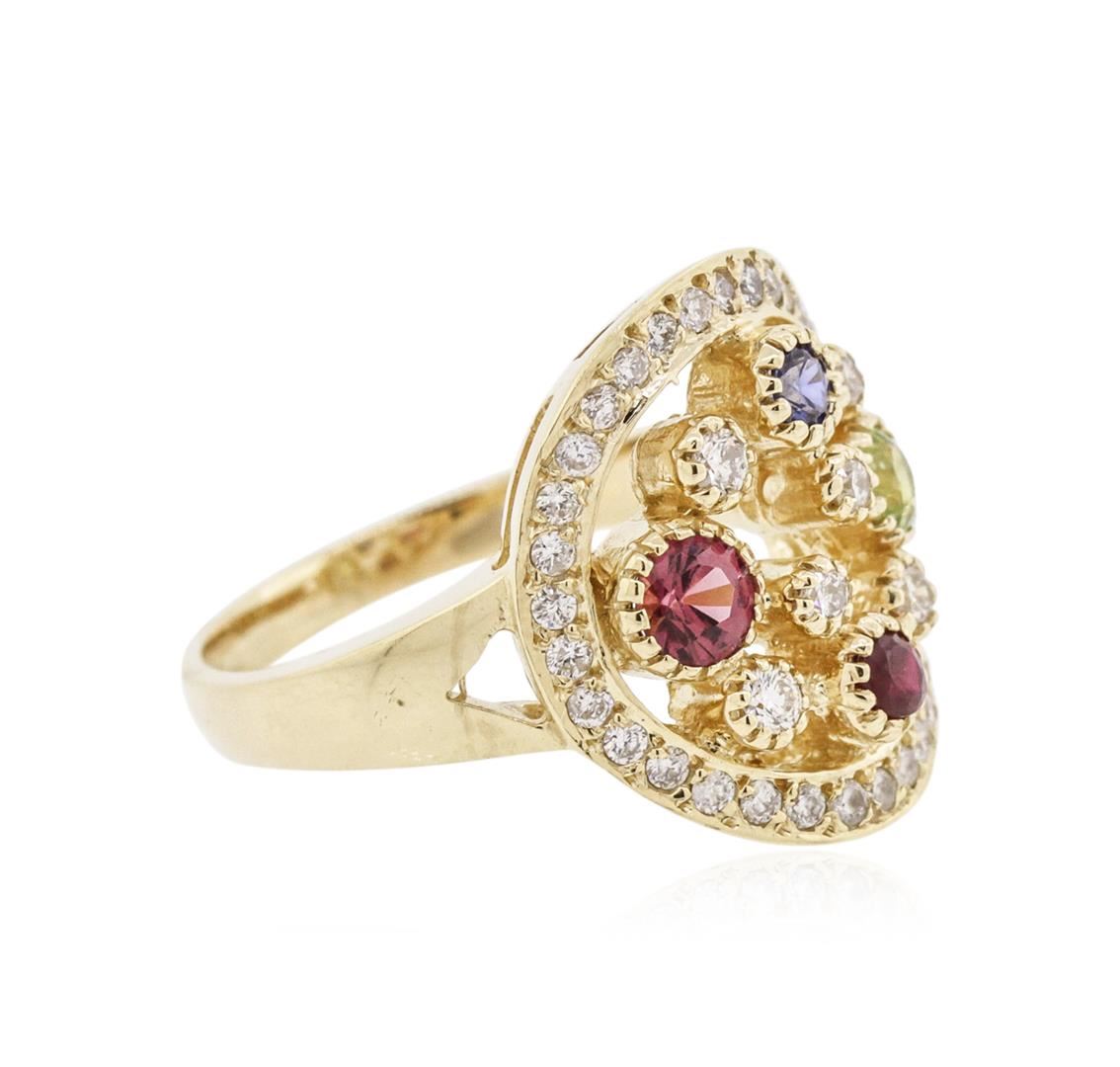 One electronically tested 14KT yellow gold ladies cast multi gemstone and diamond ring with a bright polish finish. The ring features an organized multi gemstone and diamond cluster set within a diamond bezel, completed by a two millimeter wide band. Identified with markings of "K14". Condition is new, good workmanship. Containing: One bezel set round brilliant cut natural almandite garnet, measuring 4.20 - 4.10 x 2.40 mm, approximate weight of 0.34ct., clarity is slightly included, type II, dark, very slightly brownish, strongly purplish red color, (GIA stpR 7/3), cut is good. Transmitting light with a minimum of distortion, transparent. Naturally occurring internal & external characteristics are present. Graded in the setting. One bezel set round brilliant cut natural peridot, measuring 3.60 - 3.50 x 2.25 mm, approximate weight of 0.19ct., clarity is eye clean, type II, medium dark, moderately strong, yellowish green color, (GIA yG 6/4), cut is good. Transmitting light with no distortion, transparent. Graded in the setting. Two bezel set round brilliant cut natural sapphire and rubies, measuring 2.80 - 2.70 x 1.79 mm, approximate total weight of 0.22ct., clarity is slightly included, cut is good. Transmitting light with a minimum of distortion, transparent. Naturally occurring internal & external characteristics are present. Graded in the setting. Forty prong and channel set round brilliant cut diamonds, measuring 1.80 - 1.60 x 1.02mm (depth est.) approximate total weight of 40 Stones = 0.81ct. Graded in the setting. Clarity: SI-1 to I-1. Color: G - I. Total Weight of Colored Stones 0.75ct. Total Weight of Diamonds 0.81ct. Total Weight of Ring 6.88 grams. AIG Appraised at $3,510.00.