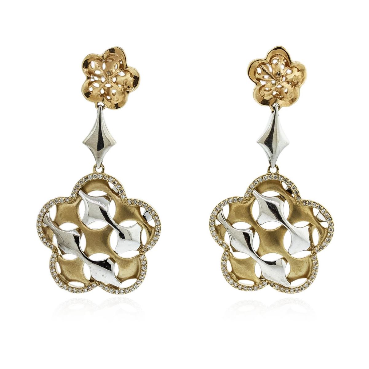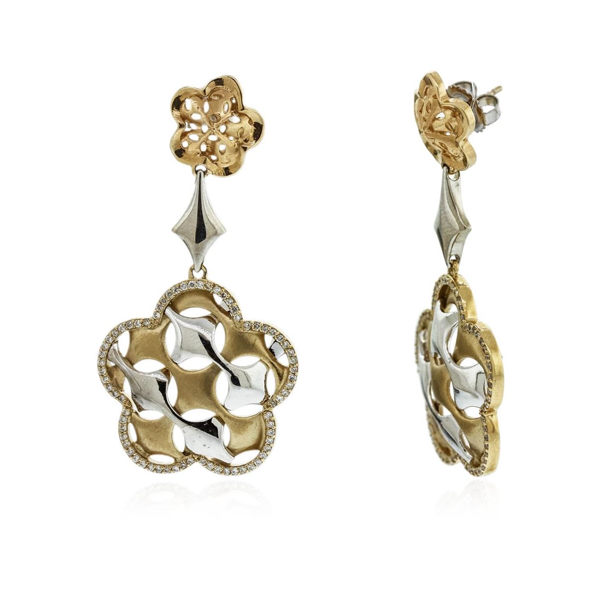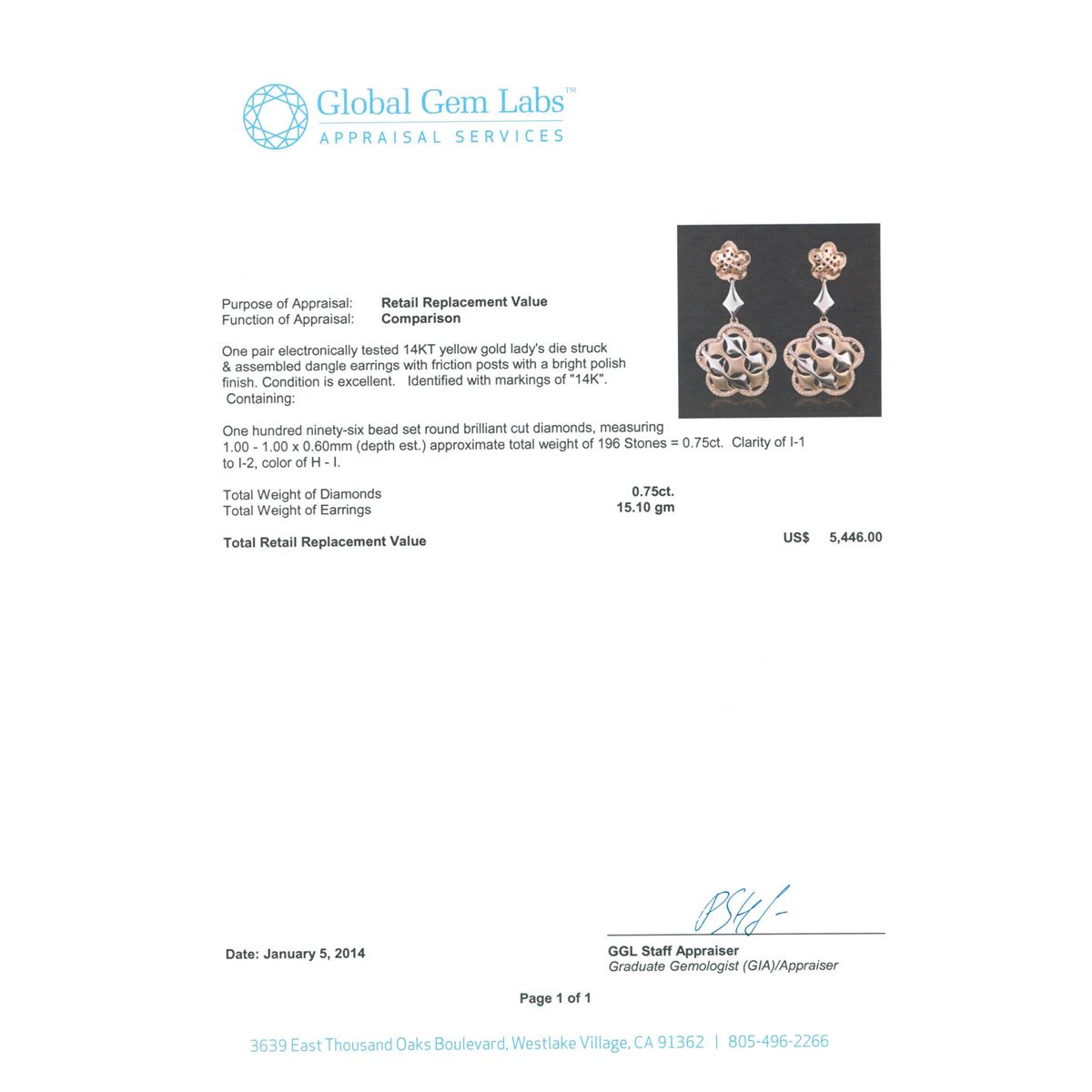 One pair electronically tested 14KT yellow gold Ladies die struck & assembled dangle earrings with friction posts with a bright polish finish. Identified with markings of "14K". Condition is excellent. Containing: One Hundred Ninety-Six bead set round brilliant cut diamonds, measuring 1.00 - 1.00 x 0.60mm (depth est.) approximate total weight of 196 Stones = 0.75ct. Clarity of I-1 to I-2, Color of H - I. Total Weight of Diamonds 0.75ct. Total Weight of Earrings 15.10gm. GGL Appraised at $5,446.00.