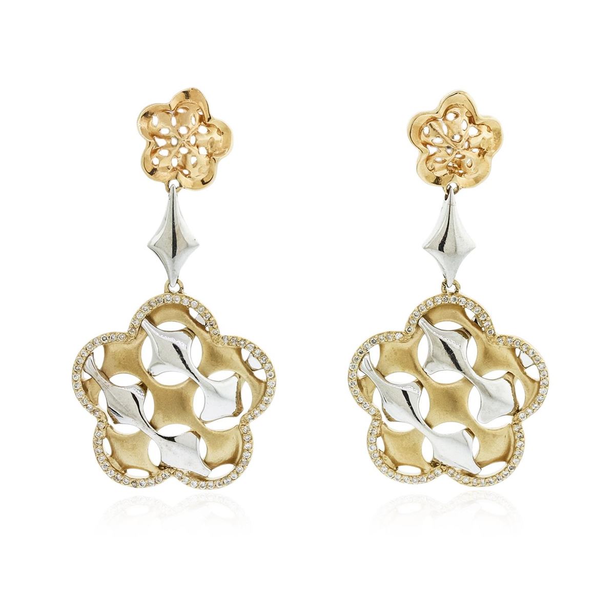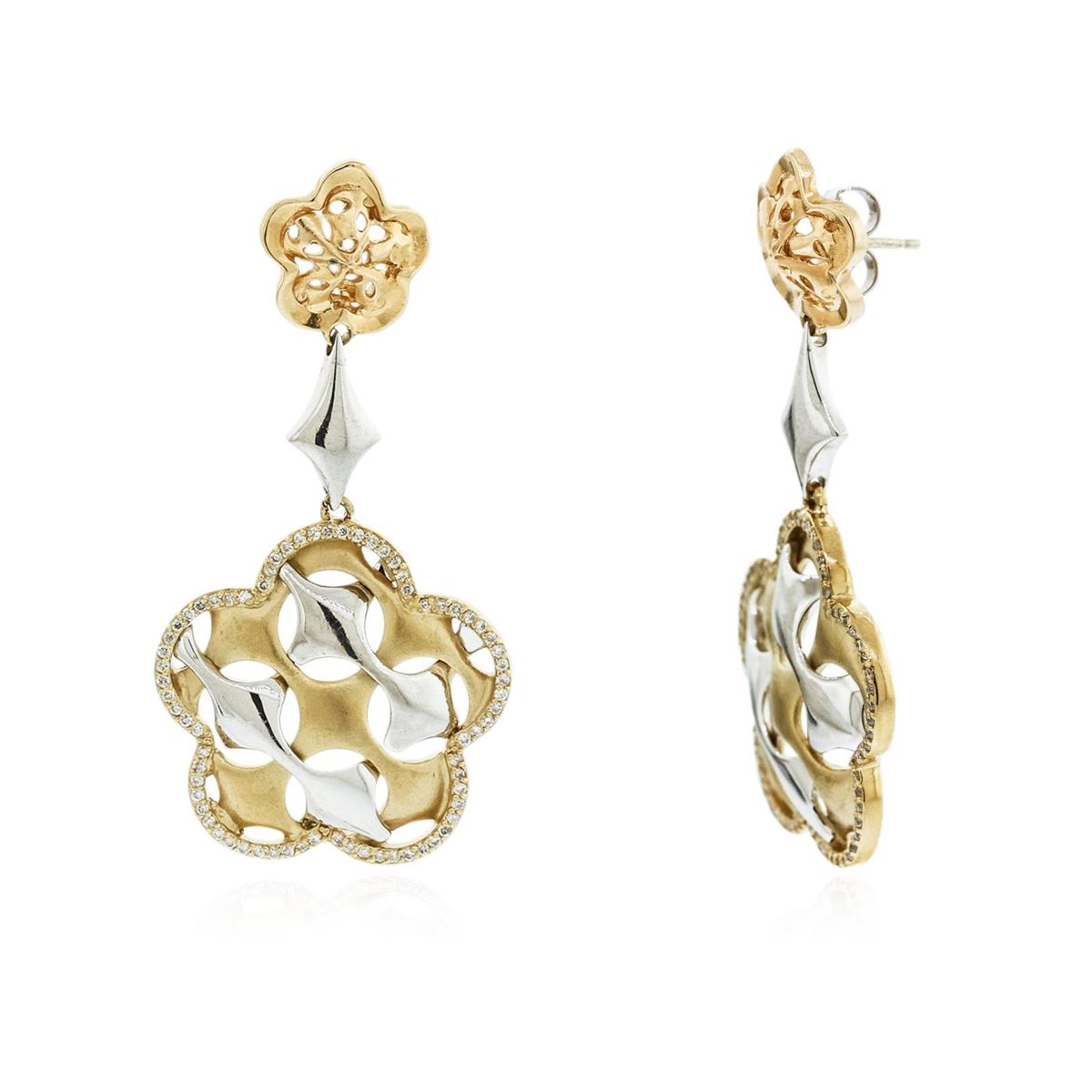 One pair electronically tested 14KT yellow gold Ladies die struck & assembled dangle earrings with friction posts with a bright polish finish. Identified with markings of "14K". Condition is excellent. Containing: One Hundred Ninety-Six bead set round brilliant cut diamonds, measuring 1.00 - 1.00 x 0.60mm (depth est.) approximate total weight of 196 Stones = 0.75ct. Clarity of I-1 to I-2, Color of H - I. Total Weight of Diamonds 0.75ct. Total Weight of Earrings 15.10gm. GGL Appraised at $5,446.00.