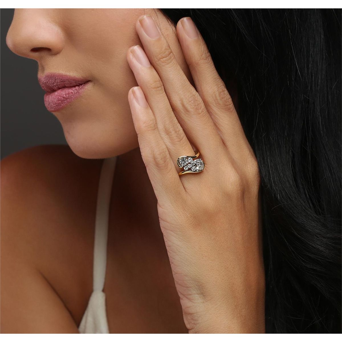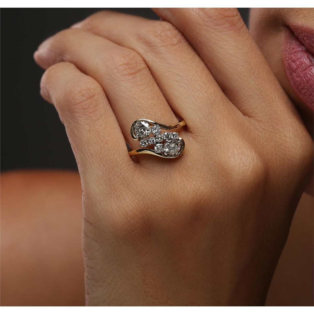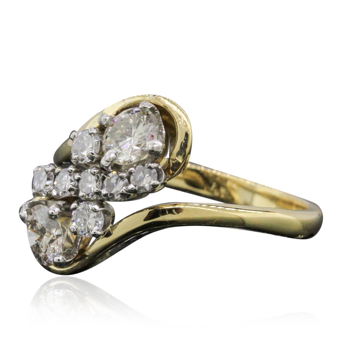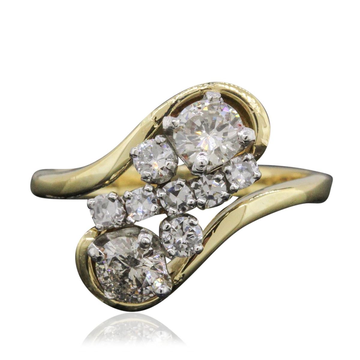 One electronically tested 14KT yellow gold ladies combination cast & assembled diamond ring with a flat shank with a bright polish finish. Identified with markings of "14K". Condition is very good. Containing: Two prong set round brilliant cut diamonds, measuring 4.20 - 4.20 x 2.52mm (depth est.) approximate total weight of 2 Stones = 0.54ct. Clarity: SI-1 to I-1. Color: J - K, Cut is Good. Two prong set round brilliant cut diamonds, measuring 2.50 - 2.50 x 1.50mm (depth est.) approximate total weight of 2 Stones = 0.11ct. Clarity: SI-1. Color: J, Cut is Good. Five prong set single cut diamonds, measuring 1.80 - 1.80 x 1.08mm (depth est.) approximate total weight of 5 Stones = 0.11ct. Clarity: SI-1. Color: J, Cut is Good. All diamonds are graded in the mounting, unless otherwise stated. Total Weight of Diamonds 0.76ct. Total Weight of Ring 5.60 grams. GGL Appraised at $4,155.00.