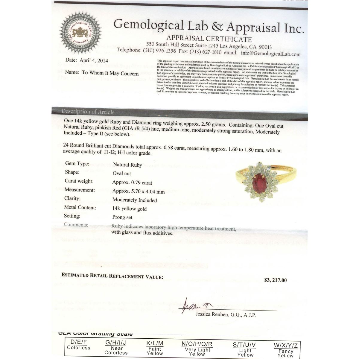 One 14KT yellow gold Ruby and Diamond ring weighing approx. 2.50 grams. Containing: One Oval cut Natural Ruby, pinkish Red (GIA rR 5/4) hue, medium tone, moderately strong saturation, Moderately Included - Type II (see below). 24 Round Brilliant cut Diamonds total approx. 0.58 carat, measuring approx. 1.60 to 1.80 mm, with an average quality of I1-I2; H-1 color grade. Gem type: natural ruby. Shape: oval cut. Carat weight: approx. 0.79 carat. Measurement: approx. 5.70 x 4.04 mm. Clarity: moderately included. Metal content: 14KT yellow gold. Setting: prong set. Comments: ruby indicates laboratory high temperature heat treatment, with glass and flux additives. GLA Appraised at $3,217.00.