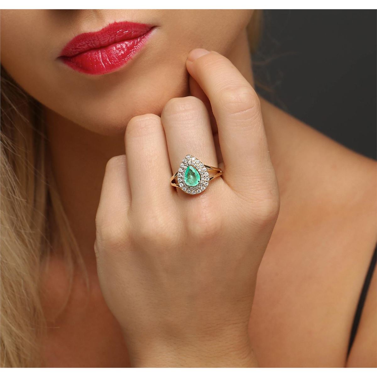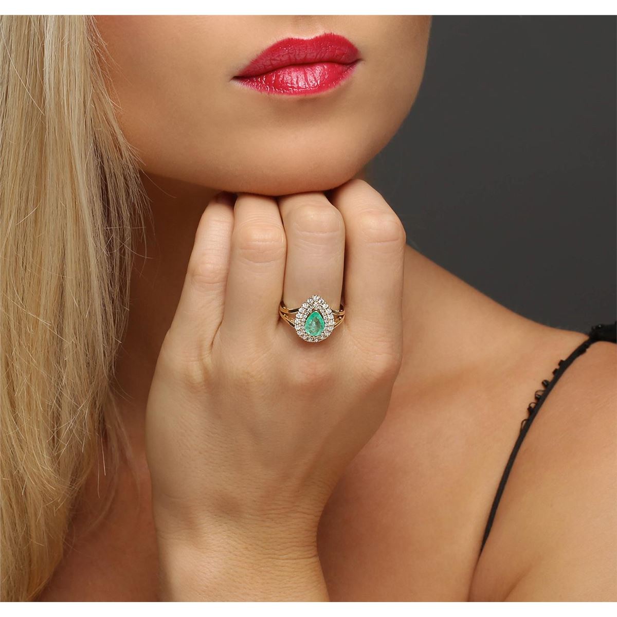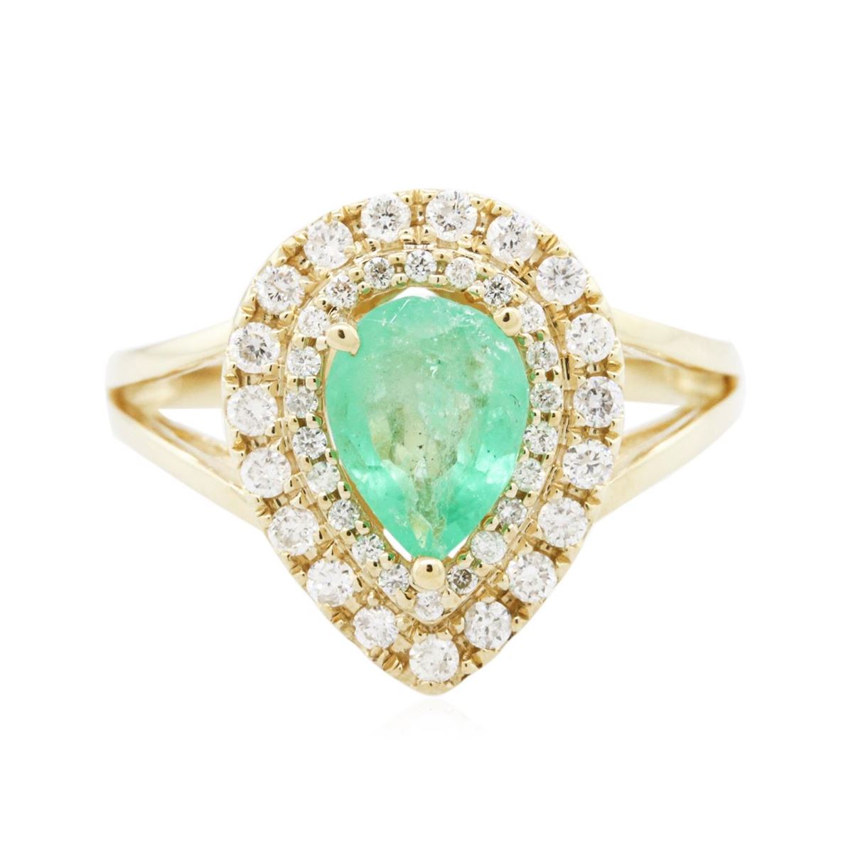 One electronically tested 14KT yellow gold ladies cast emerald and diamond ring with a bright polish finish. The featured emerald is set within a two tiered diamond bezel supported by split shoulders, completed by a two and one-half millimeter wide band. Identified with markings of "14K". Condition is new, good workmanship. Containing: One prong set pear mixed cut natural emerald, measuring 8.50 x 6.30 x 2.55mm, 8% bulge factor, approximate weight of 0.80ct., clarity is heavily included, type III, medium, very slightly grayish, very slightly bluish green color, (GIA vslbG 5/3), cut is good. Transmitting light with a minimum of distortion, transparent. Naturally occurring internal & external characteristics are present. Indications of oil residue. Graded in the setting. Nineteen prong set round brilliant cut diamonds, measuring 1.80 - 1.70 x 1.05mm (depth est.) approximate total weight of 19 Stones = 0.47ct. Graded in the setting. Clarity: SI-2 to I-1. Color: G - I Twenty-Two prong set round brilliant cut diamonds, measuring 1.20 - 1.10 x 0.69mm (depth est.) approximate total weight of 22 Stones = 0.22ct. Graded in the setting. Clarity: SI-1 to I-1. Color: G - I. Total Weight of Colored Stones 0.80ct. Total Weight of Diamonds 0.69ct. Total Weight of Ring 4.68 grams. AIG Appraised at $3,945.00.